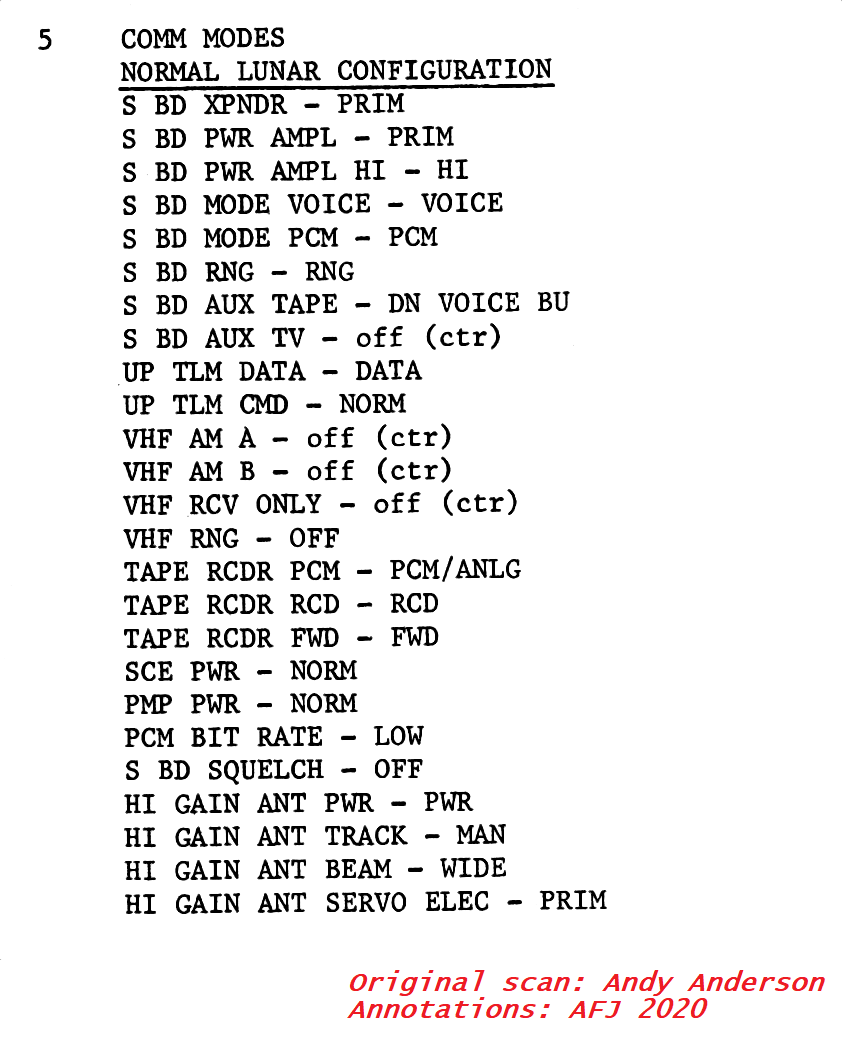 PCM; Ranging; Downvoice Backup, Tape, Off; Data, Normal. VHF, off, off; VHF, Receive Only, Off; VHF Ranging, Off;