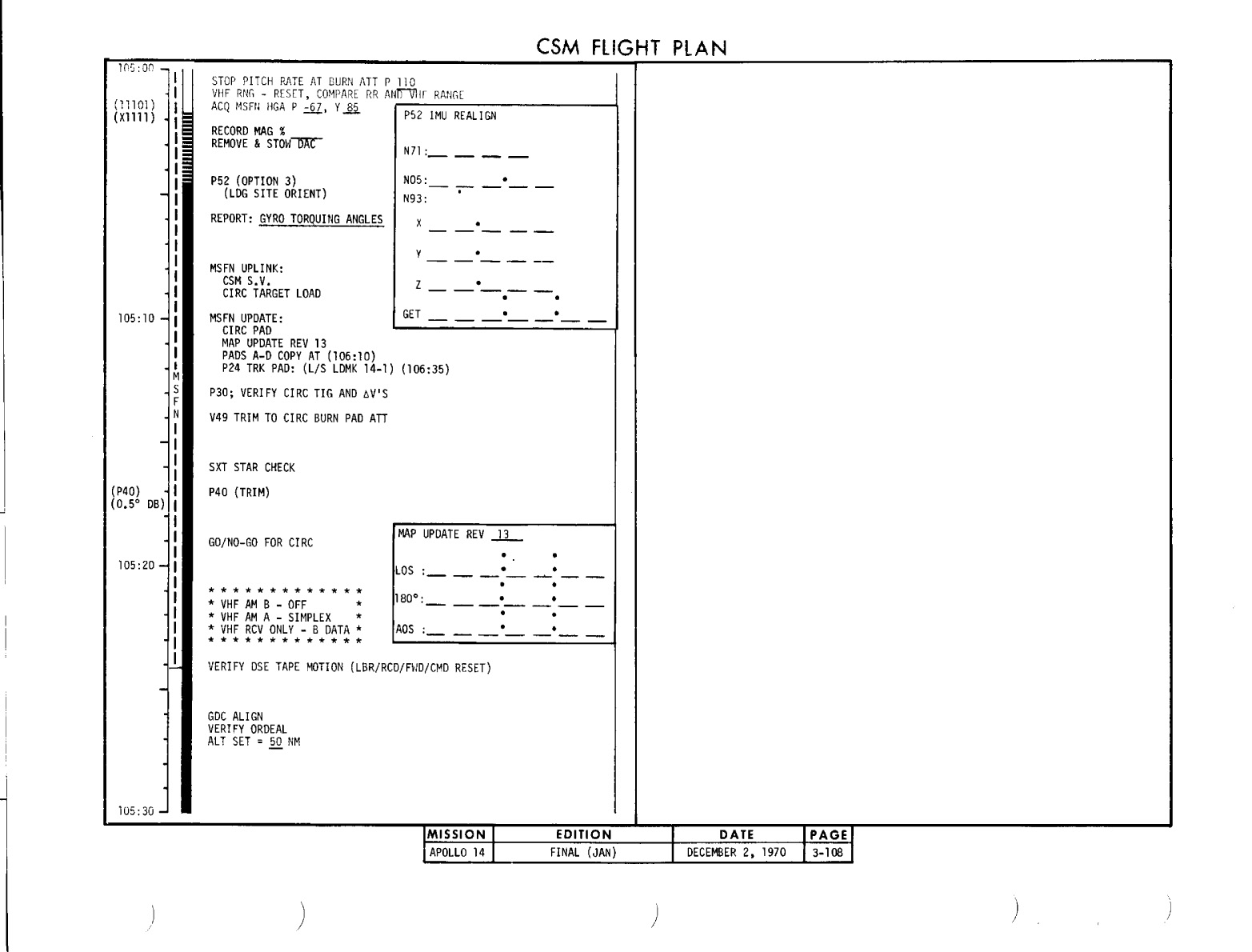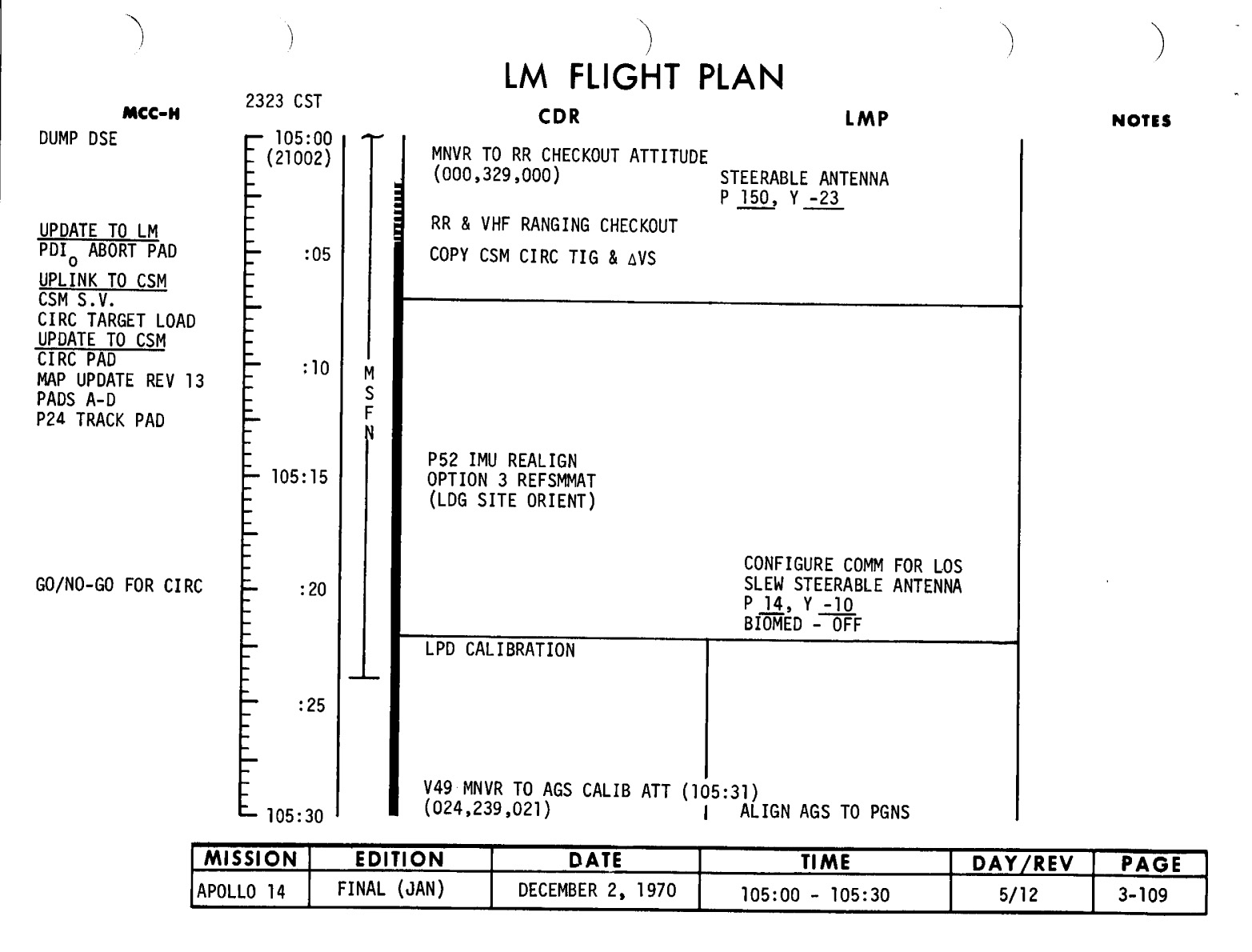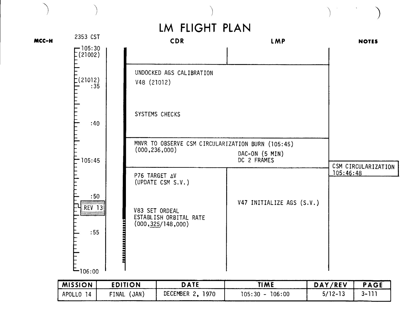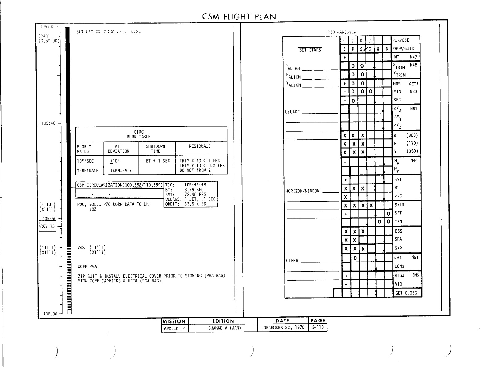 105:16:01 Roosa: Okay, Fred. Copy Circ, SPS/G&N; 36l16; minus 0.81, plus 0.19; 105:51:48.11; plus 0070.2, all zips, minus 0029.6; 000, 130, 359; 0063.3, plus 0055.5; 0076.2, 0:04, 0062.9. Understand no sextant star; Sirius and Rigel; 127, 148, 015; two jets, 16 seconds, quads B and D.