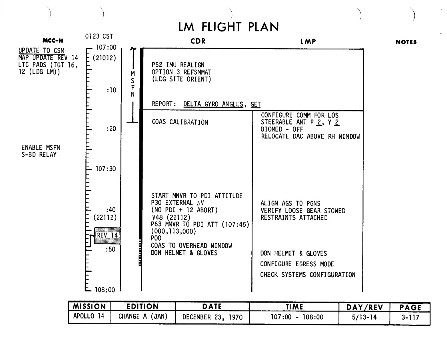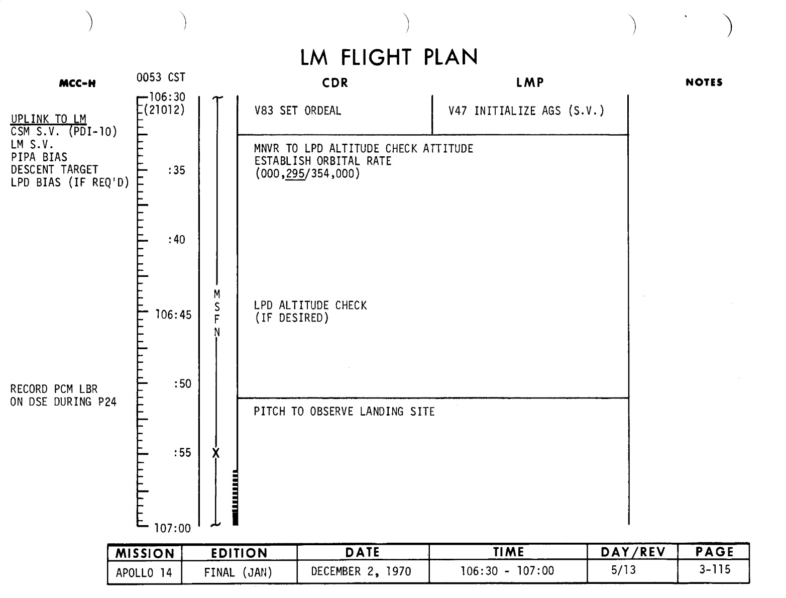 105:14:11 Haise: Kitty Hawk, Houston. We'd like P00 and Accept, and I got some PADs ready for your Circ.