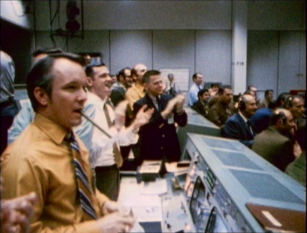 Mission Control celebrates with the cigars. Front: Gerry Griffin. Milton Windler is behind Griffin (turned to the other side.) Glynn Lunney and M.P. Frank applaud. Chief of the Astronaut Office Tom Stafford, Director of Flight Crew Operations Deke Slayton and CapCom, astronaut Ron Evans are visible on the next row.
