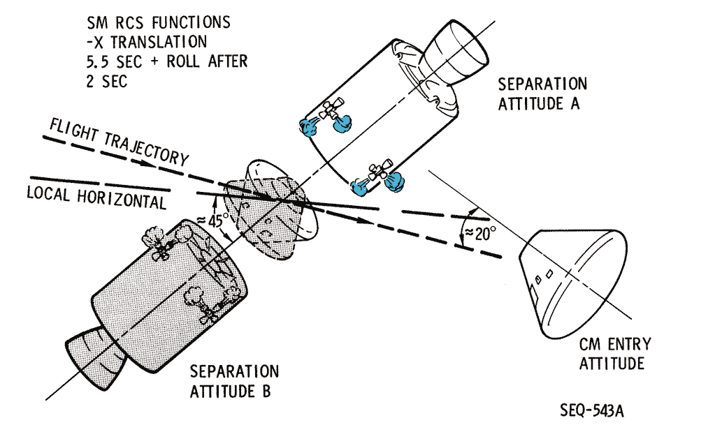 This is Apollo Control at 216 hours 5 minutes, we're getting a bit of noise on the circuit. As the crew maneuvers the spacecraft to the horizon check attitude. Checking the attitude prior to separation of the Service Module, and that about to occur in about 7 minutes. Apollo 14's velocity has now climbed to 24,042 feet per second, and the spacecraft is now 4,393 nautical miles from Earth. 21 minutes 45 seconds now until entry interface with splashdown to come in about 35 minutes 30 seconds. This is Apollo Control at 216 hours 10 minutes we're now coming up on about three minutes to Service Module separation. Spacecraft velocity is 24,042 feet per second and we'll see that velocity increase by about 12,000 feet per second in the next seventeen minutes. At entry interface we should be reading about 36,170 feet per second, and at entry the spacecraft will be about 1,138 nautical miles from the splashdown point. Guidance officer reports the spacecraft is maneuvering now to the separation attitude, we'll standby for that event, scheduled to occur within the next minute or so. Spacecraft now in separation attitude yawed 45 degrees, from the normal entry attitude. This is to minimize any chance of recontact with the Service Module after separation.