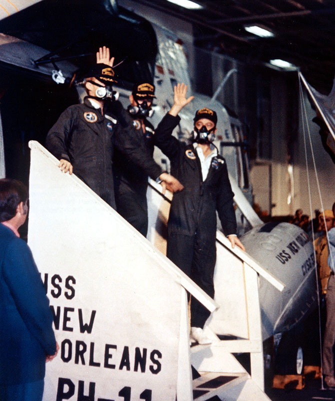 And as the helicopter touched down on the deck we have a delighted crowd in Mission Control here applauding. Shortly the cigars will be lighted up as the crew steps out onto the deck of the recovery ship, the helicopter landing platform NEW ORLEANS.