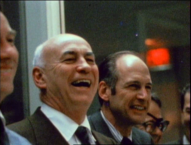 NASA bosses captured in jubilation: Robert Gilruth, Center Director of Manned Spacecraft Center (MSC, Houston); George Low ; Dale Myers, Associate Administrator for Manned Spaceflight.