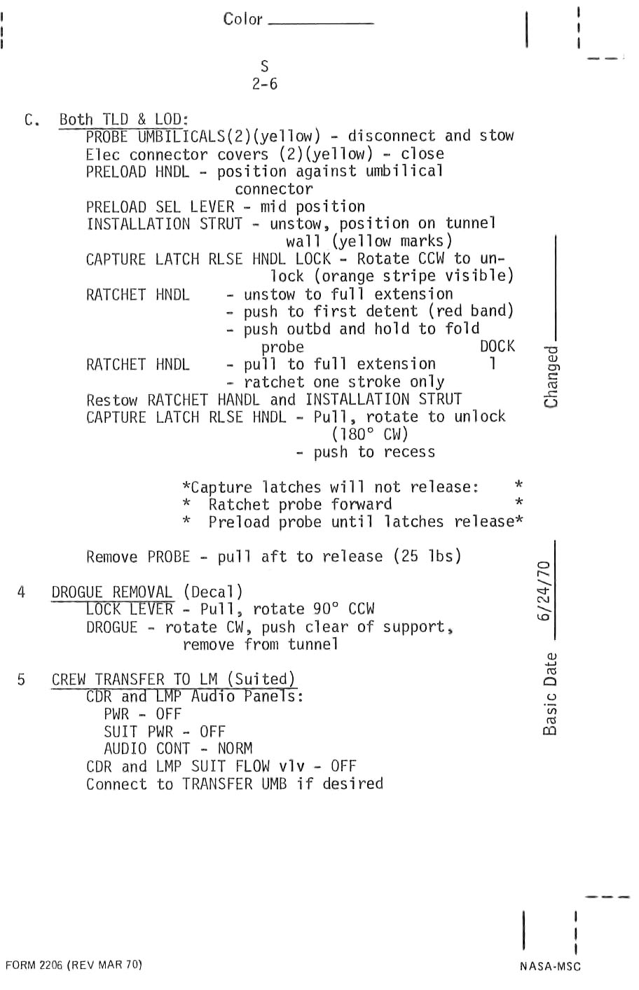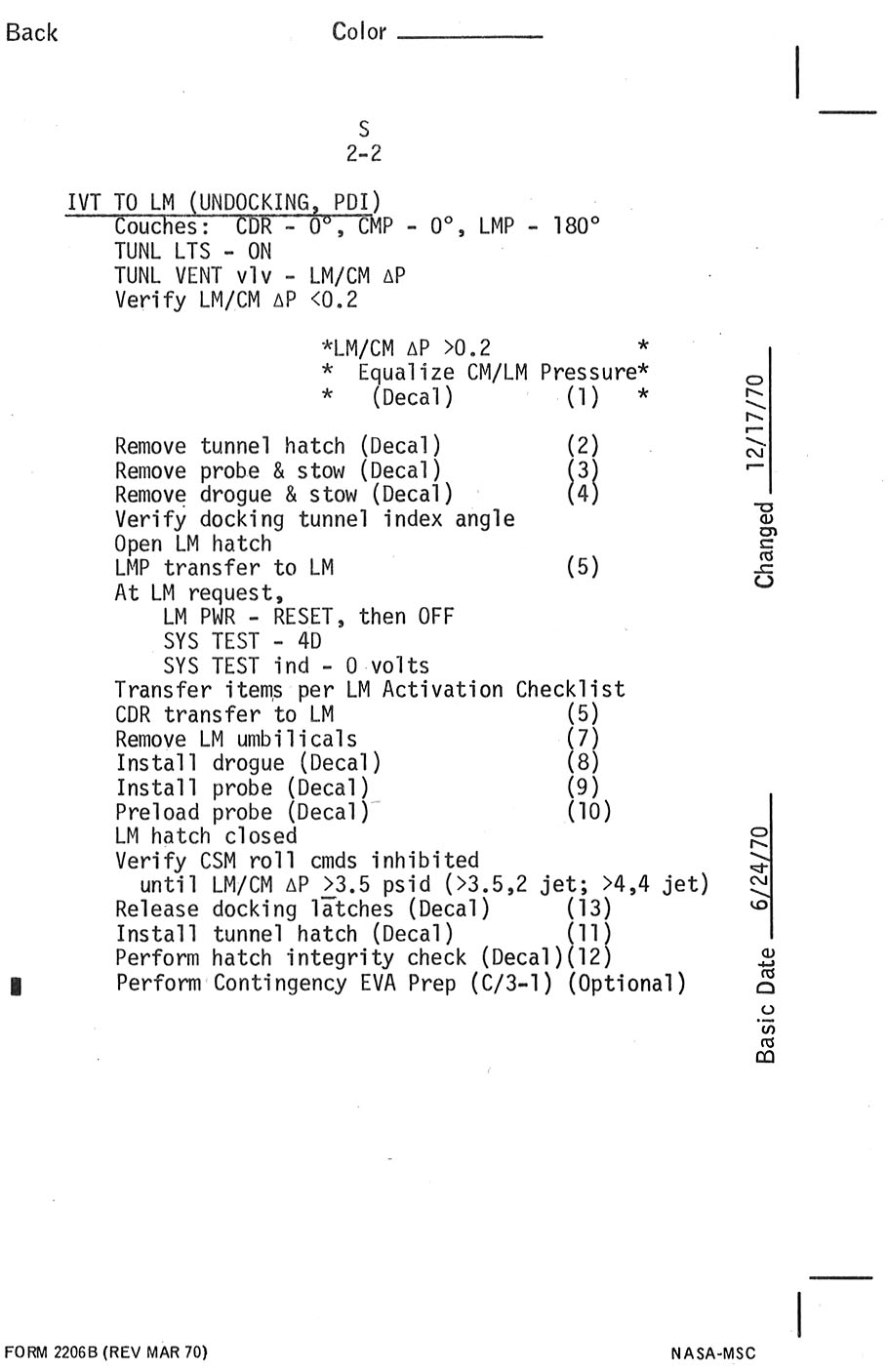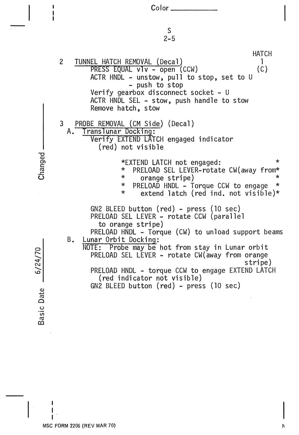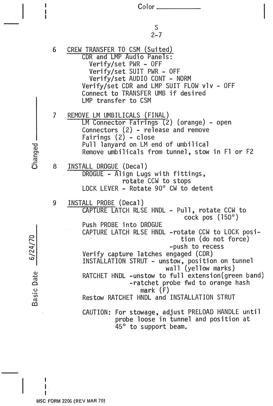 - 2-06 Sub-checklist - Probe removal (continued), Drogue removal, Crew transfer to LM (suited)