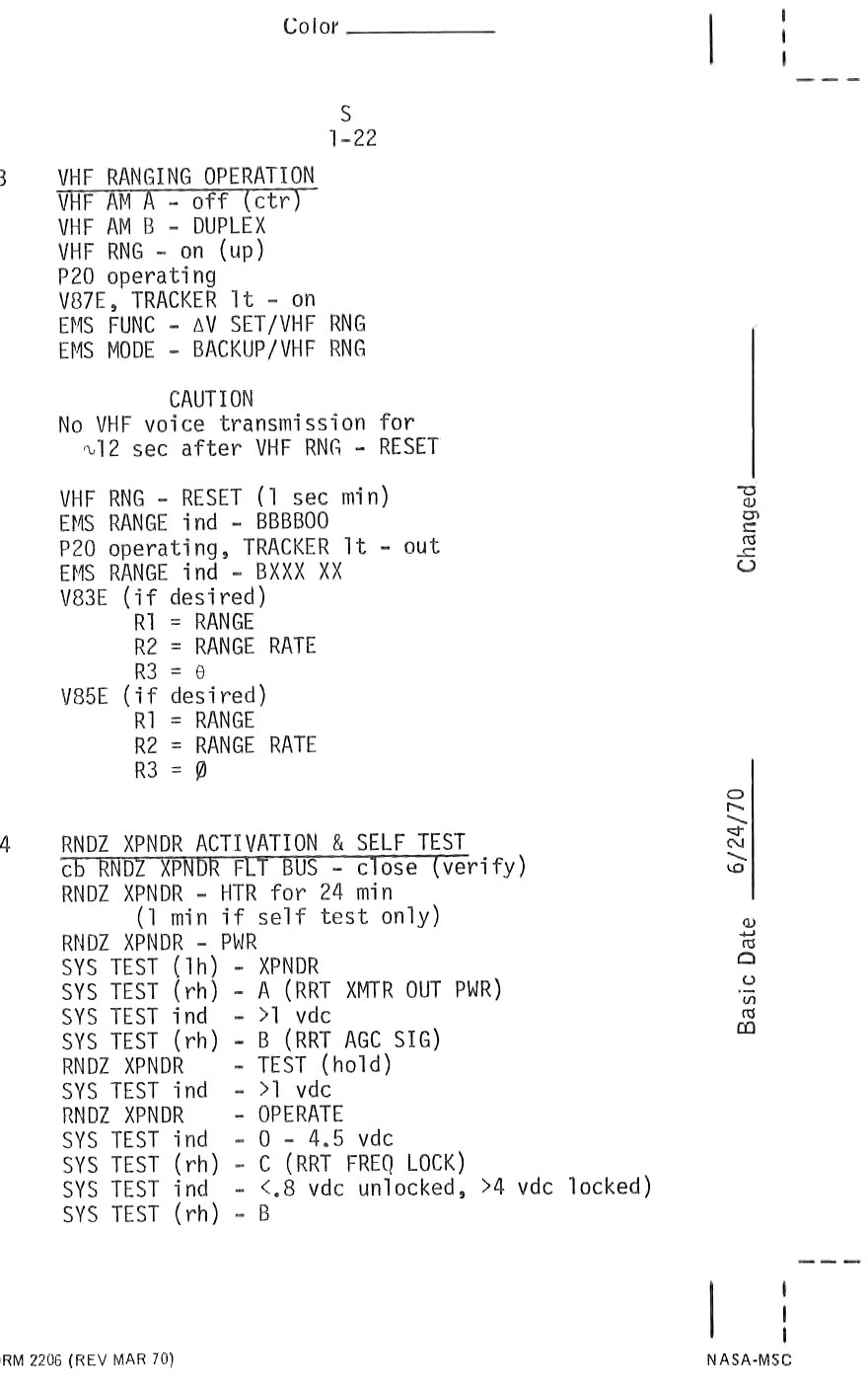 - 1-22 Telecomm - VHF ranging operation, Rendezvous transponder activation & self test