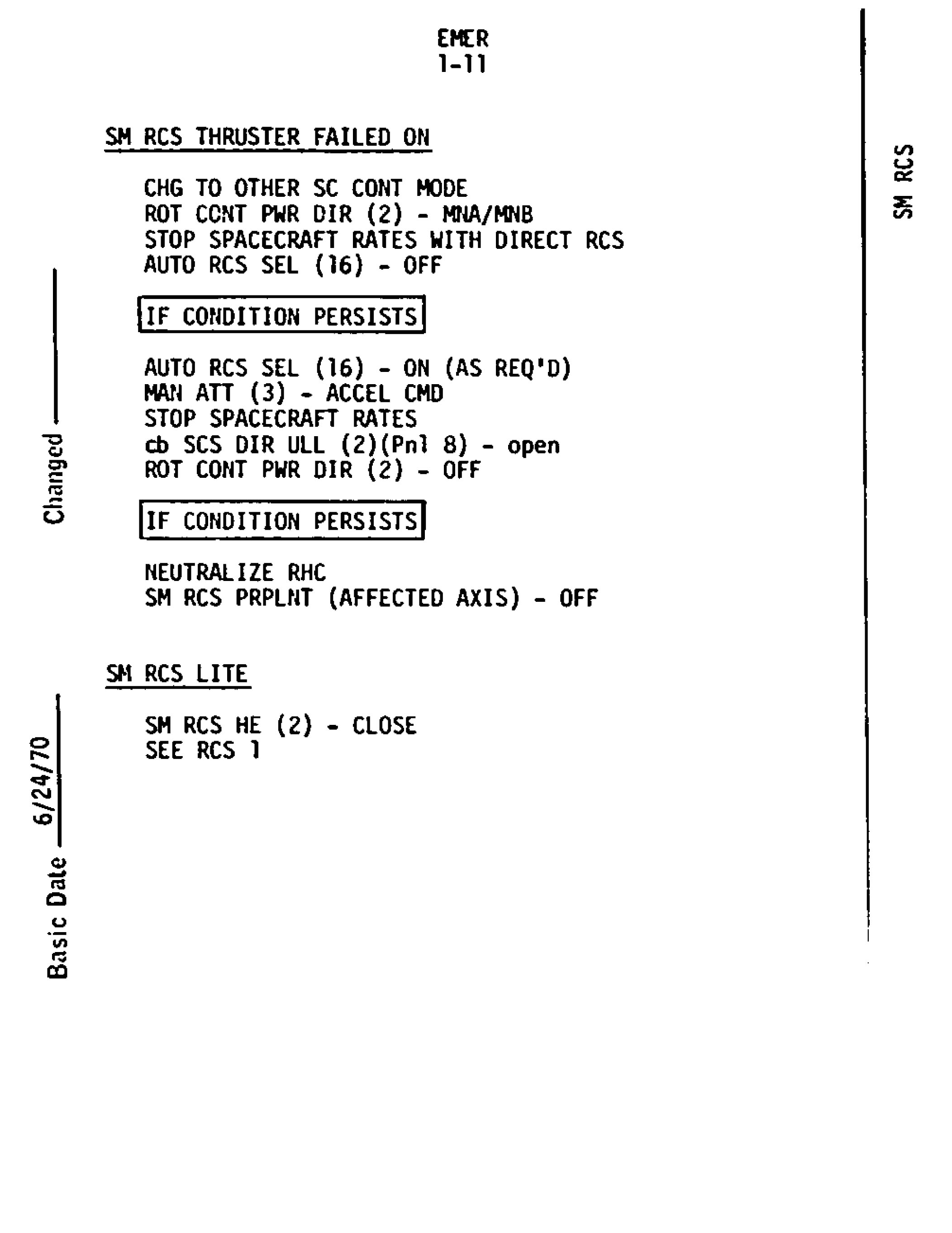 - emer1-11 SM RCS Thruster failed On, SM RCS light