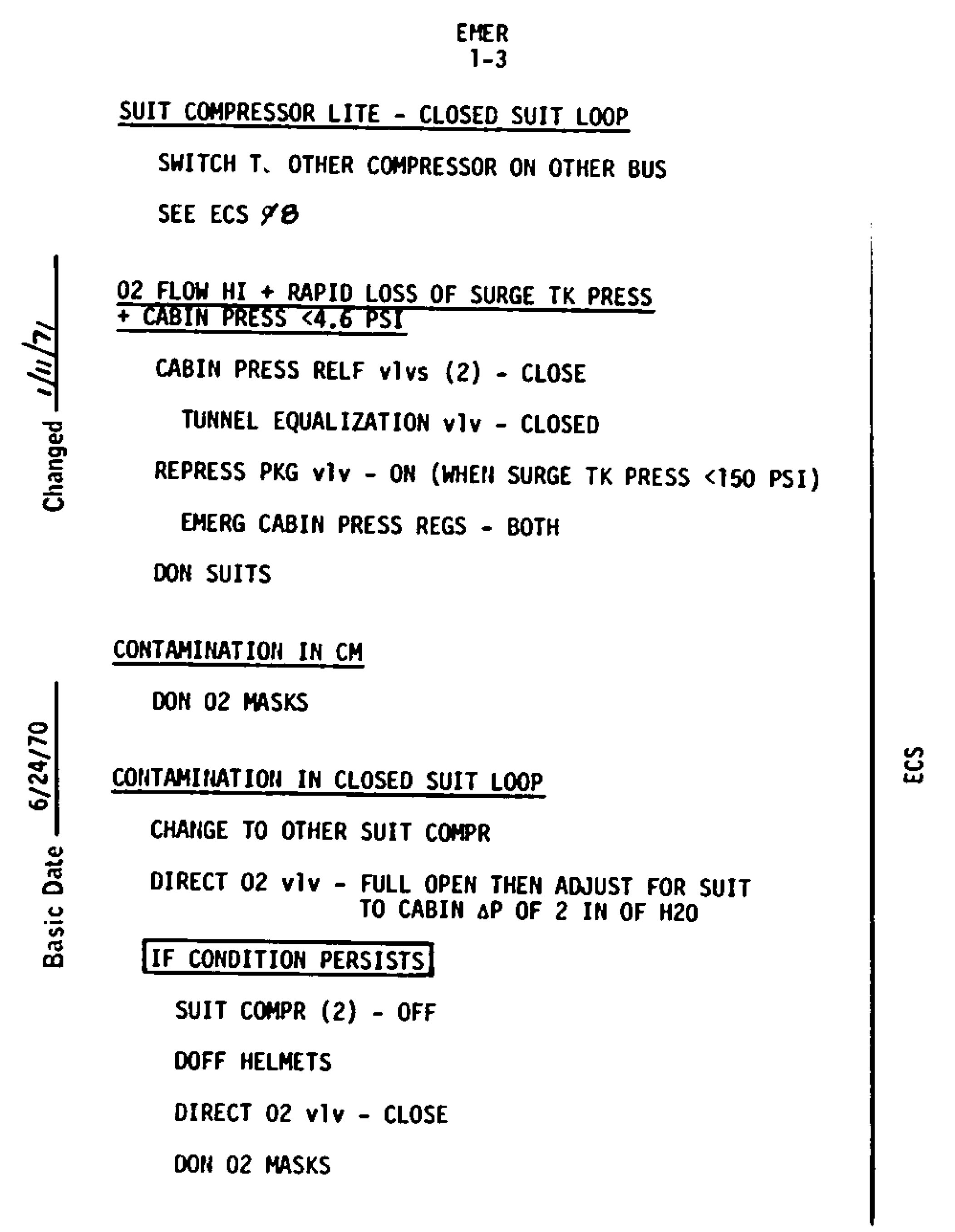 - emer1-03 Suit compressor light, O2 flow high & rapid loss of surge tank pressure, Contamination in CM, Contamination in closed suit loop
