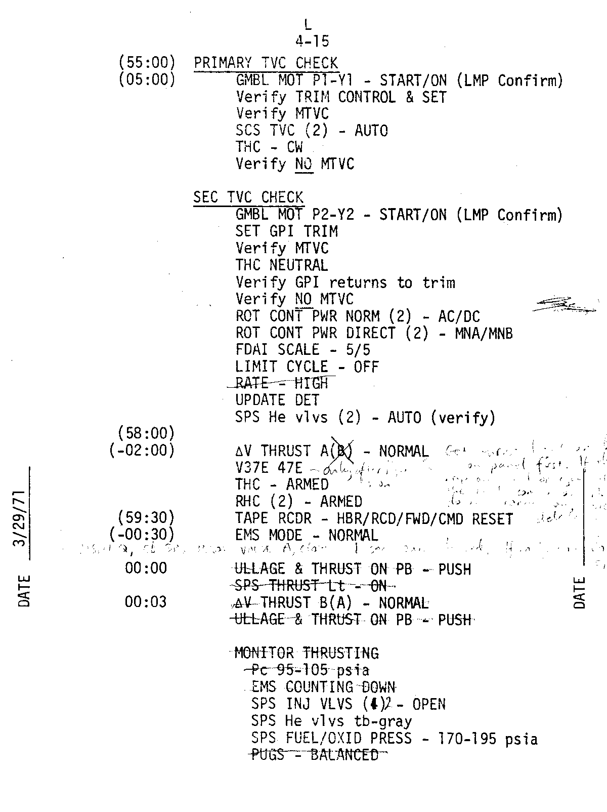 Worden, from the 1971 Technical debrief: "That was superb, I thought. Like you say, the procedures were simple. It was very easy to make changes in the checklist, and the changes that they made were straightforward. It was a pretty straightforward systems problem, I think, at that point. The procedures that they recommended worked well for both the dual bank and single bank. You could just forget part of the procedure. All the burns that I did in lunar orbit, the short [duration] burns, I did on one bank only, so we would avoid any problem with that bank that had the [electrical] short in it. The procedure was almost the same, and it worked out very nicely. The only change was in one extra circuit breaker that was out, the Main A pilot valve, in leaving the normal A Delta-V thrust switch on."