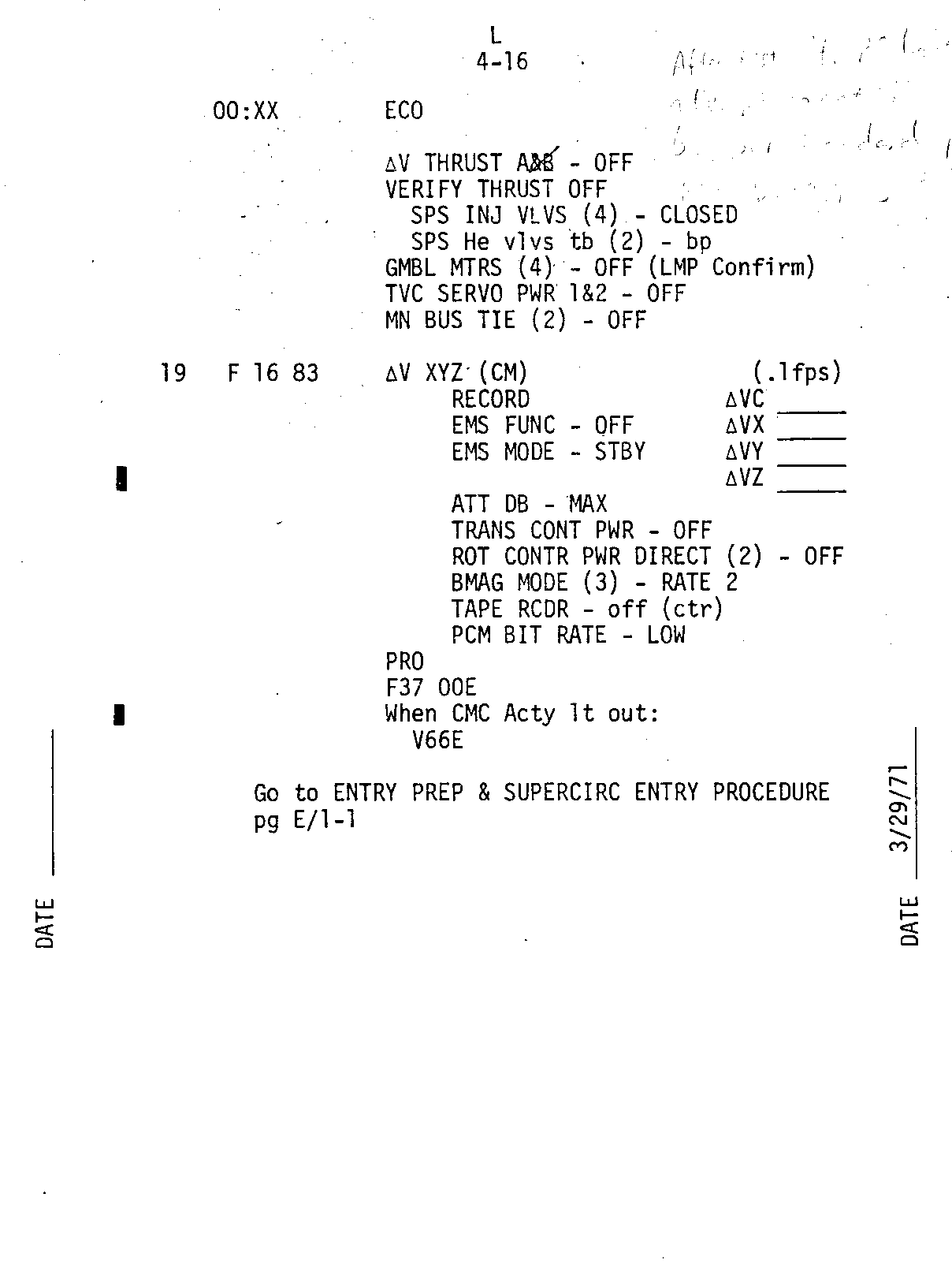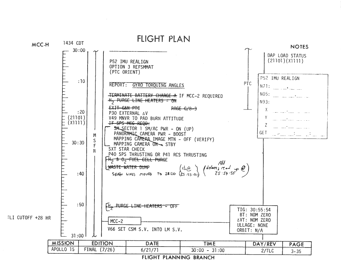 025:53:01 Allen: Okay. We're going - I want you to move seven of the lines from 30:30 to 28:20. And those seven lines are: The SM Sector 1 SM/AC Power, On; Pan Camera Power, Boost; Map Camera Image Motion, Off; Map Camera, On, Standby; H2 and O2 fuel cell purge; waste water dump; and, at 28:35, H2 Purge Line Heaters, Off. [Pause.]