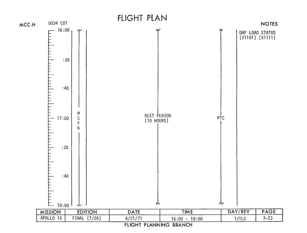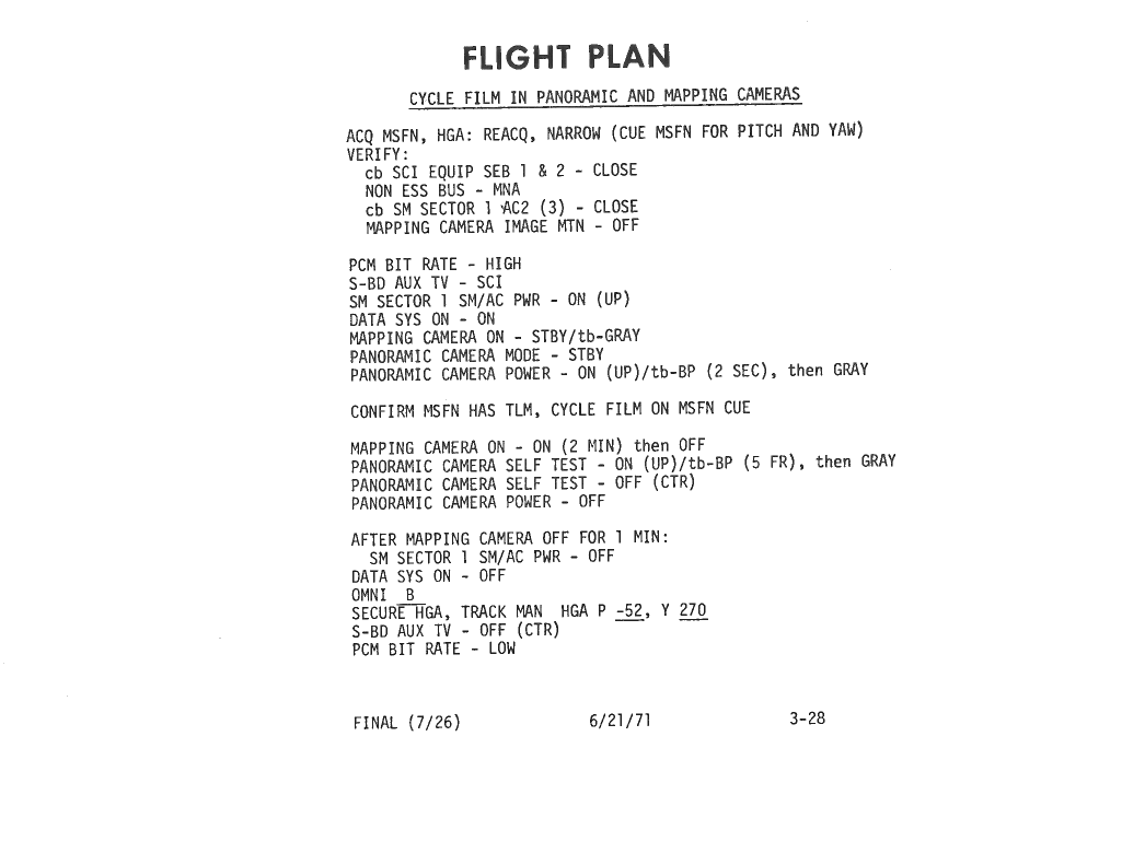 025:52:30 Allen: Okay; 28:20 I'm - going - going to read to you seven lines of instructions here, and they're all reproduced two pages over in your Flight Plan at 30:30. Your choice as to whether you want to copy them or just look two pages ahead. I'll go ahead and read the lines now.