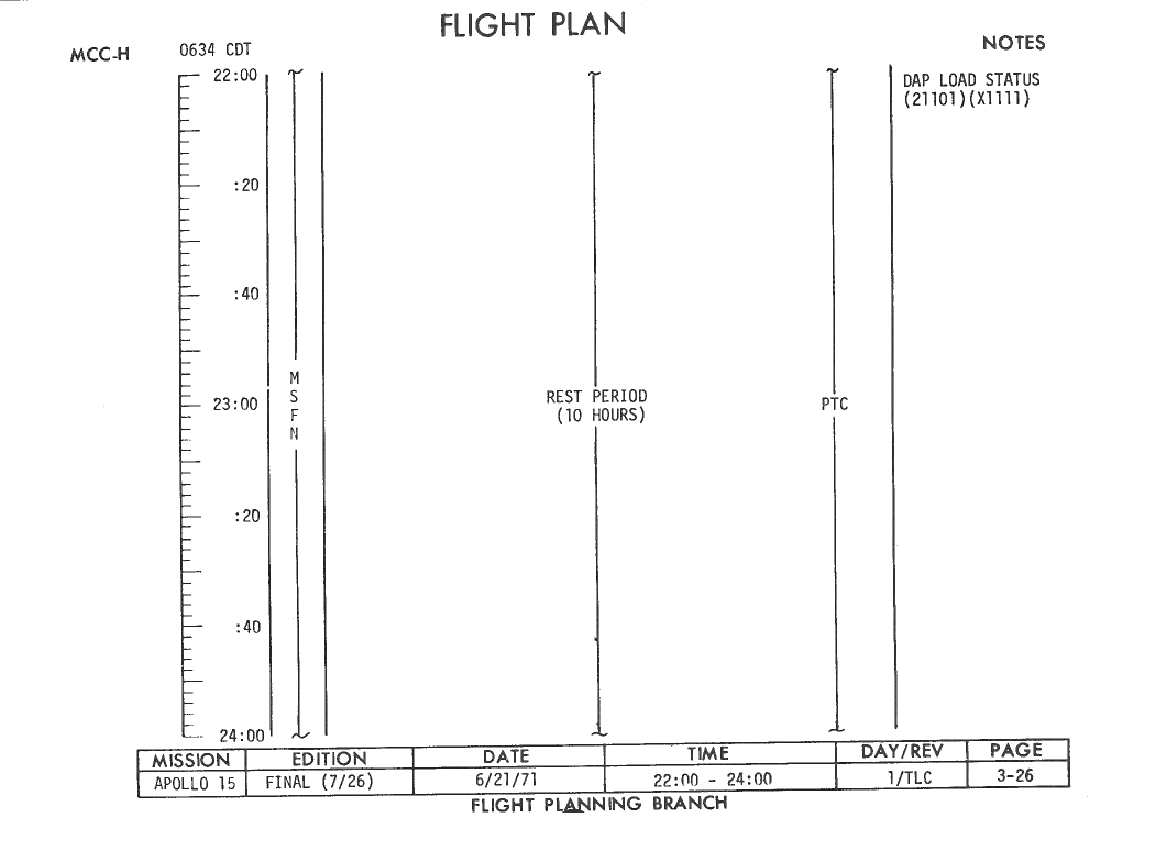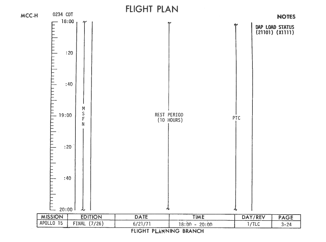 This is Apollo Control at 20 hours, 41 minutes. With Apollo 15 now traveling at a speed of 5,802 feet per second [1,549 m/s] and out to 90,425 nautical miles [167,467 km] from Earth. The crew still sleeping soundly at this time. And we have a clock here in Mission Control that is currently counting down to the time that the crew is scheduled to be awake. That to be now some 4 hours, 18 minutes away. The major activities, once the astronauts awake, will be a midcourse correction opportunity. The second midcourse correction opportunity, which comes at about 30 hours, 56 minutes. And, crew will also enter and make preliminary checks of the Lunar Module, Falcon. In Mission Control, it continues to be a very quiet evening and the major activity [is] centering around preparation of procedures to be used for the midcourse correction, which would most likely occur at the second opportunity; 30 hours, 56 minutes into the flight, and a principal interest there to check out the Service Propulsion System engine. This is Apollo Control, continuing to stand by.