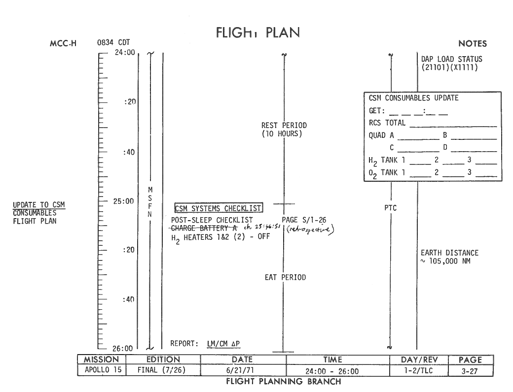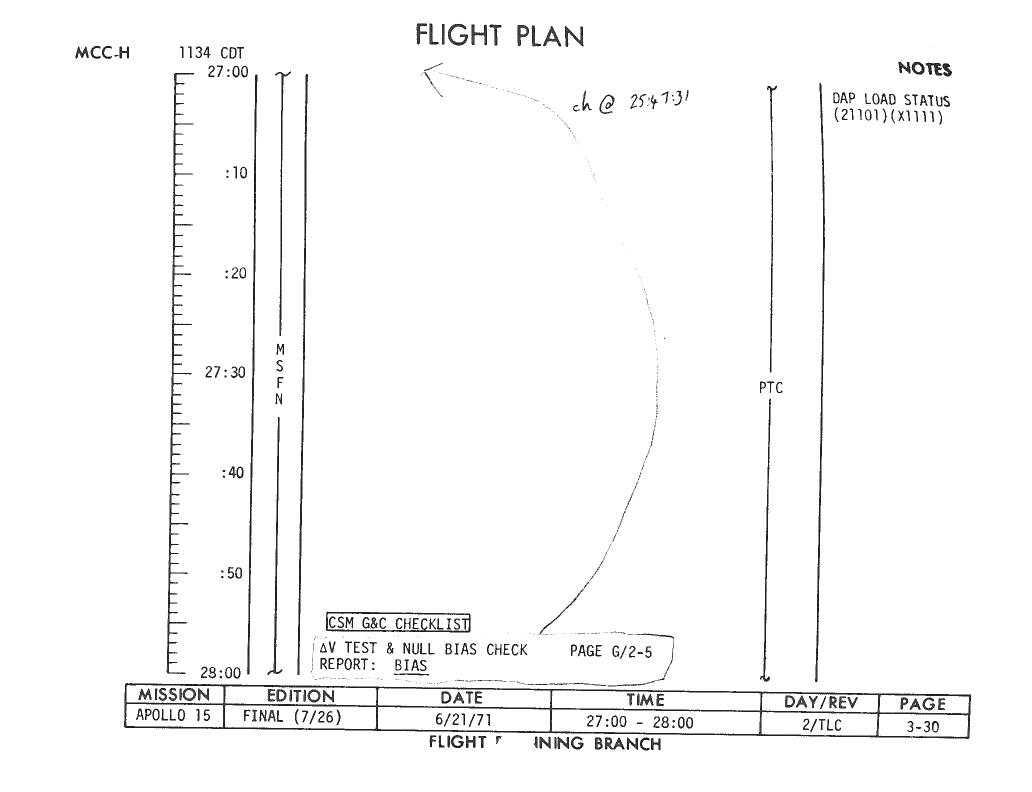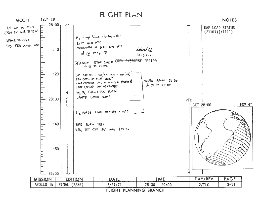 025:47:31 Allen: Okay. Moving to 27:55. [Pause.] Move Delta-V test and null bias check up to 27:00. In other words, just move that line up. And coming up to 28:00 - a little something for you Al - we're going to delete the crew exercise period. [Pause.] And at 28:00, add in midcourse column - MCC-Houston column - uplink to CSM, CSM state vector and Verb 66; update to CSM SPS test maneuver PAD. [Pause.] And at 28:05, [pause] H2 Purge Line Heaters, On; exit G&N PTC; and maneuver to PAD burn attitude. Have you copied so far?