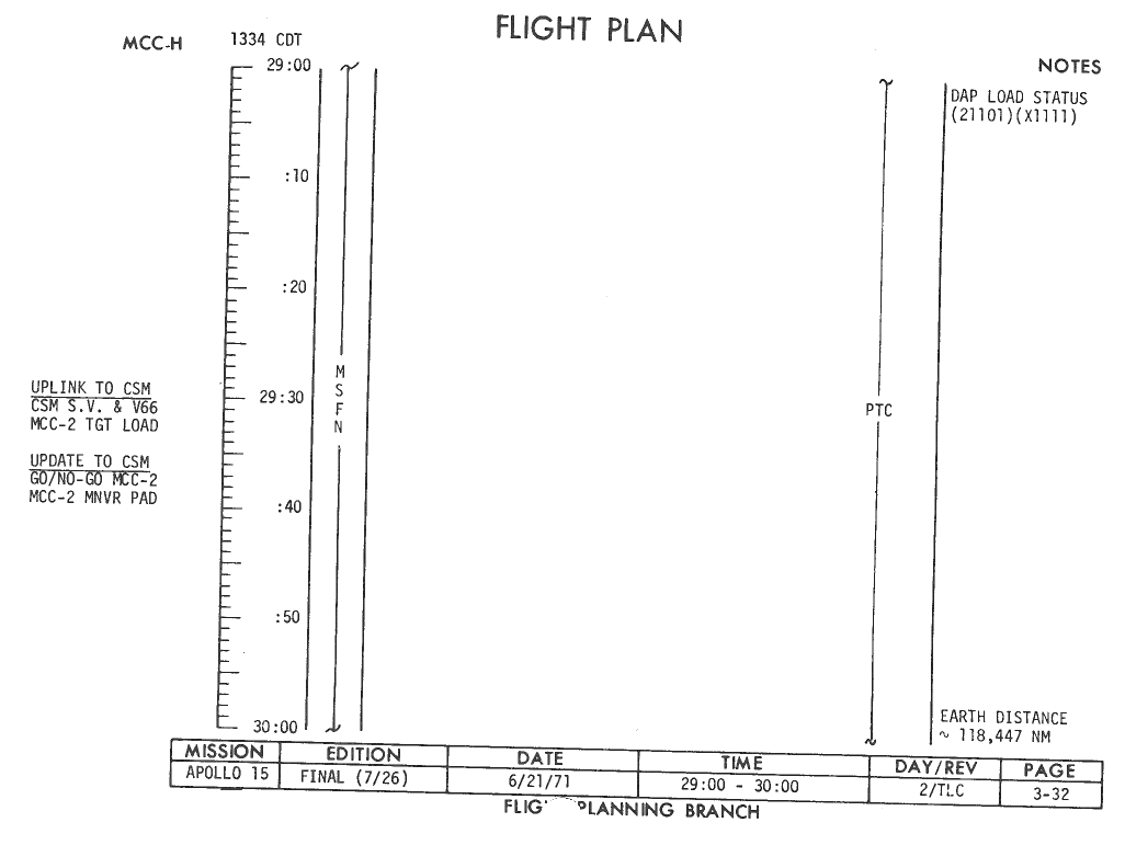 The left-hand side of the Flight Plan has a column labelled 'MCC-H', for Mission Control Center - Houston, which carries details of tasks that Mission Control have to carry out which concern the spacecraft. These are usually notes to remind flight controllers about updates to be sent to the crew. As part of the SPS test, Mission Control are to uplink an accurate state vector to the spacecraft which will also be transferred to the LM. They will also read up a PAD with details of the test burn, including the required attitude. Once the crew have the PAD, they will stop the PTC roll and maneuver the spacecraft to the burn attitude. An additional, but unconnected instruction has also been added to switch on the heaters which warm the line that feeds H2 to purge the fuel cells.