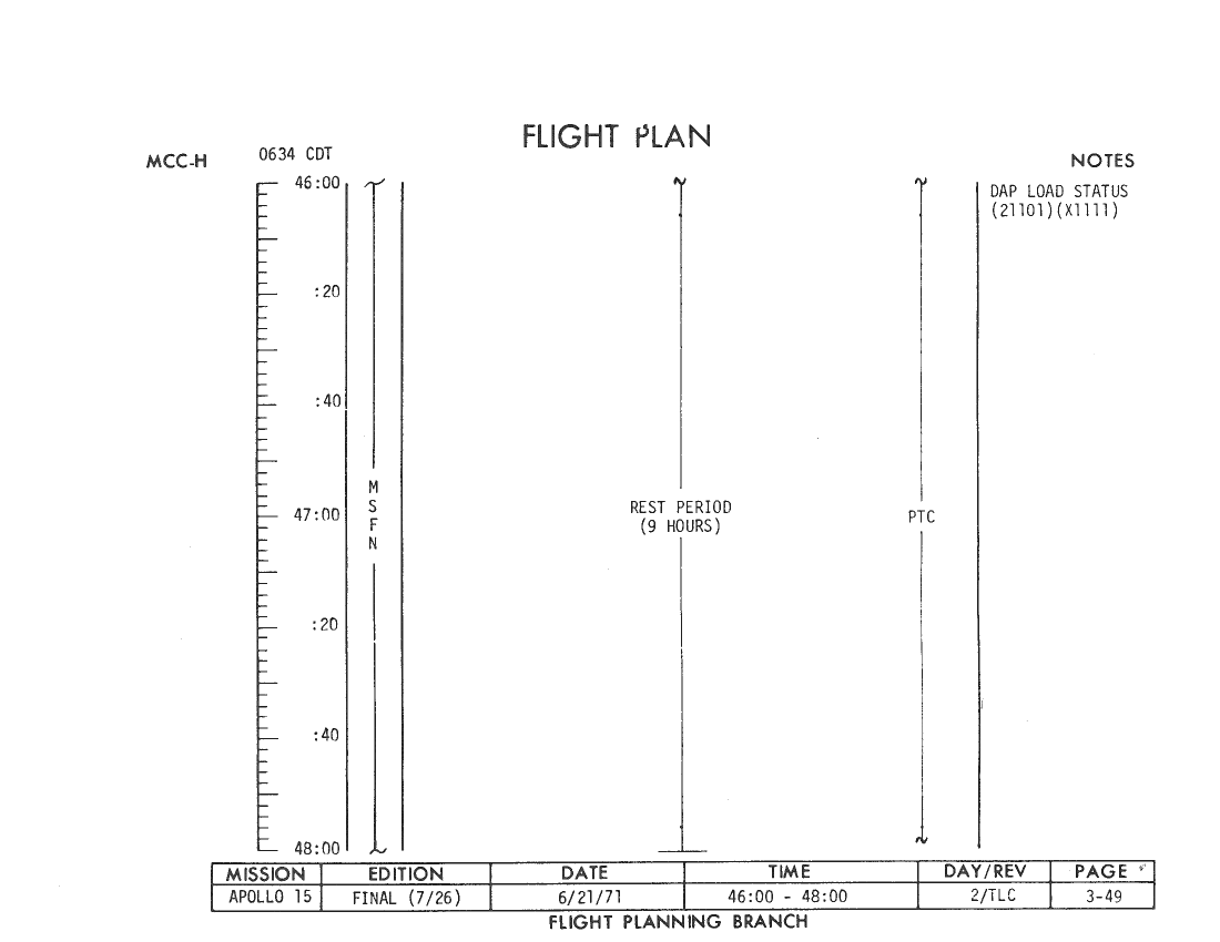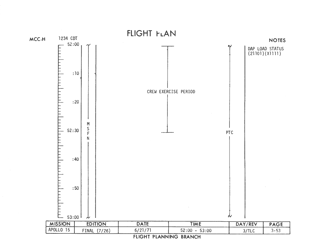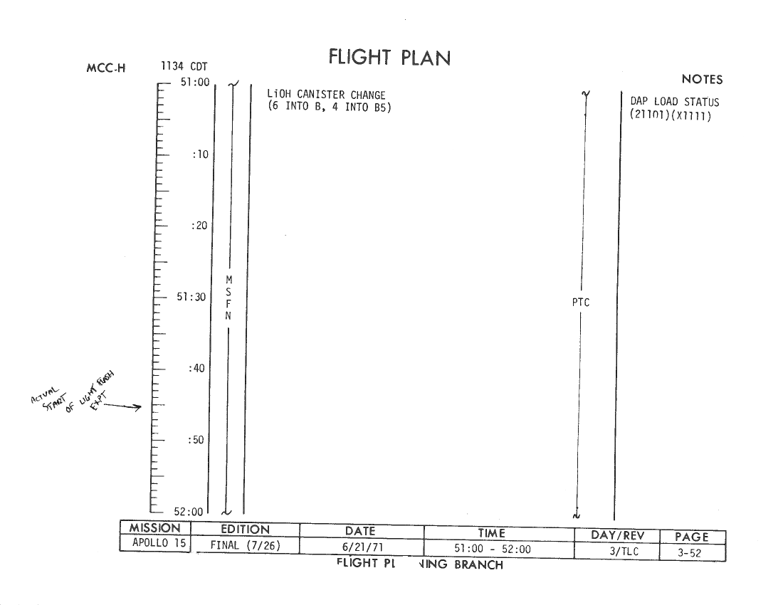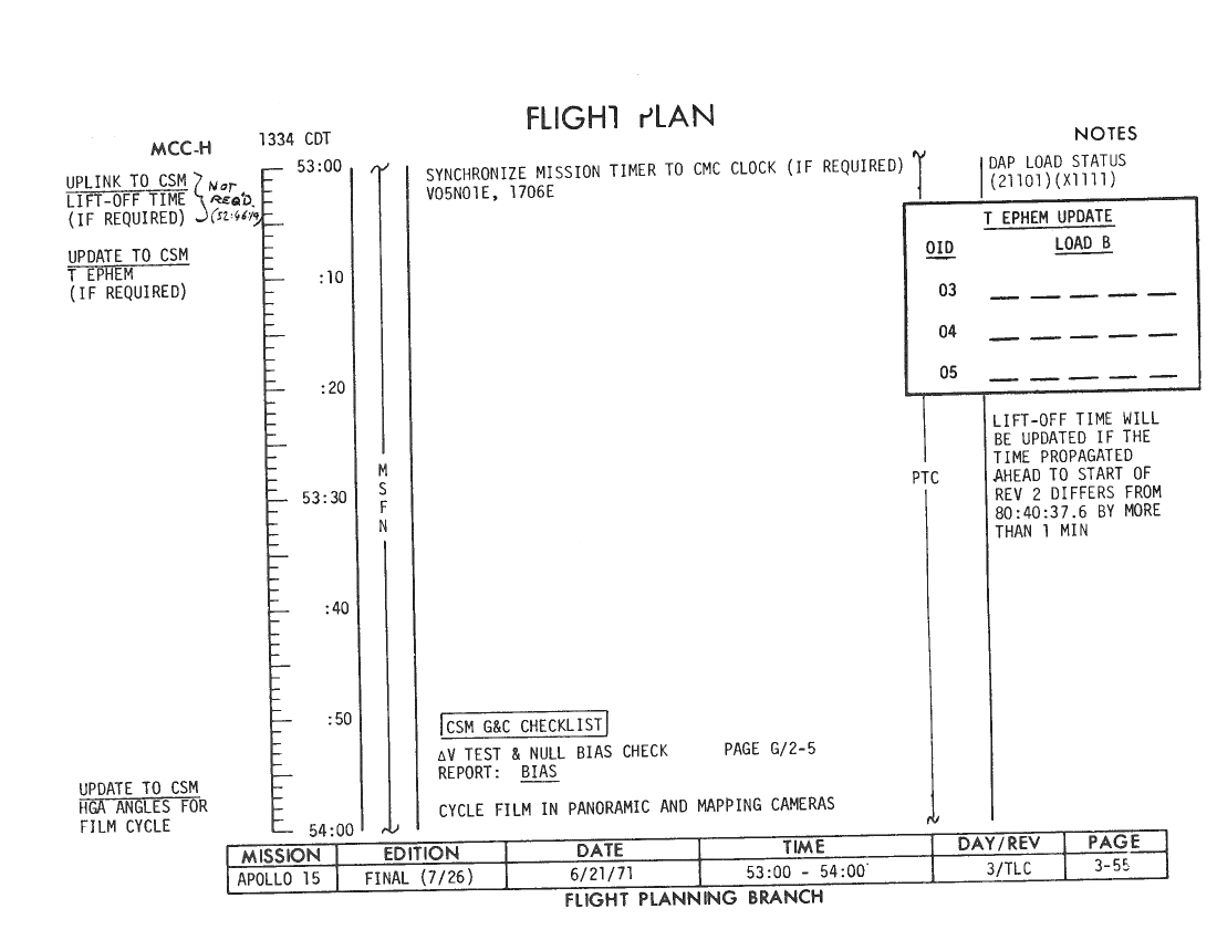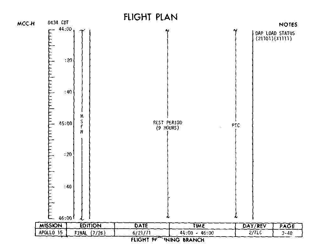 052:46:19 Allen: Roger. In the left-hand side of the Flight Plan there, the "lift off time [if required]." Note that it is not required in this case so we don't have to worry about that. The - second change - is possibly not a change: at 60 hours, six zero hours, I wanted to double check your readback of the addition which I gave to you earlier. And it should read, at 60 hours: "Pan Camera Self Test, Off," and "Map Camera On, to Off." [I] wanted to double check that last step.