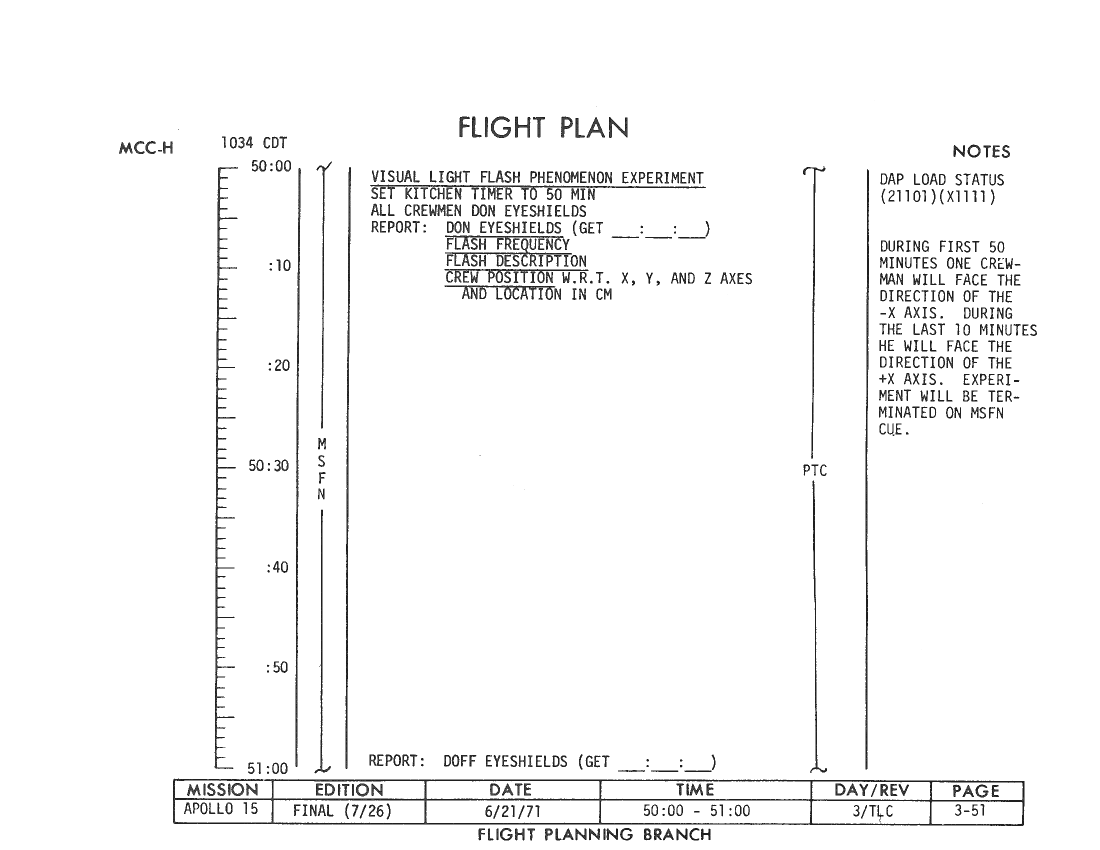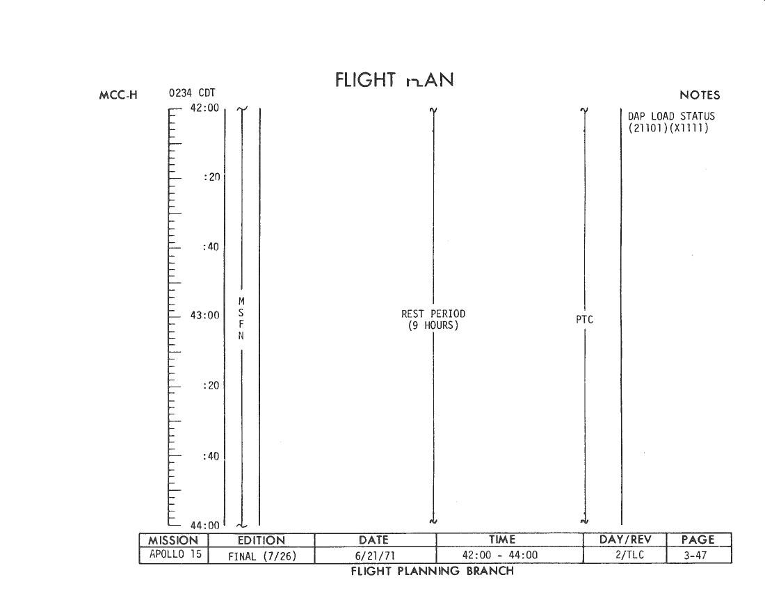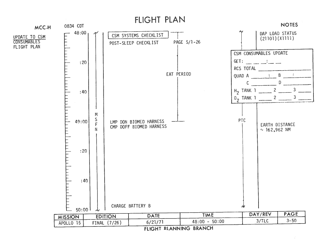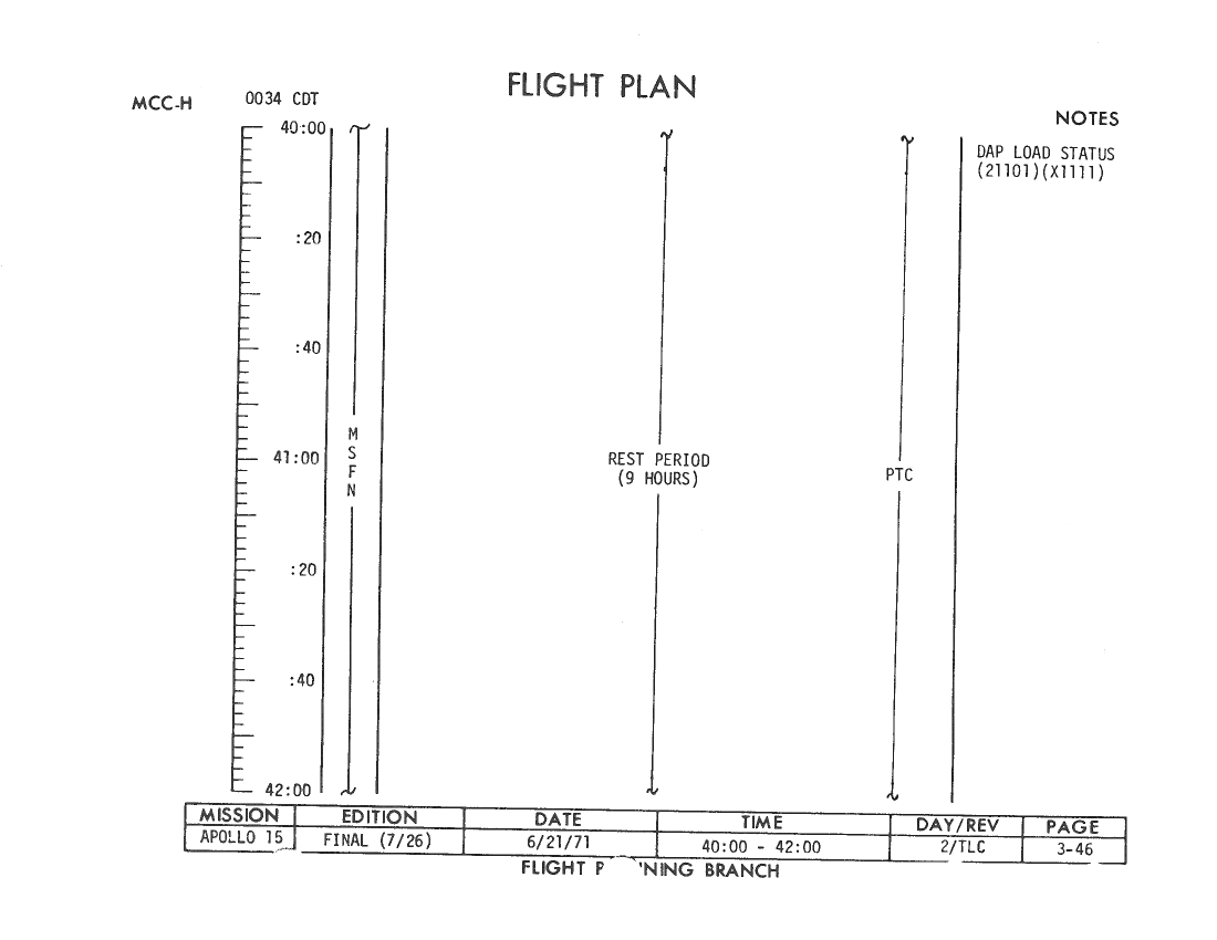 052:46:19 Allen: Roger. In the left-hand side of the Flight Plan there, the "lift off time [if required]." Note that it is not required in this case so we don't have to worry about that. The - second change - is possibly not a change: at 60 hours, six zero hours, I wanted to double check your readback of the addition which I gave to you earlier. And it should read, at 60 hours: "Pan Camera Self Test, Off," and "Map Camera On, to Off." [I] wanted to double check that last step.