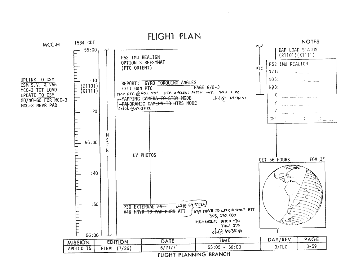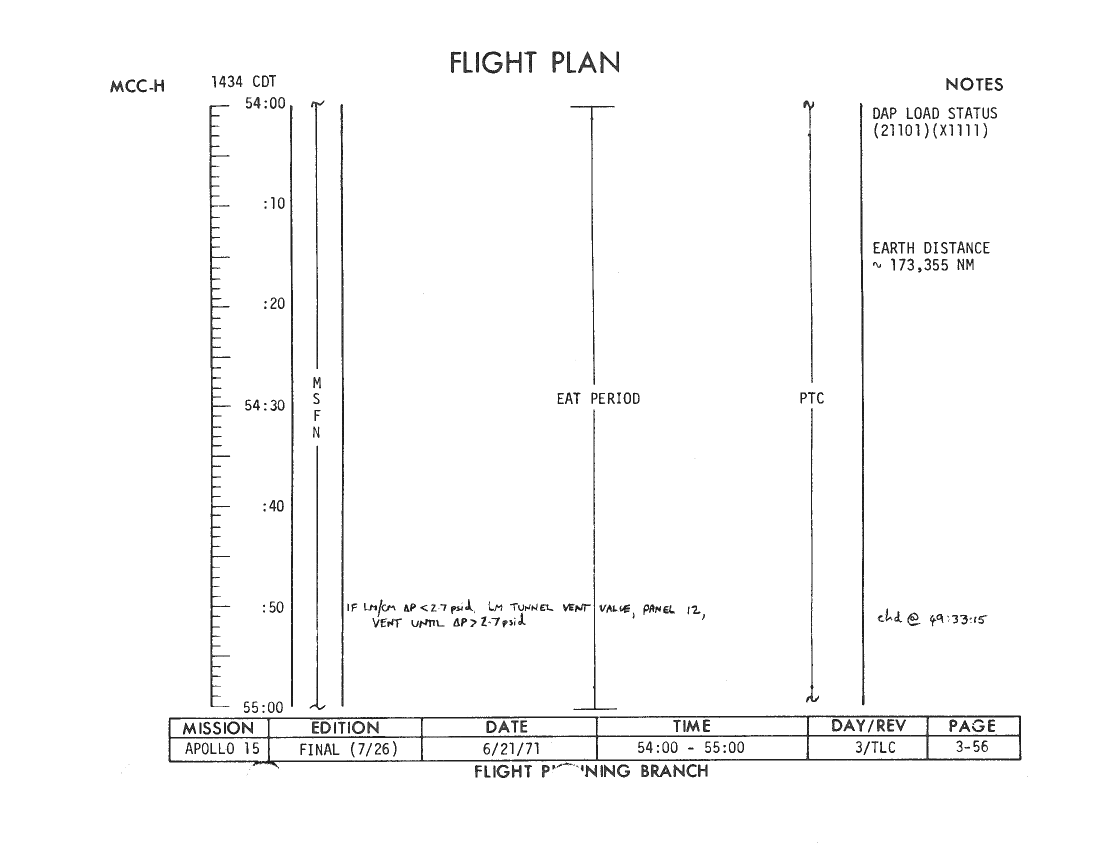 049:34:29 Allen: That's correct. Now turn one page to 55 [hours] plus 15 [minutes in the Flight Plan]. [Pause.]