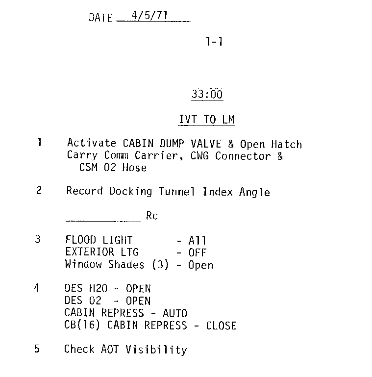 049:42:59 Allen: Roger, Jim. At 56 plus 50, start "CSM Systems Checklist, IVT to LM," and this is an item that's moved up from 57:20, by the way. [Long pause.]