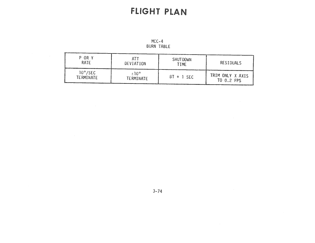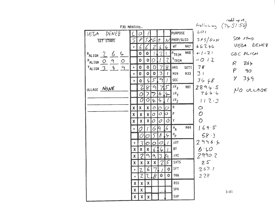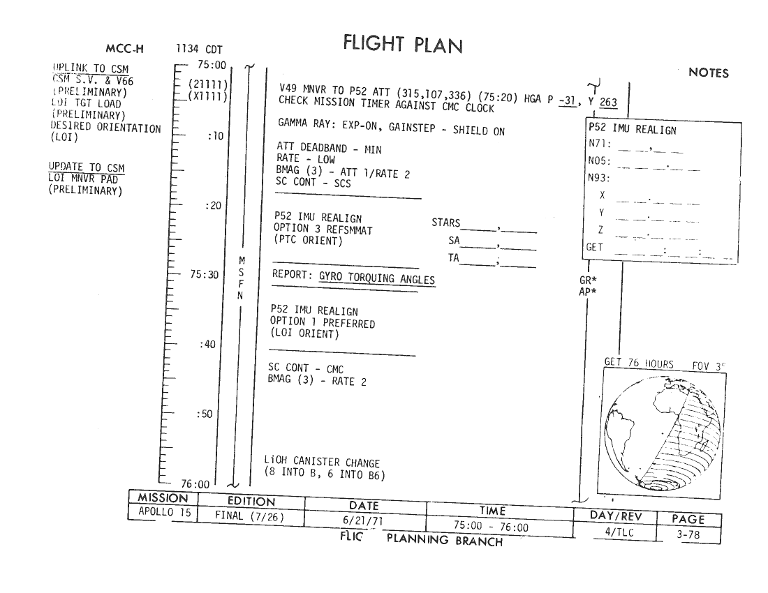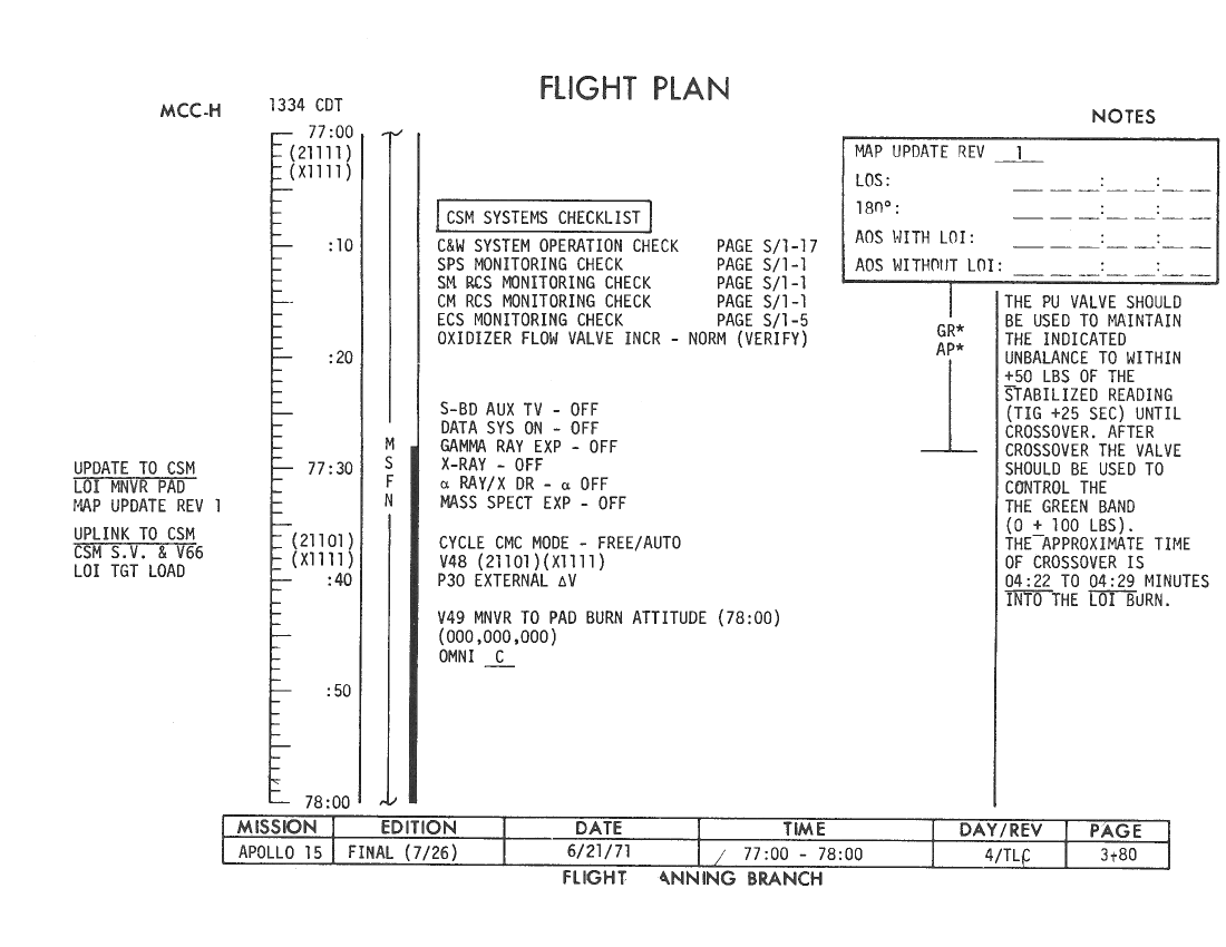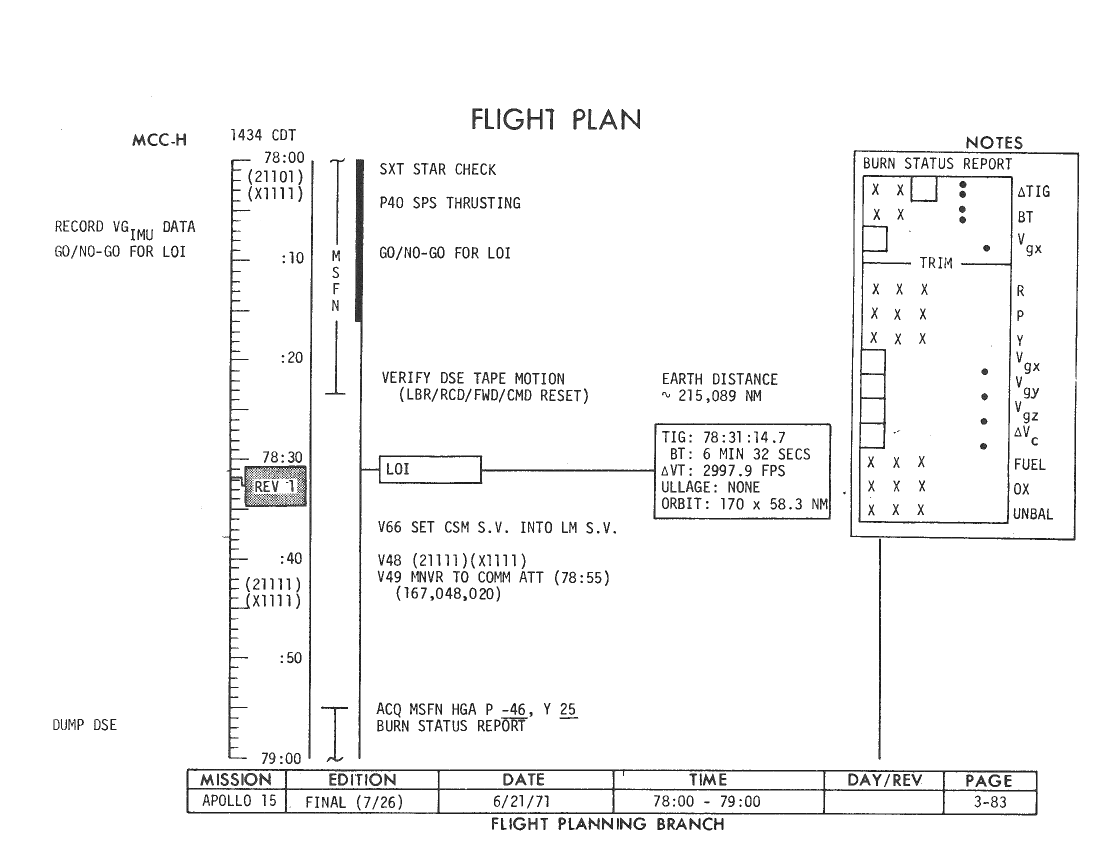 070:48:57 Parker: Okay, and, in the second block, the lower block, under the updates for the times and angles, we have the following readings under the "Update" column. The GET [Ground Elapsed Time] of LOI ignition is "78:31:34.2," the second time is "79:01:34.2," and the angles are "144, 358, and 68." Over. [Pause.]