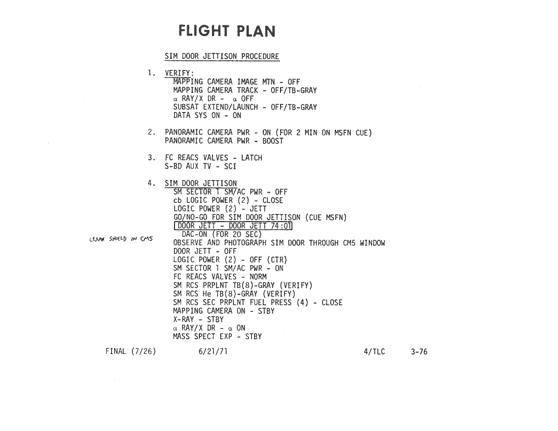 070:37:42 Parker: Okay. And we have two general notes. One refers to SIM [bay] door Jett[ison], and it's a reminder that we verify that the Lexan shield is mounted in - window 5, with the cardboard shade off, for a photograph of SIM door Jett. At - this is about 74 hours. [Pause.]