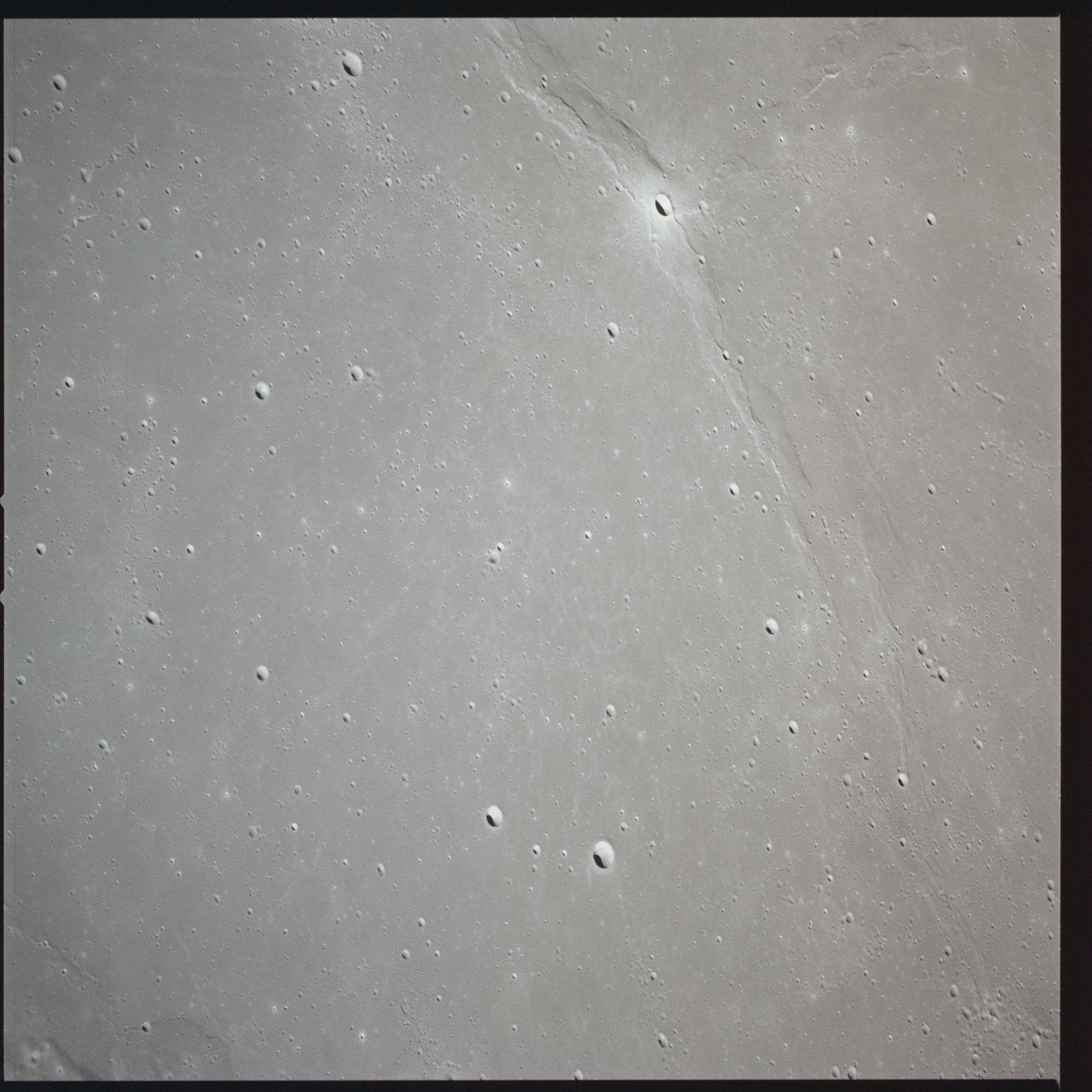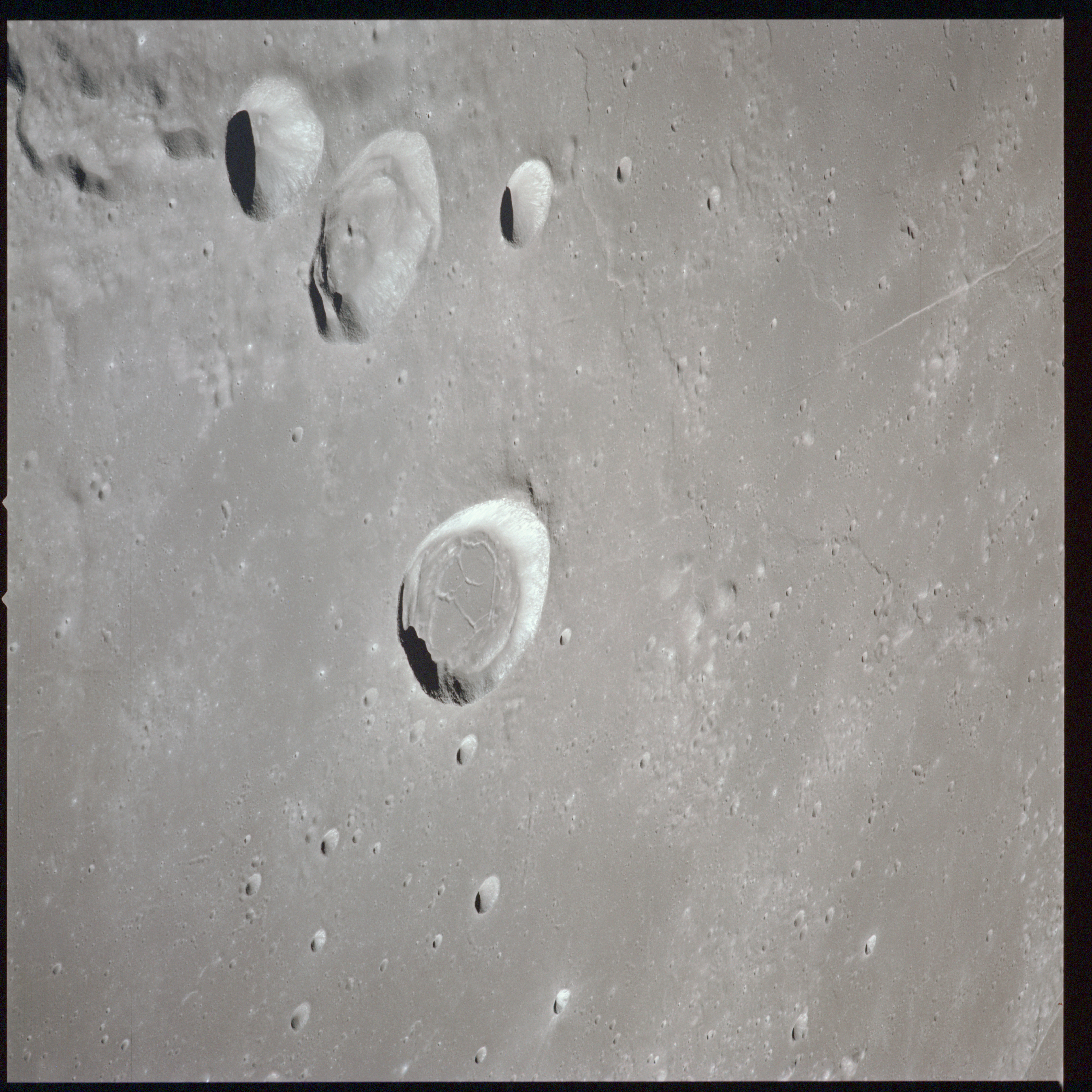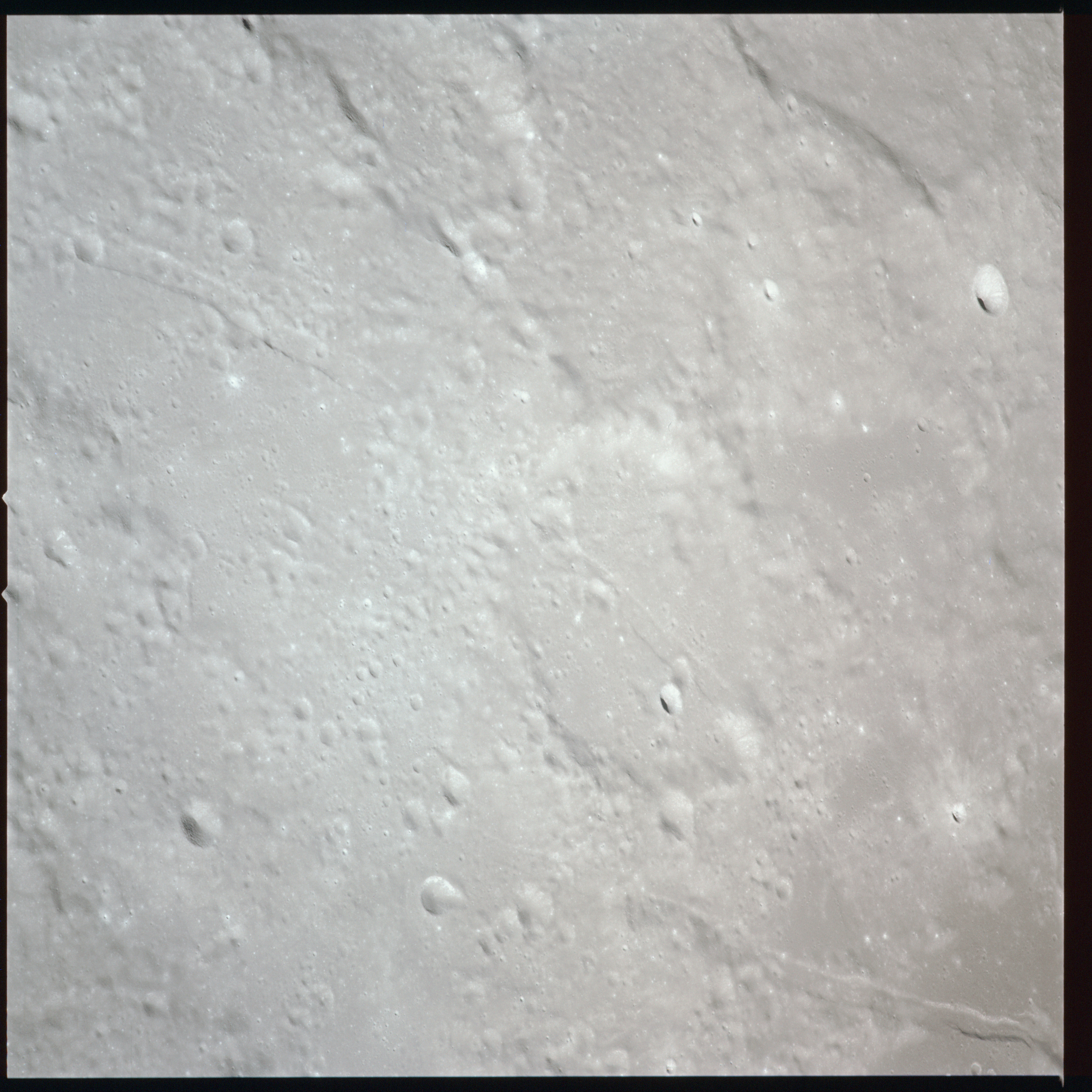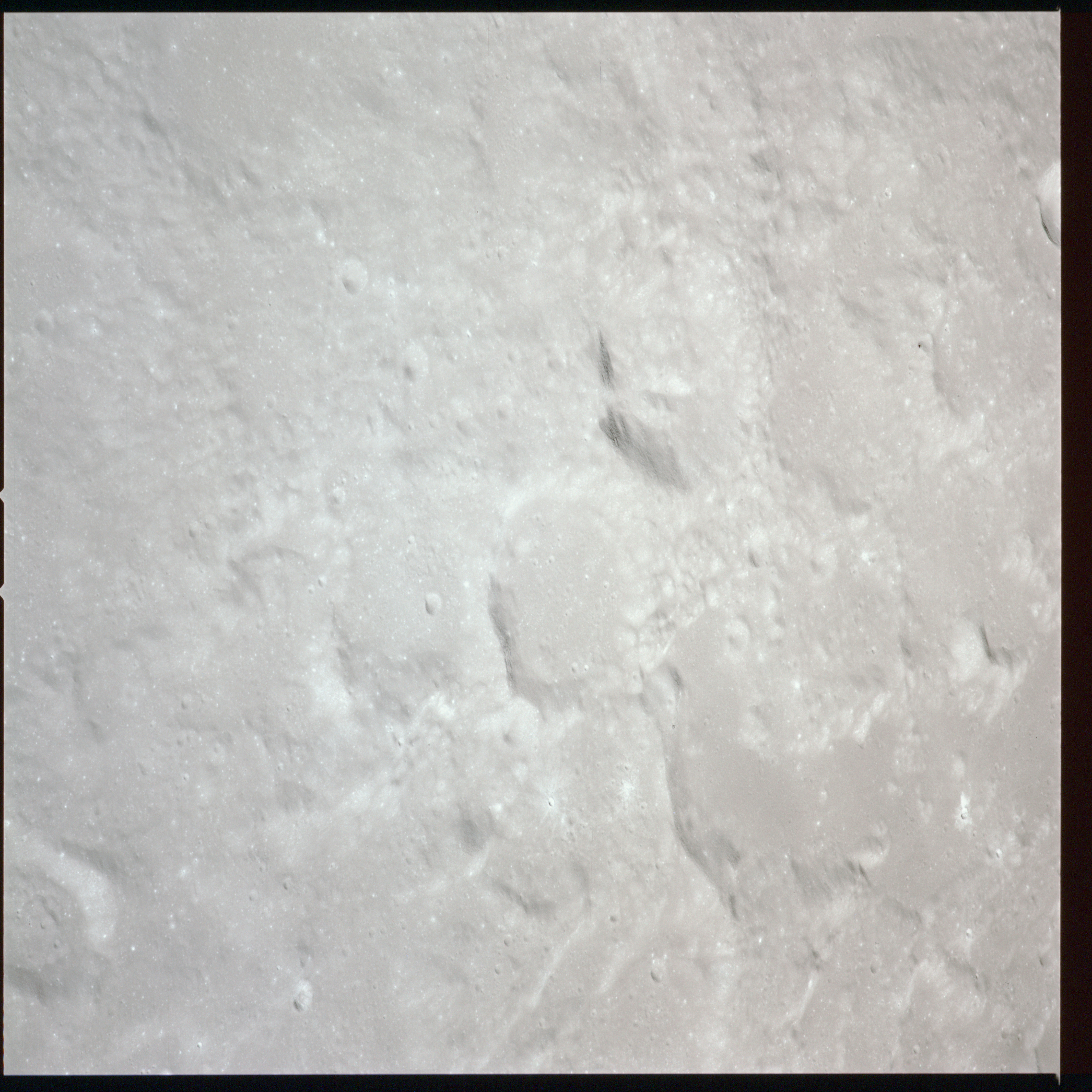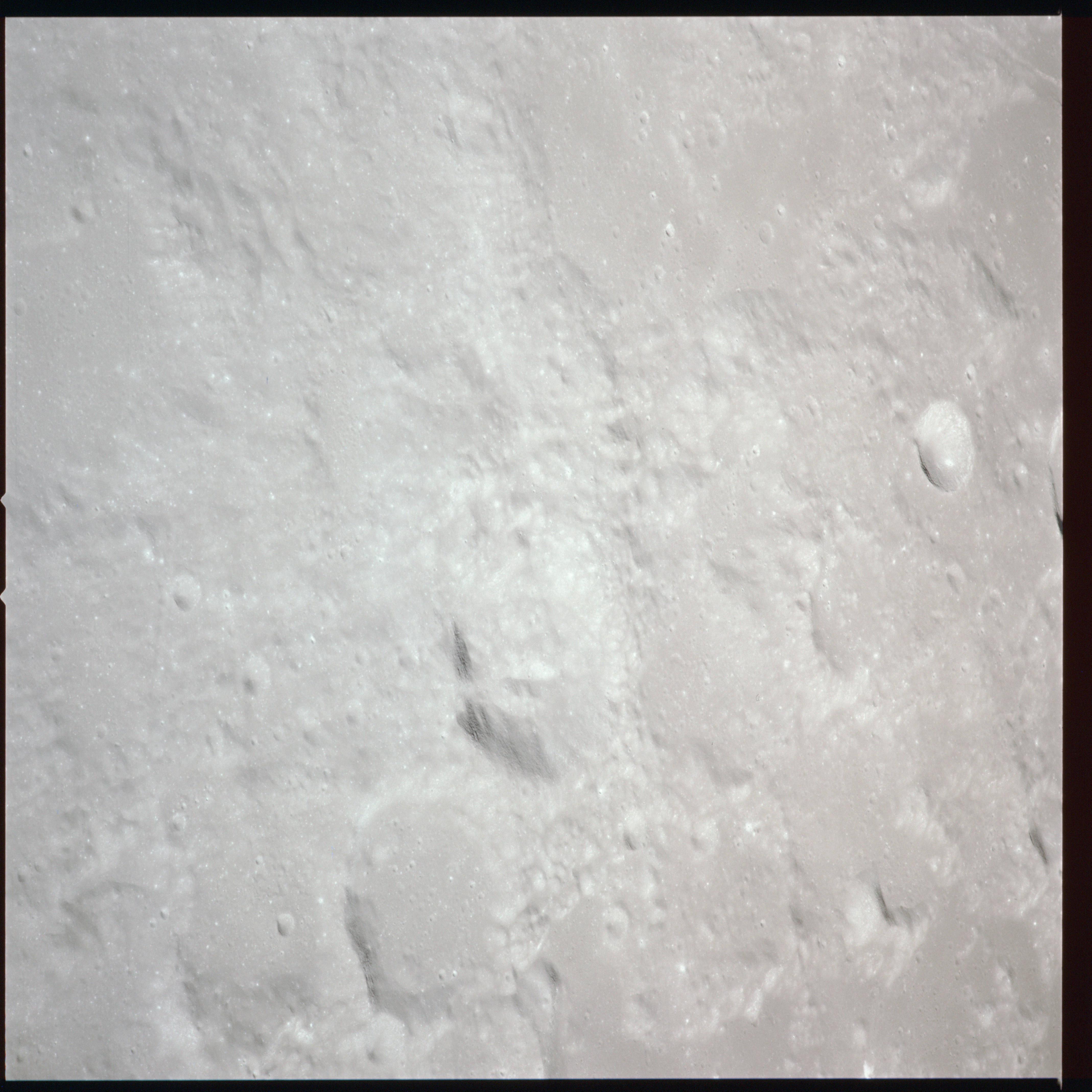 Between Mare Crisium and Mare Serenitatis (Sea of Serenity) lies a large, heavily battered region which is currently north of the spacecraft's position. AS15-91-12351 to 12360 show various landmarks in this area. As the Sun is high in the sky over these areas, there is little relief shown in these photographs.
