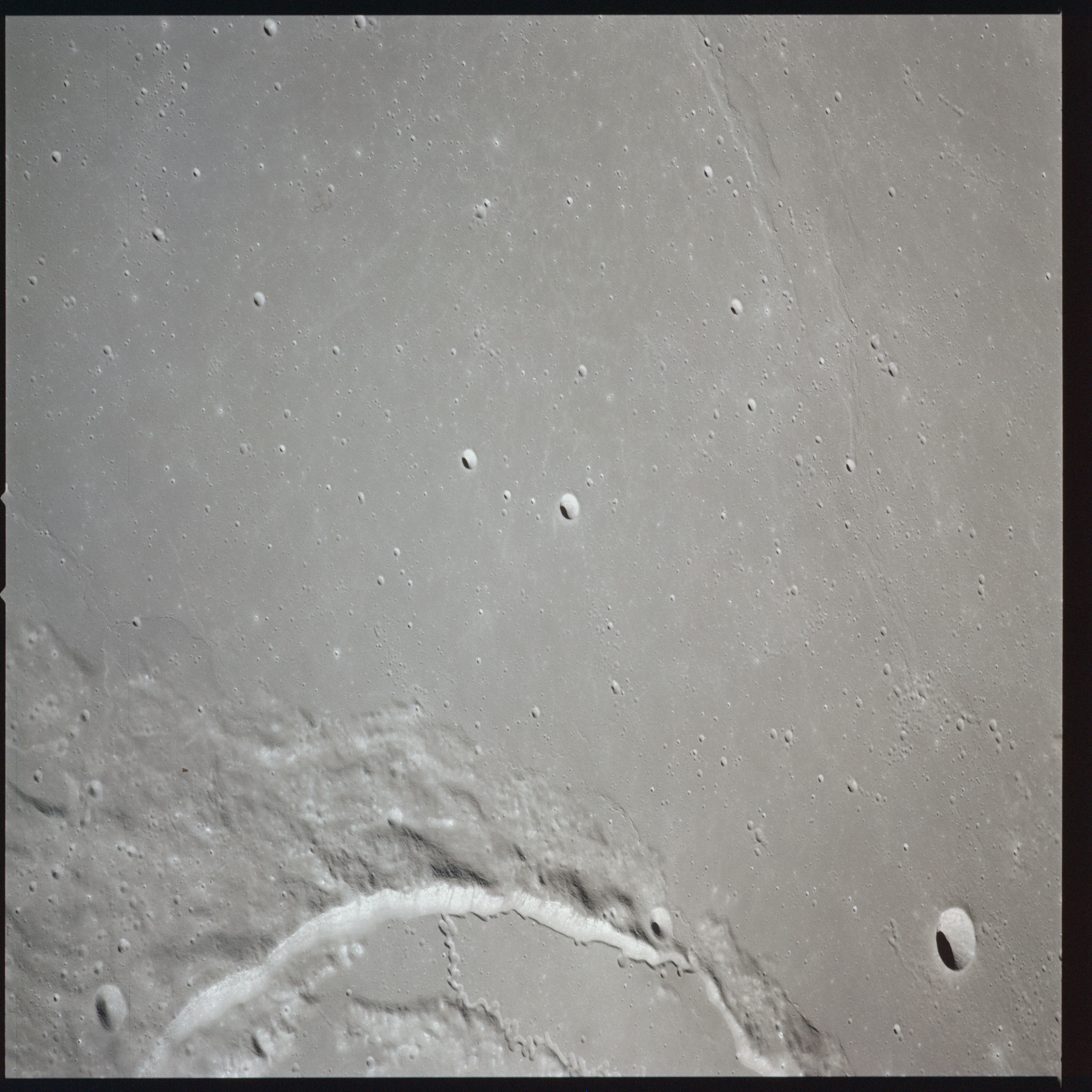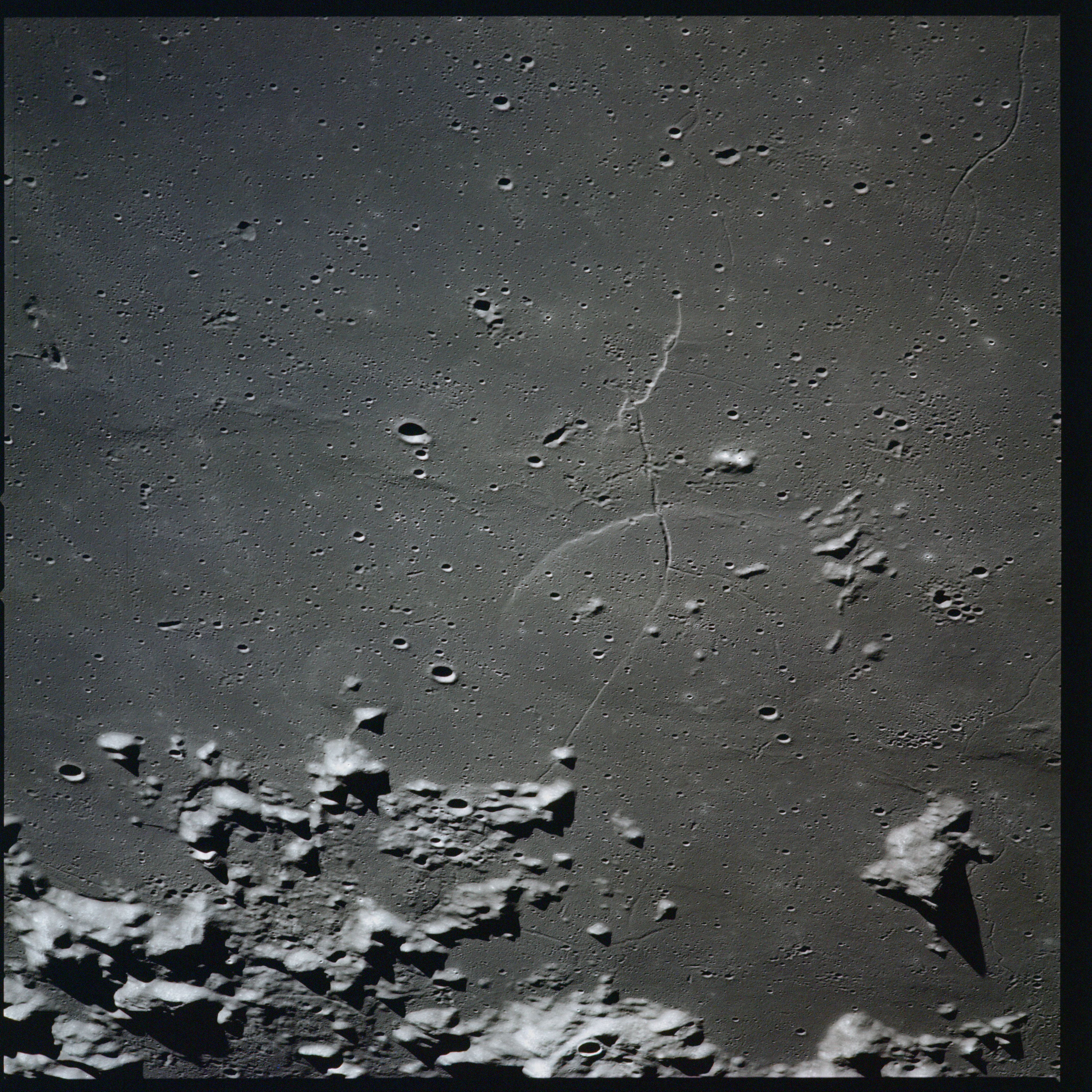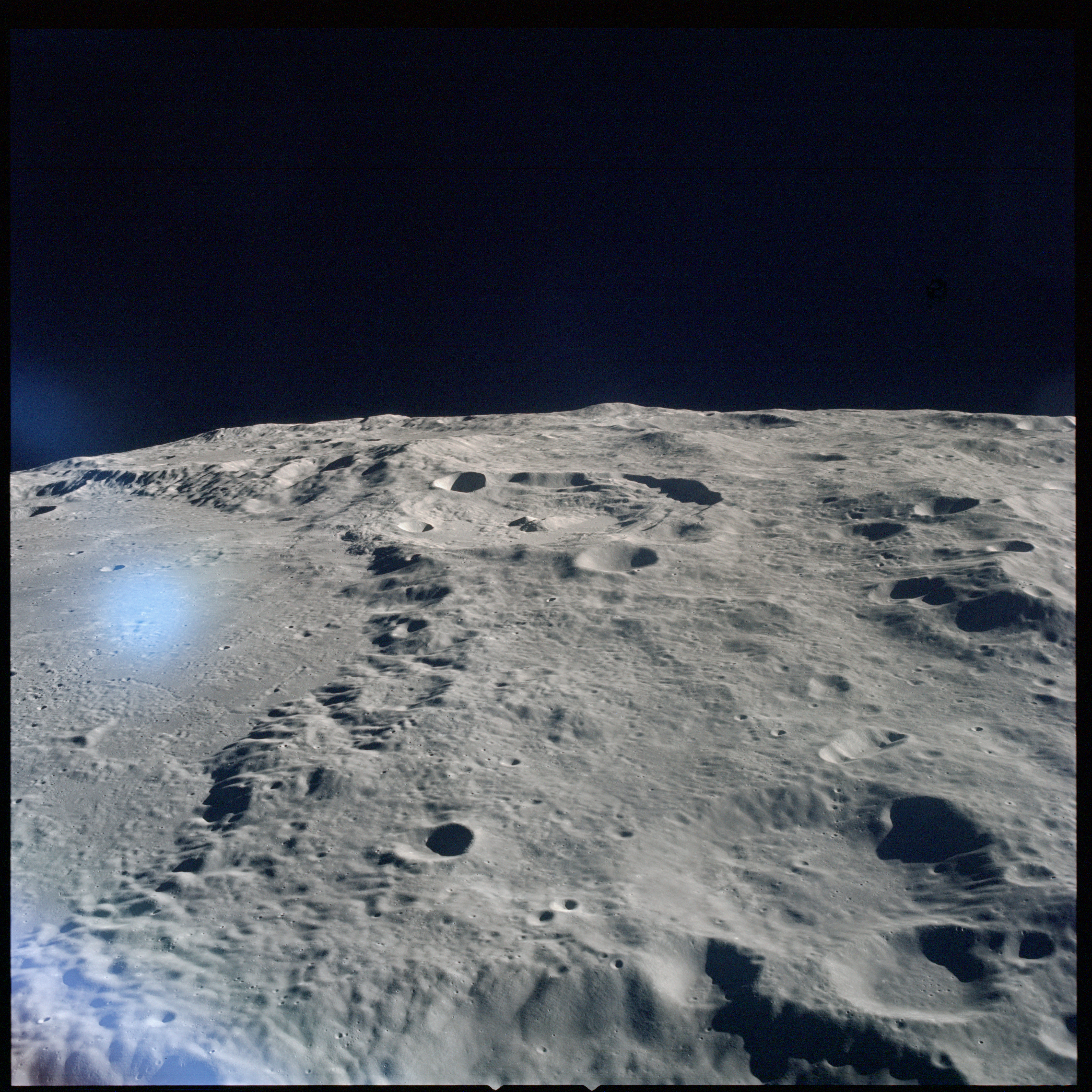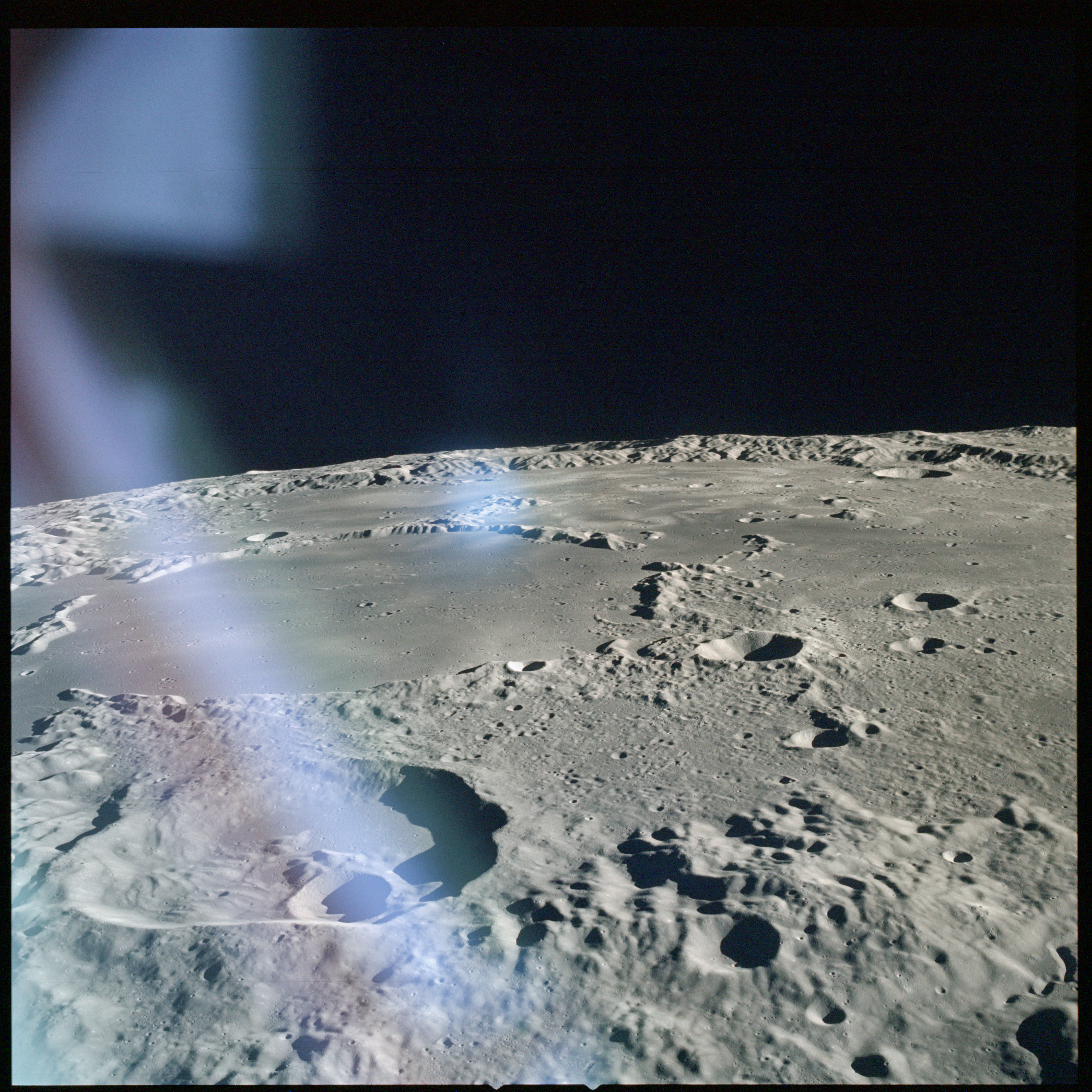 Apollo 15's current elliptical orbit has its low point over the Moon's far-side. Therefore, as they come towards their 315-km high point, or apocynthion, they can view across the entire width of Mare Serenitatis in one eyeful. Below them are the Montes Taurus which form the eastern rim of the Serenitatis basin while looking to the west, they can see Montes Haemus, the southwest range, and Montes Caucasus, the northwest range.