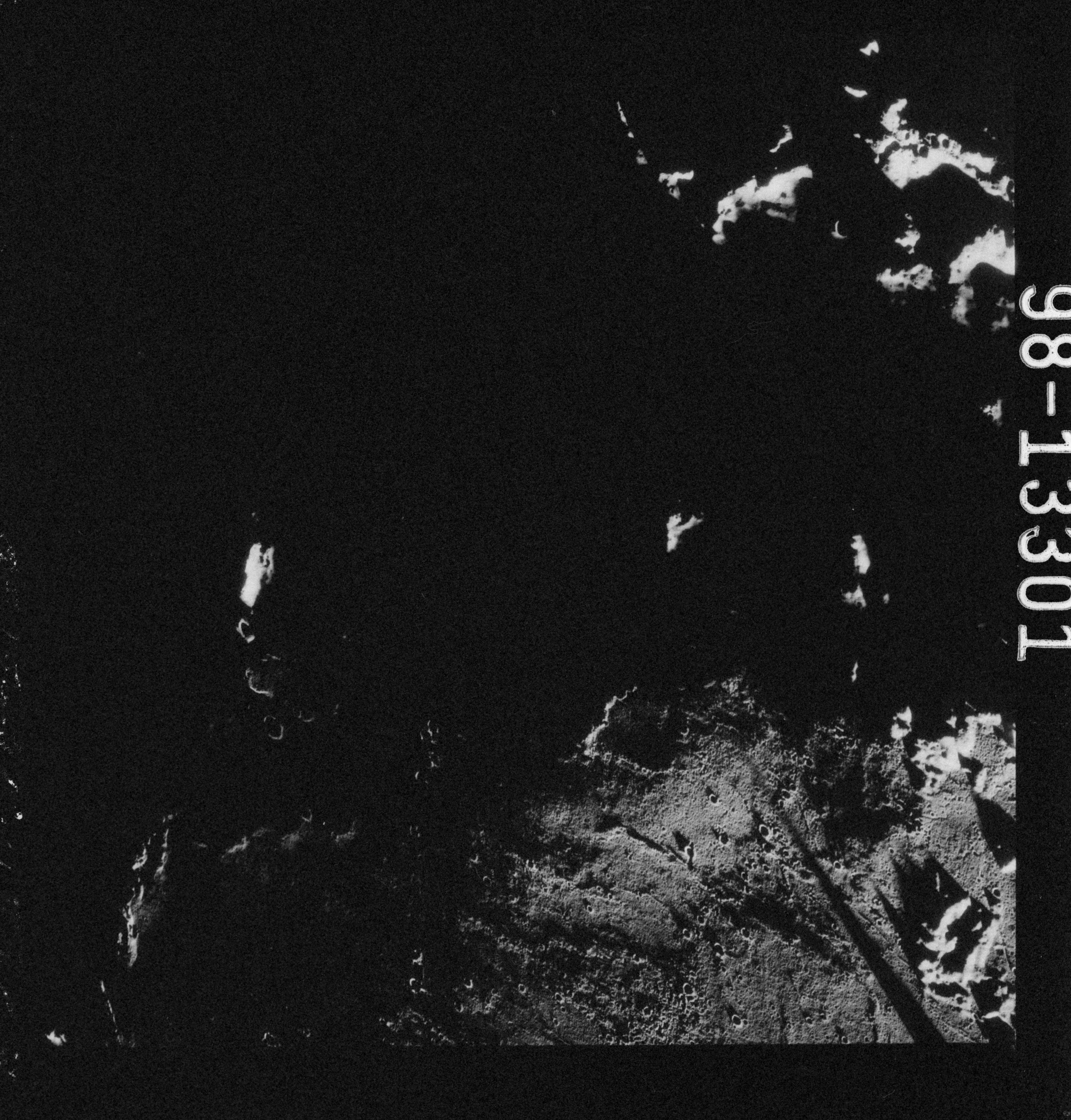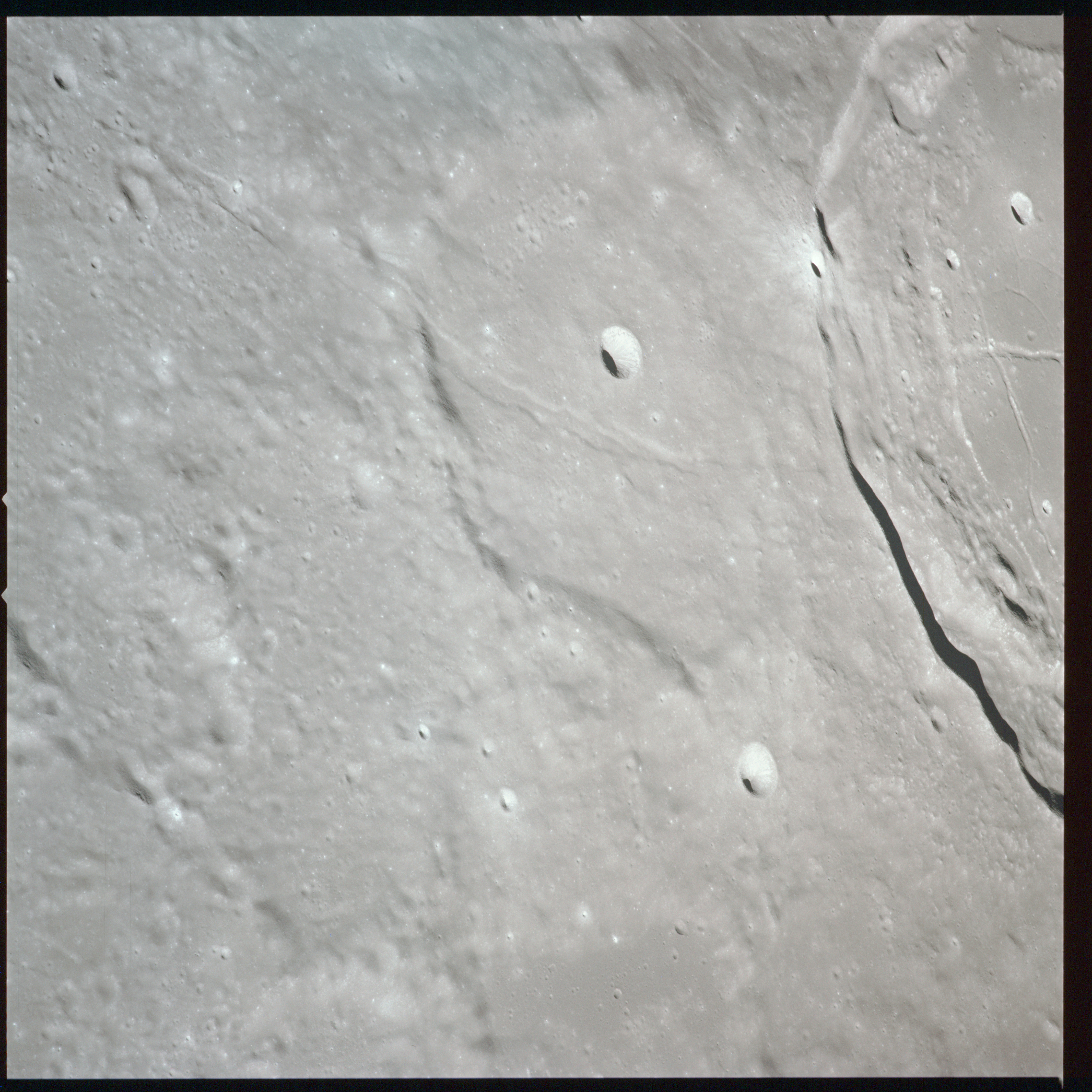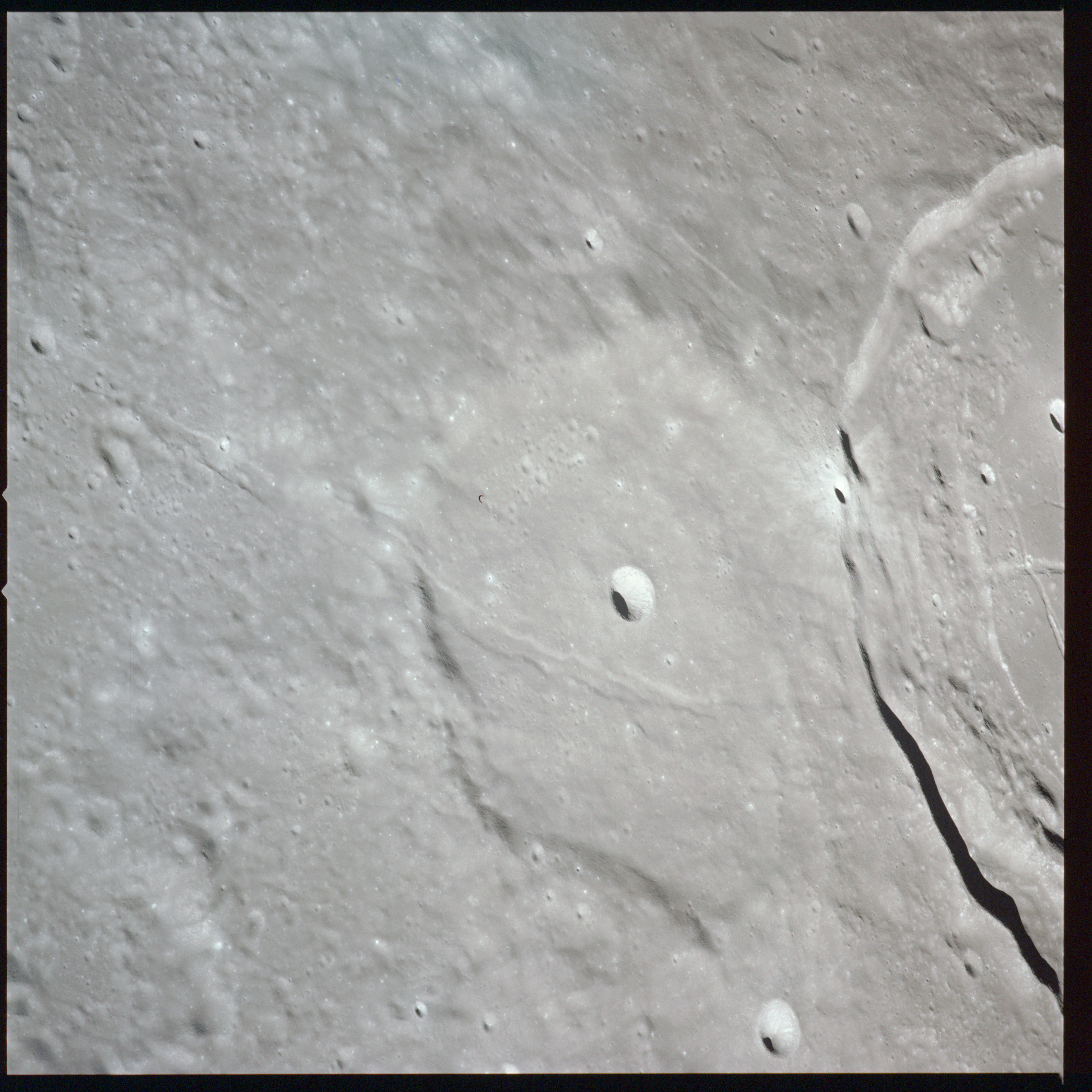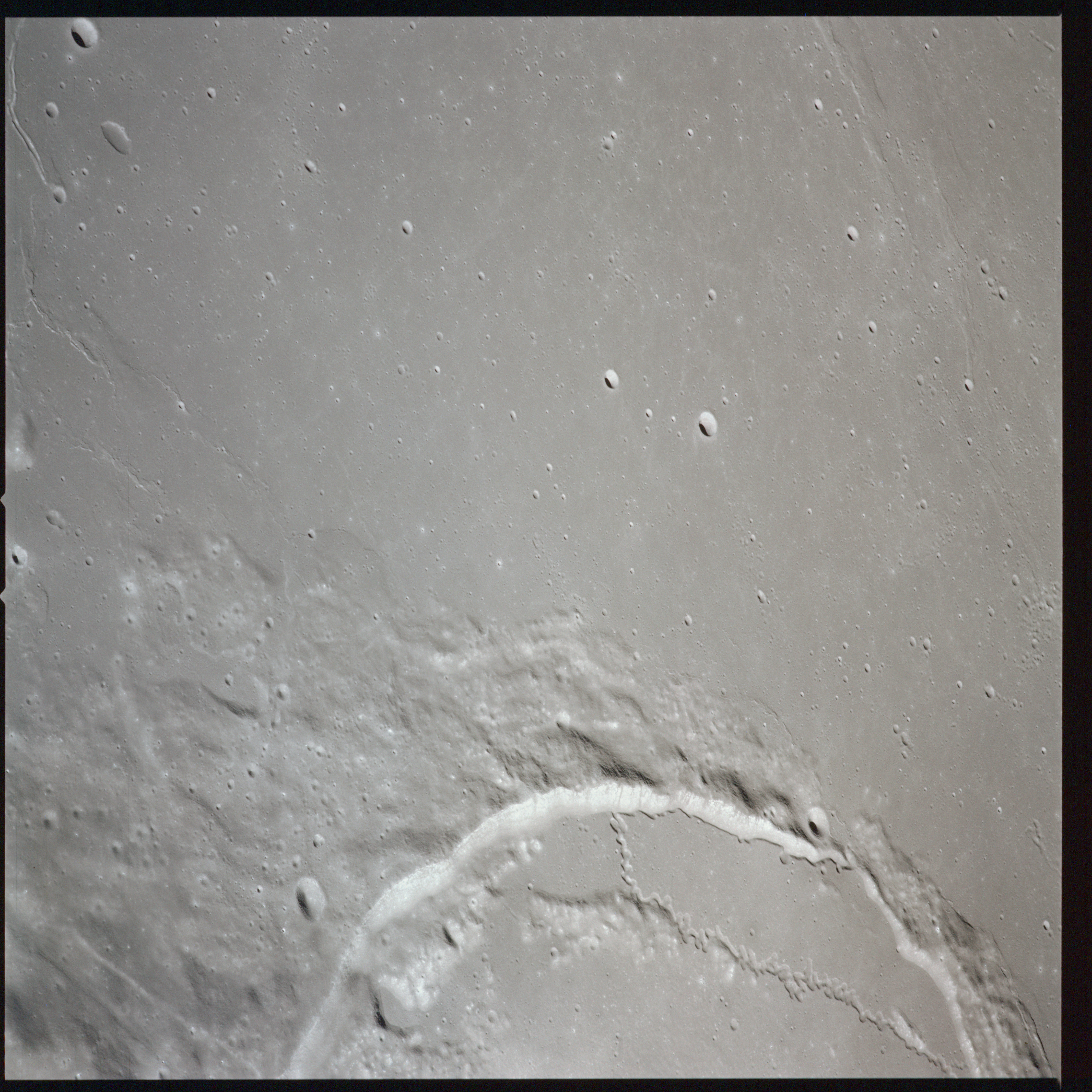 Apollo 15's current elliptical orbit has its low point over the Moon's far-side. Therefore, as they come towards their 315-km high point, or apocynthion, they can view across the entire width of Mare Serenitatis in one eyeful. Below them are the Montes Taurus which form the eastern rim of the Serenitatis basin while looking to the west, they can see Montes Haemus, the southwest range, and Montes Caucasus, the northwest range.