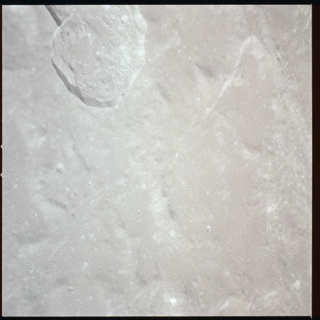 079:23:46 Worden:Okay, Karl. We're coming up over Serenitatis now. We're almost over le Monnier and we can see the Littrow area just out in front of us. And it is, in fact, about three different shades. You can see the - in the upland area, and particularly what looks like down in the valleys, a darker color, and it does look like it's a light powdering - or dusting-over of the entire area. And then, as you get out further into Mare Serenitatis, there's another layering which is a little bit lighter in color. And that - out at the last edge of the wrinkle ridge, out beyond that is the last layer, and the rest of Serenitatis looks fairly - fairly light in color. So I'd say that the - the - centeral - central part of Serenitatis is light, out beyond the first wrinkle ridge is a darker layering, and we're not up close enough to see what it is yet, and then as you get up into the highlands around le Monnier and Littrow area itself, there's what - what appears to be a - a light dusting of dark material, and it certainly looks volcanic from here. Off to - to the left of that, to the south, we can pick up Sulpicius Gallus pretty clearly right now.