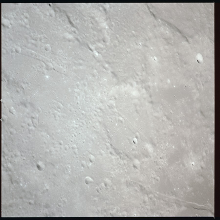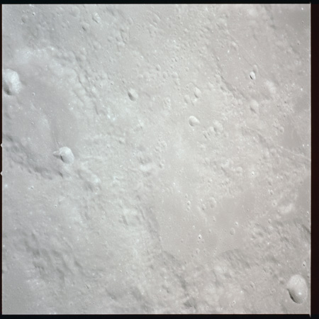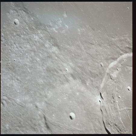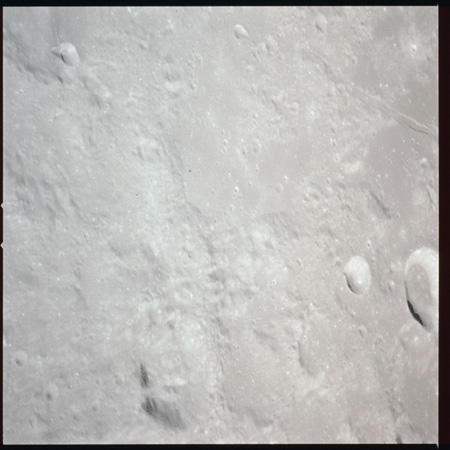 079:13:57 Scott: And Houston. We're over Mare Crisium at the present time, and the sights are really striking. I guess some of the interesting things we've noted is the variation in albedo from white to dark gray with many variations of gray in between. And many times, this albedo change appears without any significant change in topography, other than perhaps a - a mountain ridge or a chain or a wrinkle ridge or something, but there are many vari - variations in the albedo all over the surface. I guess our general consensus is that it's gray. We haven't noticed any brown yet.