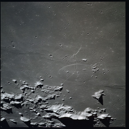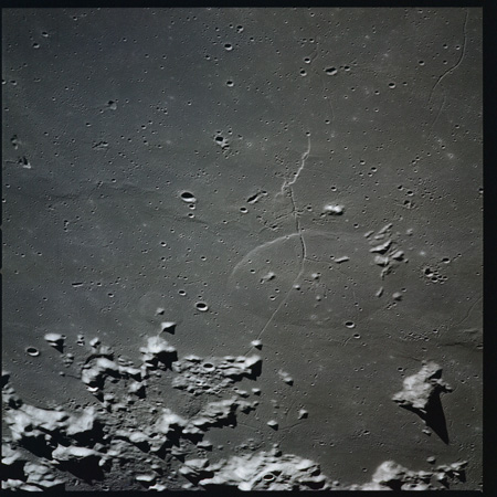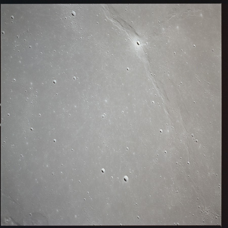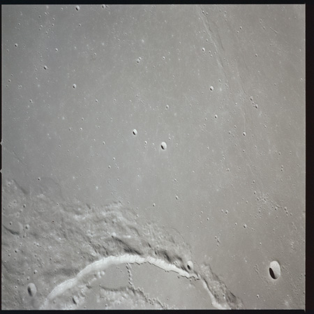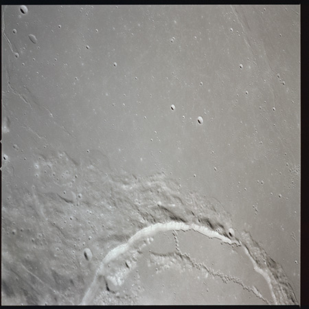 079:23:11 Scott: Houston, 15, we're coming up to Serenitatis, and it really looks like an ocean. The landforms, as we approach, are very rugged, very highly cratered, rounded, and we get to the shoreline and we see a few wrinkle ridges that have smoothed out. And we can see, on the far side, on the horizon, the mountains which pick up again on the western side of Serenitatis.