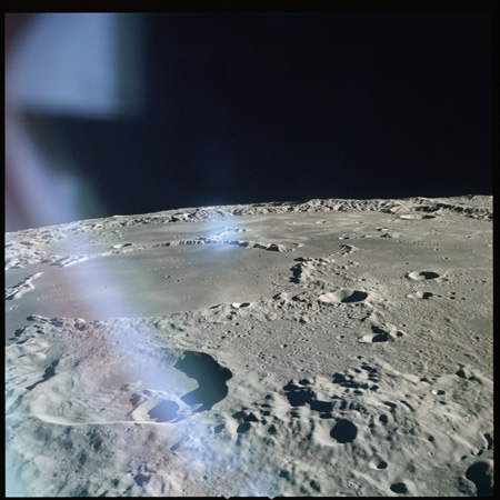 As seen from Earth, the landing site is 26° north of the centre of the lunar disk and Apollo 15 has entered an inclined orbit to take it over the site. As previous missions had landing sites located near the lunar equator, none had orbited at such an inclination. Having reappeared around the eastern limb, and travelling roughly WNW, the crew are flying over new territory and have a close up view of Mare Crisium, a small but distinctive and isolated mare which is easily visible from Earth by the naked eye as a dark blotch, well to the right of the Moon as seen from the northern hemisphere. None ever reached the 11° to 24° latitude required to fly over Mare Crisium.
