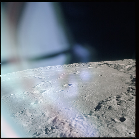 With all the values entered, the computer begins flashing "50" in the Verb display and "18" in the Noun display of the DSKY which essentially asks the crew if they would like to perform the auto-maneuver to the requested attitude. When the "Proceed" button is pressed, the computer fires the appropriate thrusters, causing the spacecraft to point the windows at the lunar surface and allowing photographs to be taken. The photography is not scheduled to begin until the beginning of the second revolution, midway around the far-side. The spacecraft will be crossing the terminator around this time where the low Sun angle will enhance the topography of the surface.