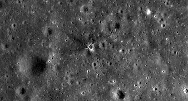 LROC image of the 30-metre crater formed by the impact of the Apollo 15 S-IVB. Crater position is 1.2902°S, 11.8245°W - Image by LROC/ASU