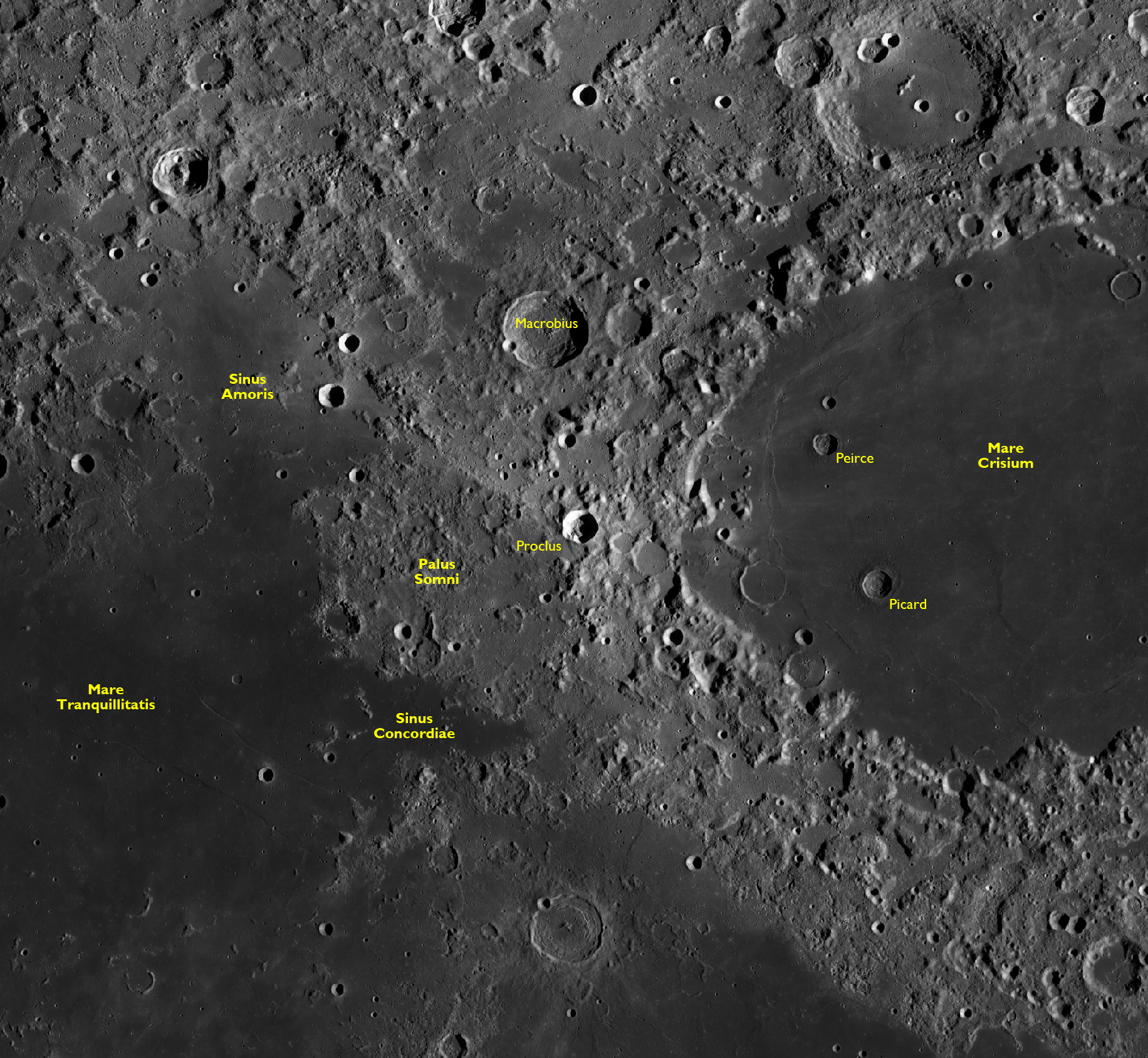 Proclus and its context between Mare Crisium and northeast Mare Tranquillitatis. The excluded zone is called Palus Somni
