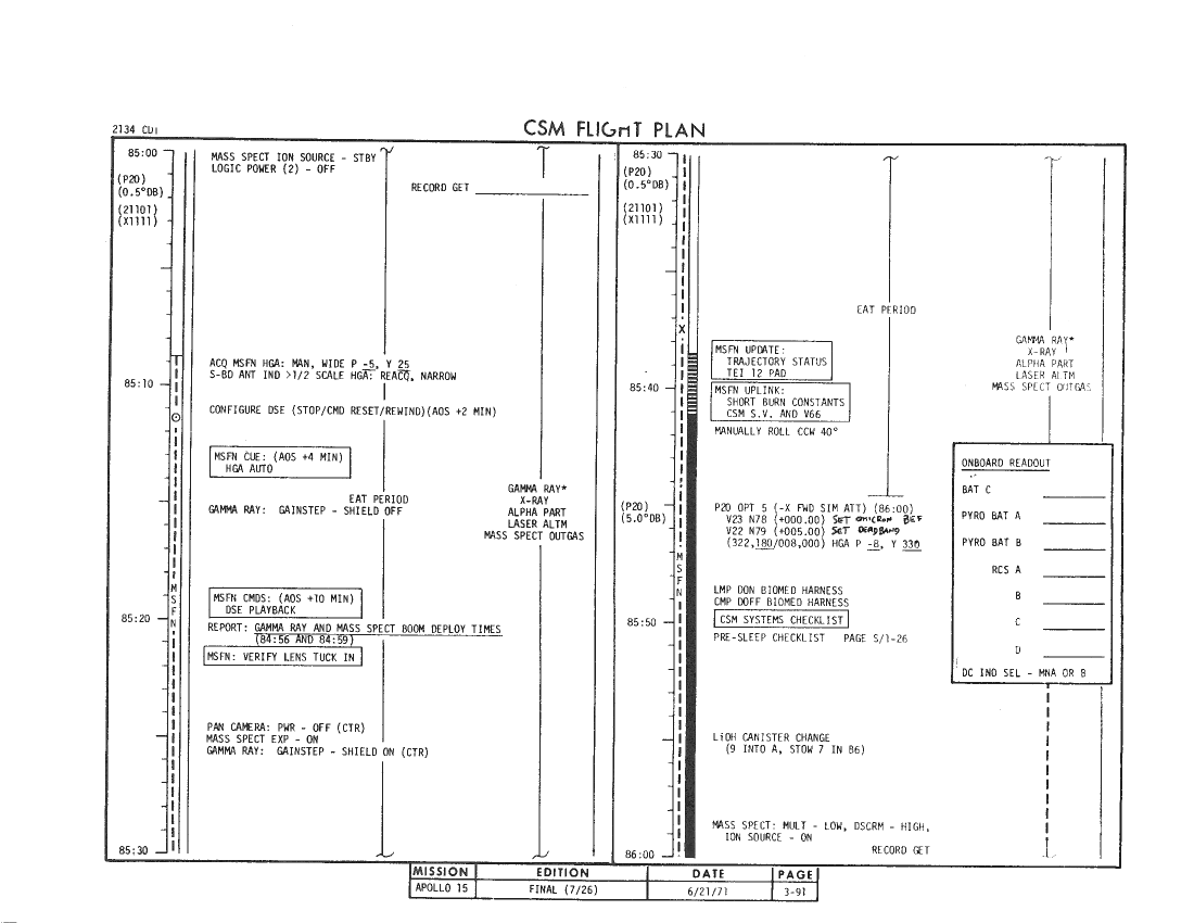 According to the Flight Plan, the Mass Spectrometer Experiment switch was due to go to On at 85:25. At 86:00, the Ion Source is due to be switched to On. It is unclear why the Experiment switch is being put in Standby instead.
