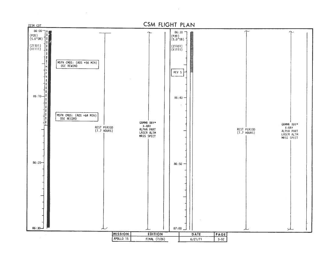 Apollo 15 will begin Rev 5 at about 086:36 during the next far-side pass. The crew's rest period will continue until nearly the end of revolution 8.