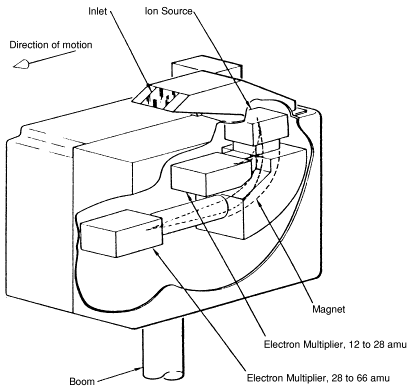 When the spacecraft is flown in an attitude that has the minus-X axis facing forward (i.e. the SPS engine bell facing forward), particles from the lunar atmosphere are rammed into an inlet where they are electrically charged (ionised) by electrons from a filament source. A magnet diverts the path of the resultant ion stream towards two detectors. Simply stated, the heavier an atom or molecule, the more resistant its motion is to change by a magnetic field. By measuring the deflection of the particle stream, the masses of its constituent parts can be determined. The two detectors will detect particles in the mass range of 12 to 66 atomic mass units.