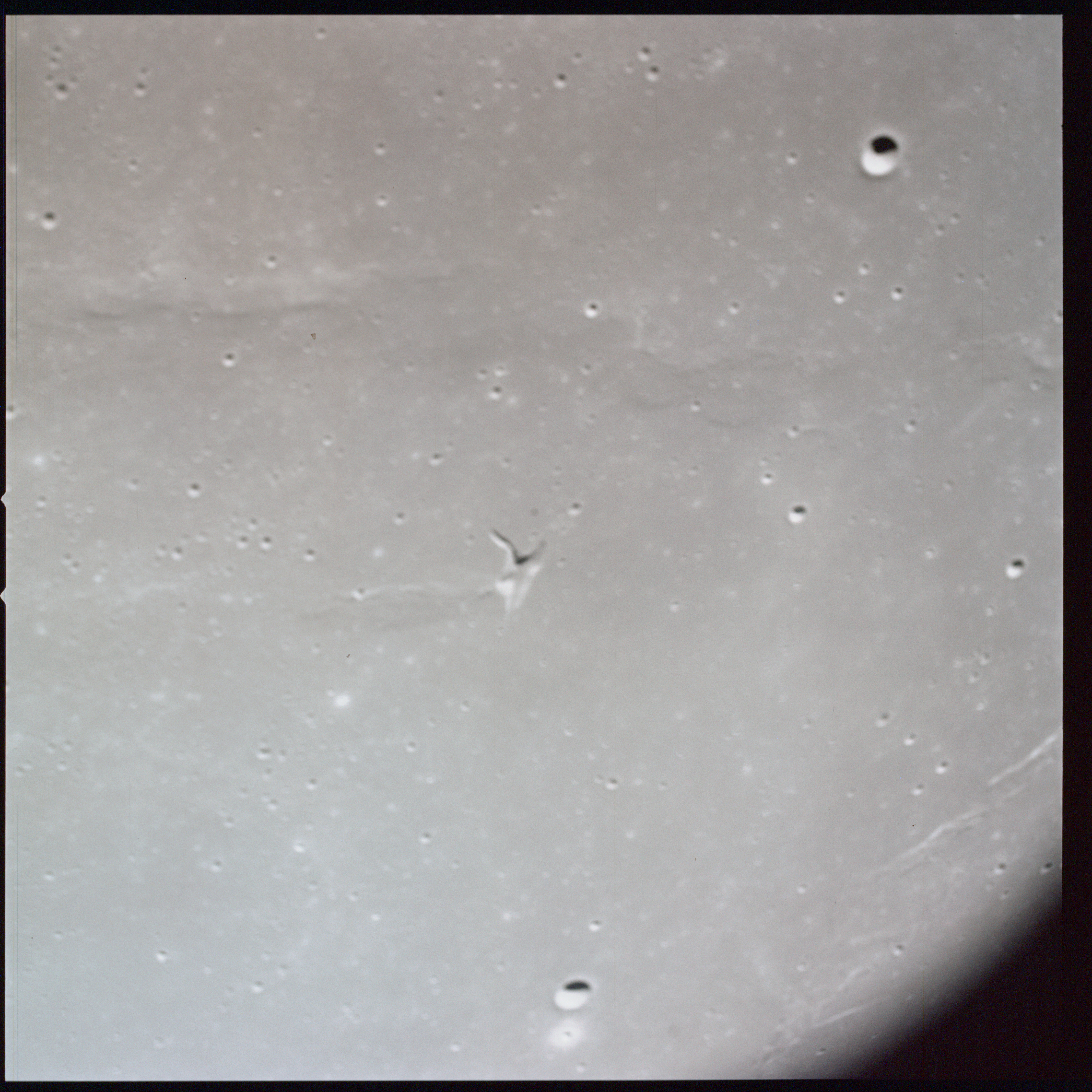 The spacecraft is just crossing the foothills near Promontorium Fresnel, the cape between the two great maria where the Haemus and Apennine ranges meet. Looking back towards Mare Serenitatis, we can see discontinuous linear features which appear like a partially formed sinuous rille.