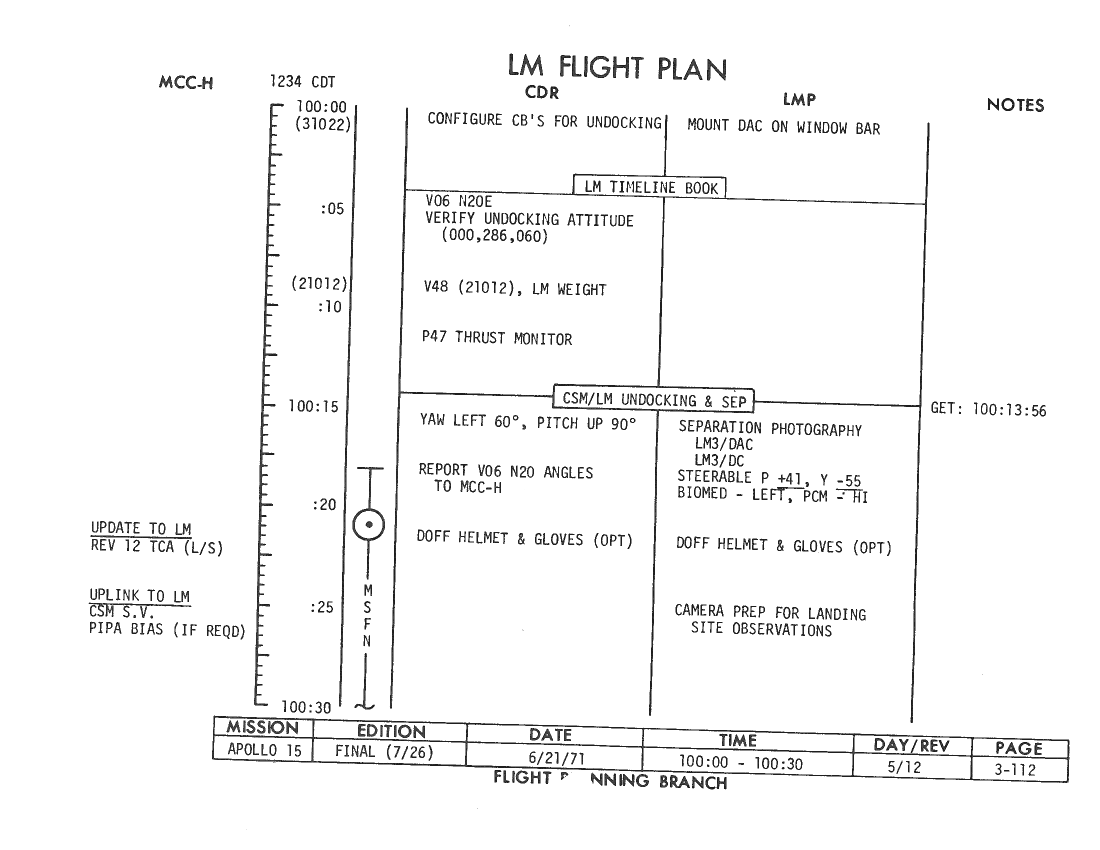 Immediately after undocking, he is to move the CSM away, or translate in a minus-X direction, at 0.3 metres per second (one foot per second) to separate the two spacecraft and avoid a collision. In the LM, Jim is also to film the undocking and separation while Dave pitches the LM up 90° and left 60° to allow Al to visually inspect the landing gear.
