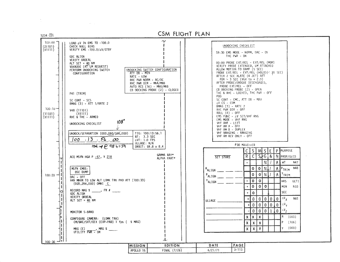 099:29:18 Mitchell: Okay, Apollo 15; Houston. You're Go for undocking. You're 45 seconds from LOS, and we observed your Rendezvous Radar test. Falcon, also, we have not seen you reset the DAP [Digital Auto Pilot].