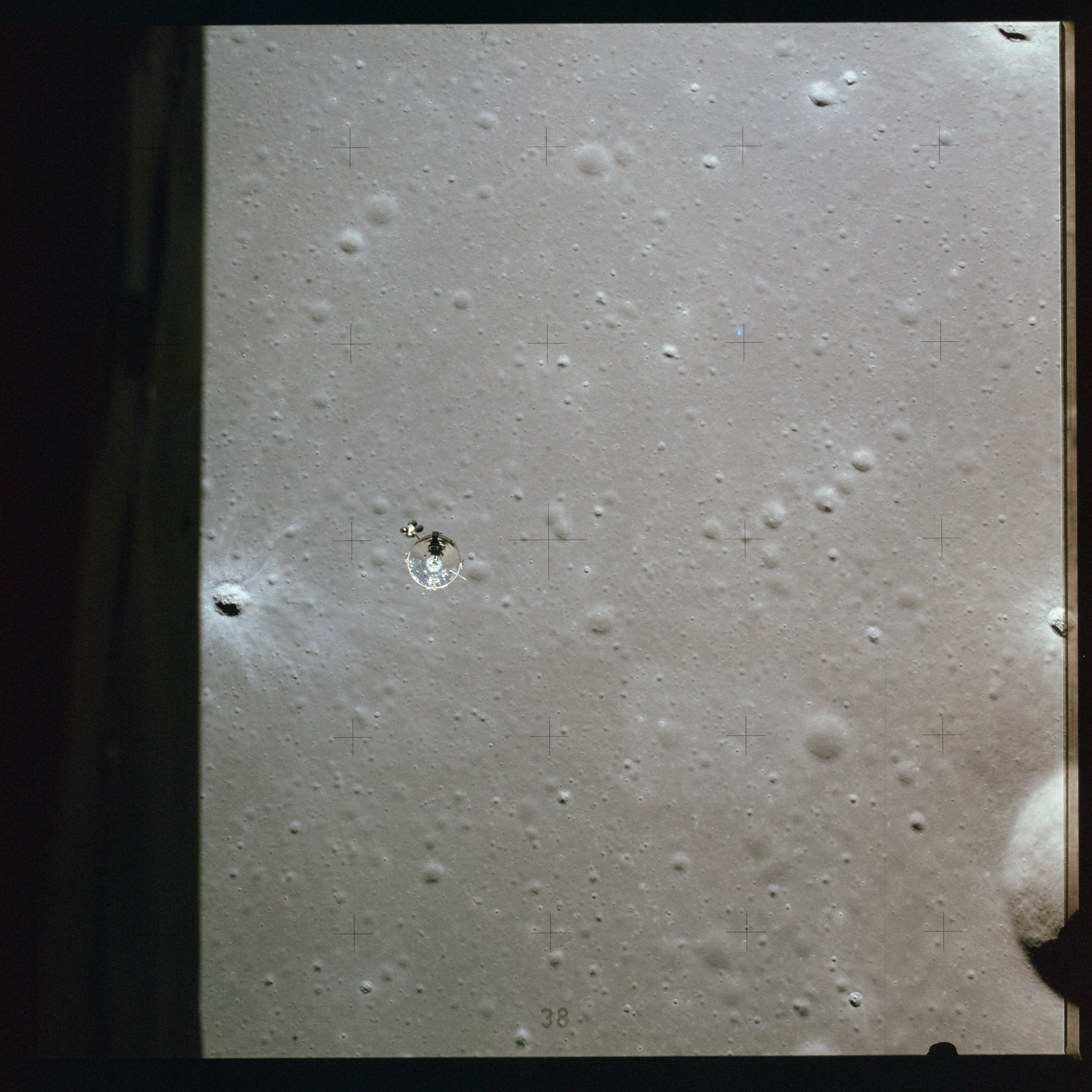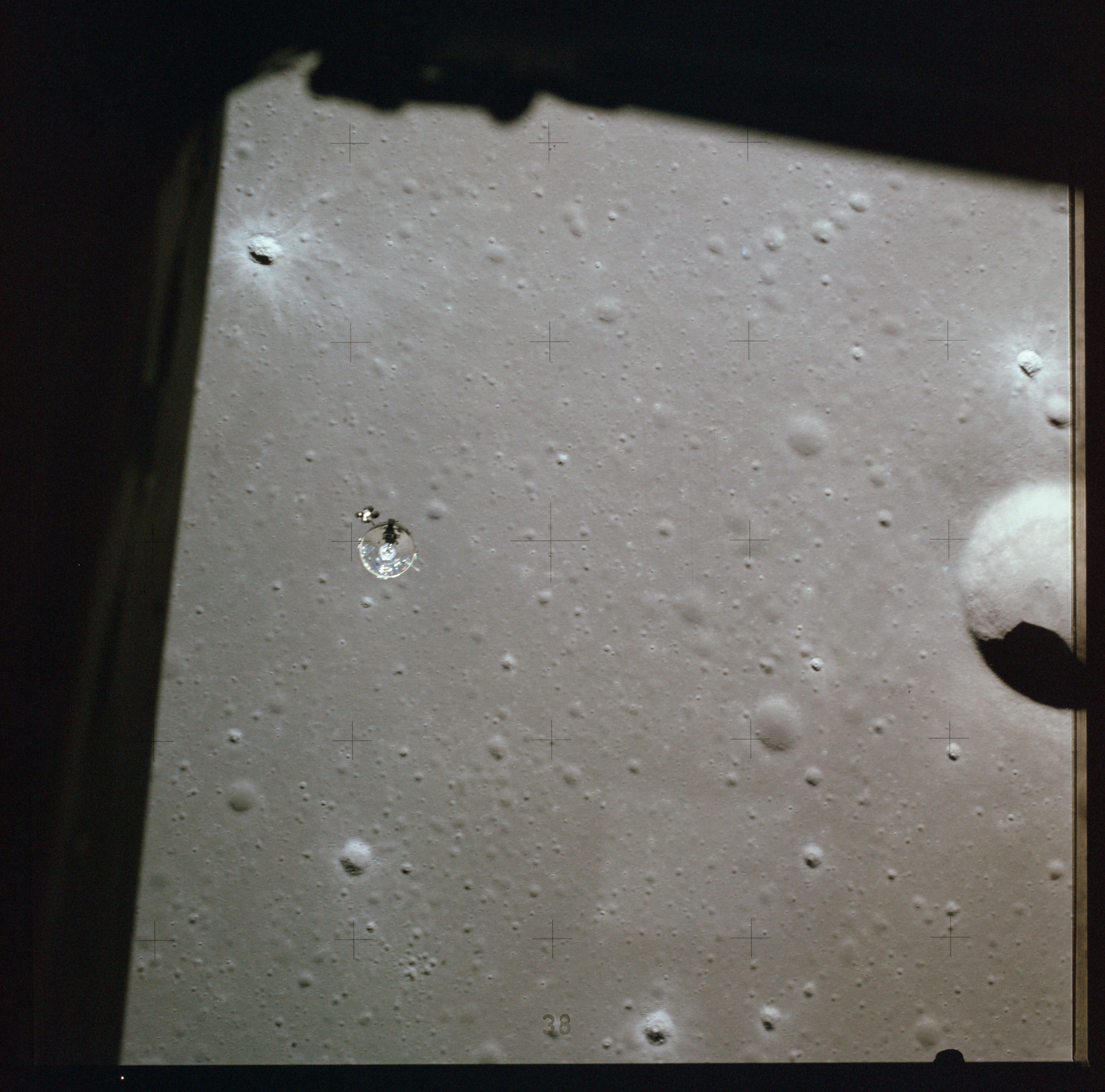 Five photographs are taken from the LM showing Endeavour set against the Moon below. The first two are taken as they pass the eastern shore of Mare Serenitatis.