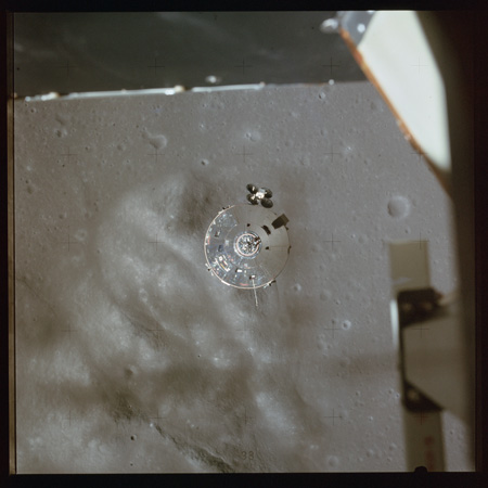 As Al removes his helmet and gloves, Dave and Jim are putting theirs on in preparation for the landing. Aboard both spacecraft, this far-side pass is mostly spent preparing for undocking and separation. Al sets up a Hasselblad and a DAC (Data Acquisition Camera, the small, variable frame-rate Maurer movie camera) for photography of the departing Lunar Module out of window 2 of the Command Module. He carries out a maneuver to trim the attitude of the combined stack with the CSM towards the Moon and the LM away from it. Note that this is only a trim to a maneuver carried out over two hours ago.