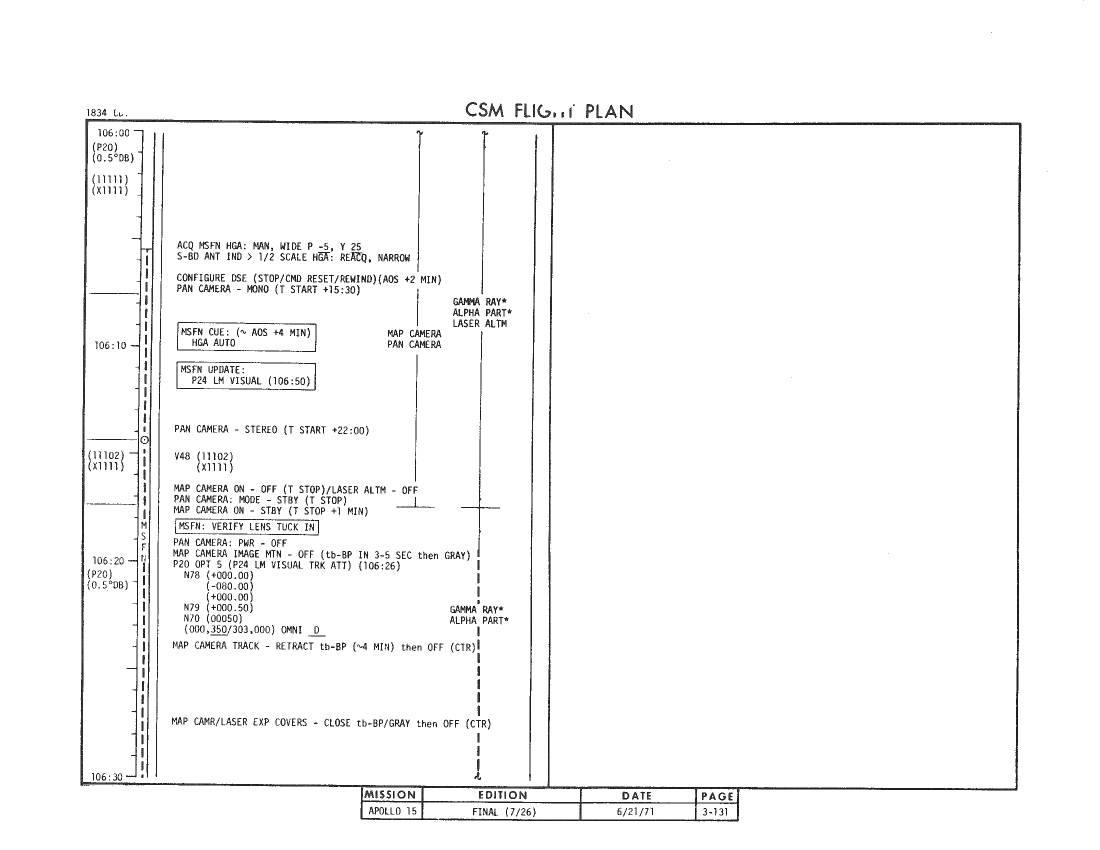 106:08:48 Fullerton: And, Al, when you're ready, I have a P24 PAD, the LM visual, and also a couple of changes to the Flight Plan. Over.