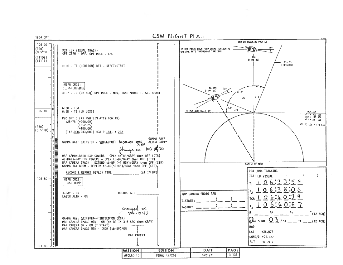 106:09:50 Worden: Roger. Copy. P24 PAD. T-1, starting with the times, T-1, 106:33:59; 38:06; 40:29; 40:57; off-track north, three miles, and use Omni Charlie.