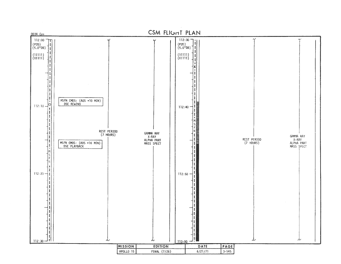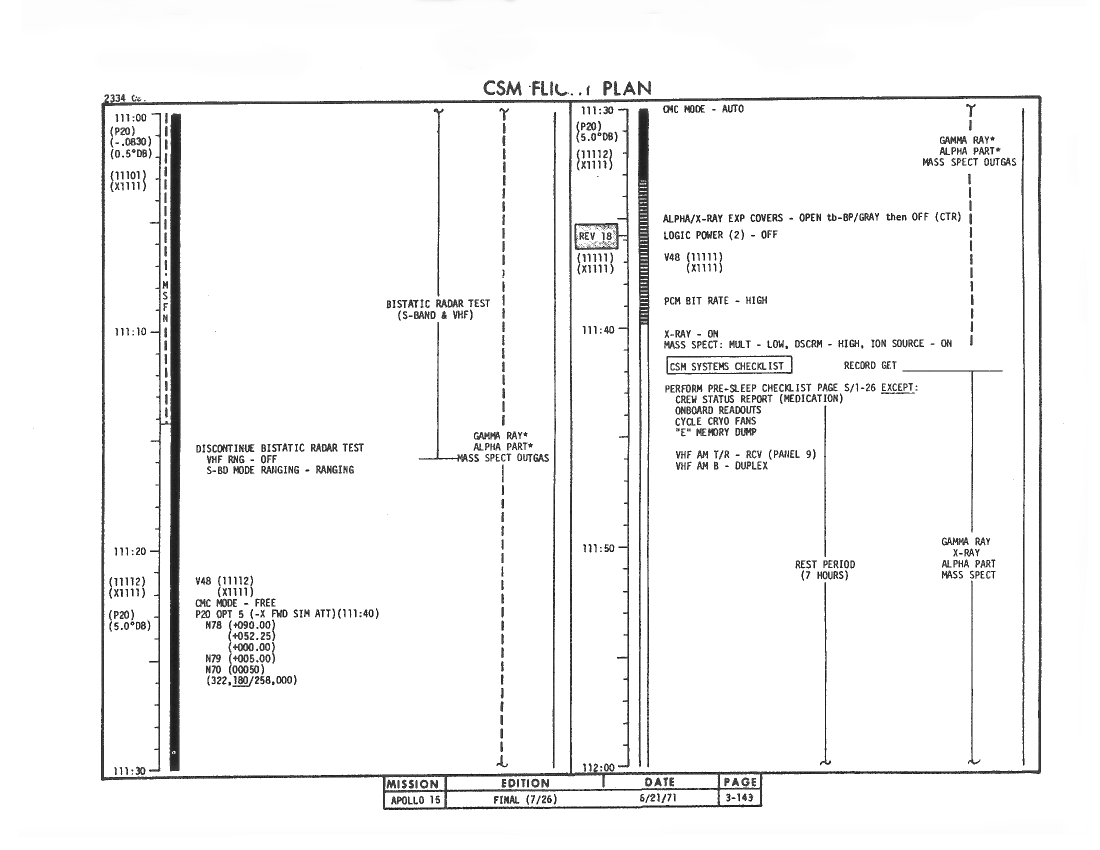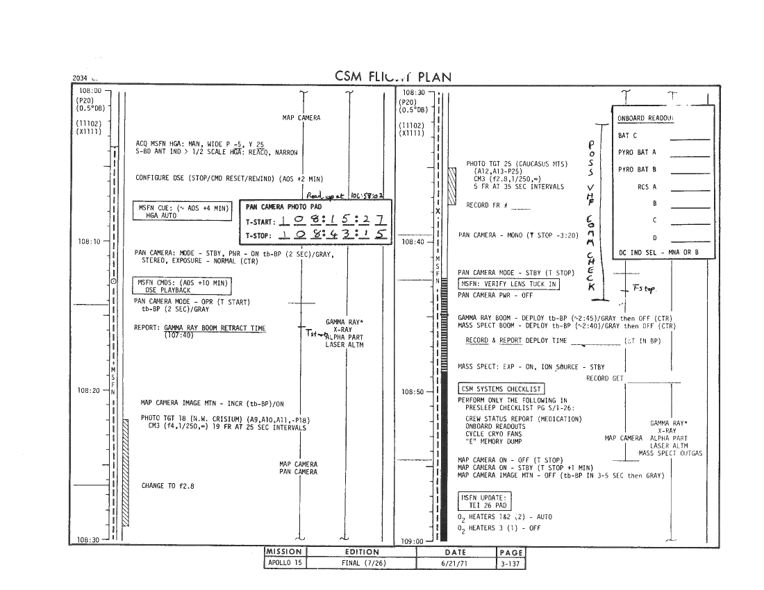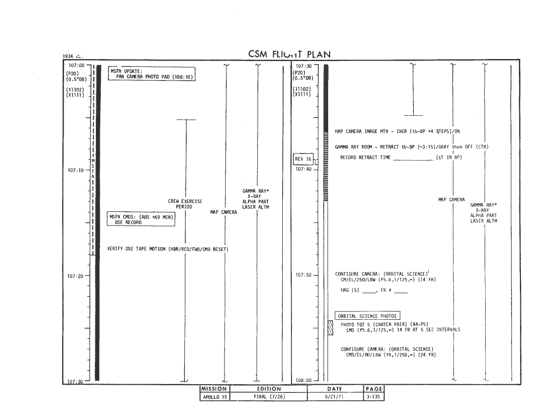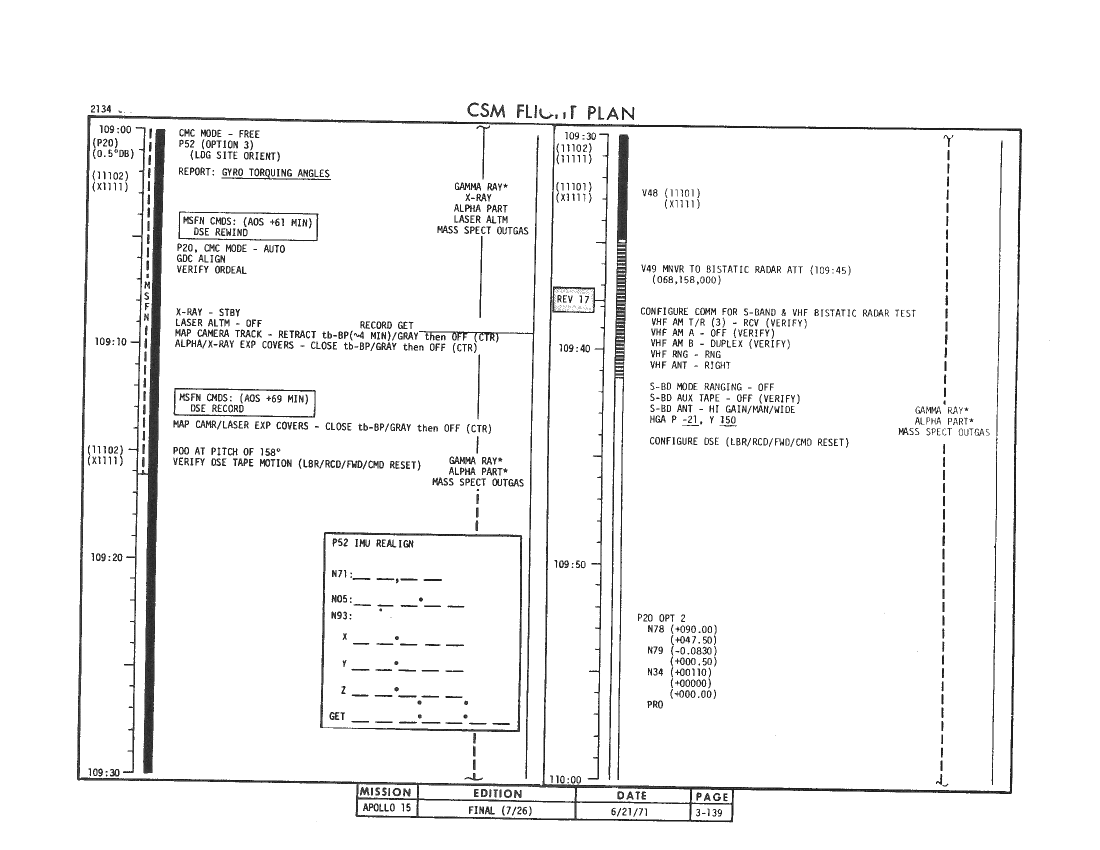109:12:53 Worden: Gordo, I think - Yeah, yeah. I think if you don't expect me to answer, it's a great help to me, because I do find that I'm trying to be three places at once in here; and, if I'm doing a P52, I can't be over working the - the SIM bay at the same time. So the reminder is good. I can always break into a P52 to go turn something off, but bearing in mind that I don't have a mission timer in - in the Lower Equipment Bay, it's a little difficult for me to keep track of the time sometimes, so I do appreciate it.