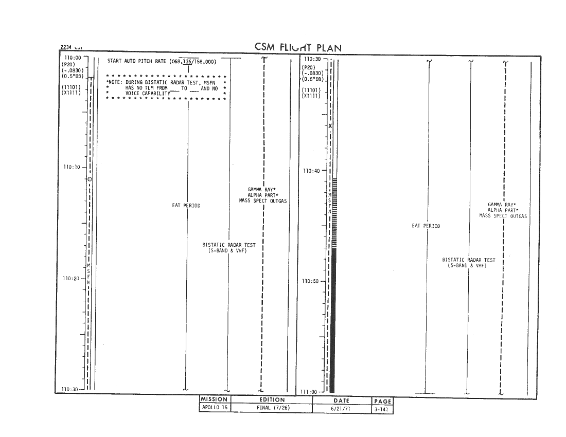 This is Apollo Control at 110 hours, 26 minutes. The Endeavour is in its 17th revolution now, and we have acquisition. We have not talked to Al Worden however. [We are] conducting a Bistatic Radar Test during this pass and they desired not to have voice communications during this test. Worden should be having his evening meal now as scheduled in the Flight Plan. He will be in a rest period on the next revolution, so we do not plan to talk to him again. All systems on the Endeavour look good on the 17th revolution.