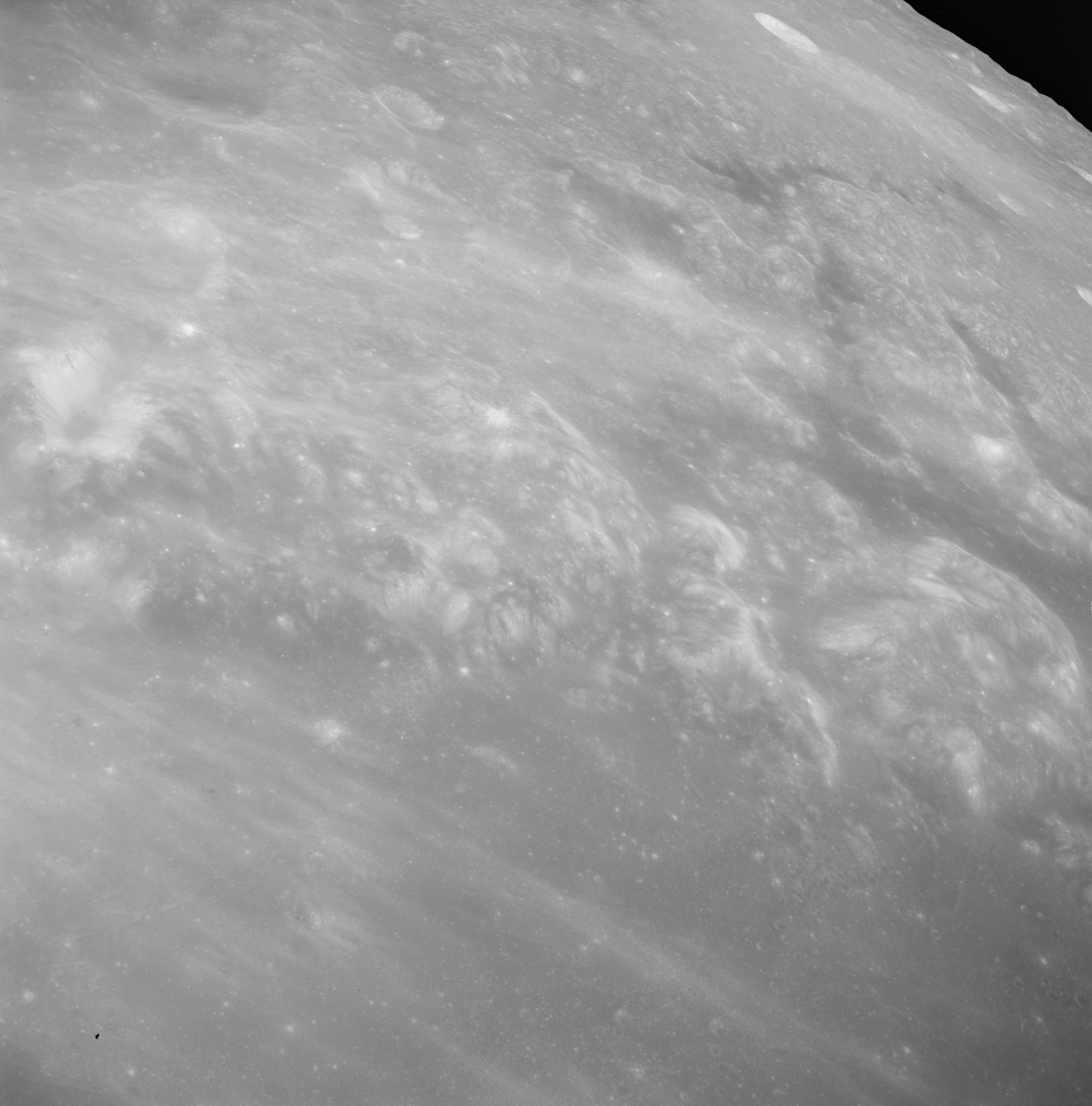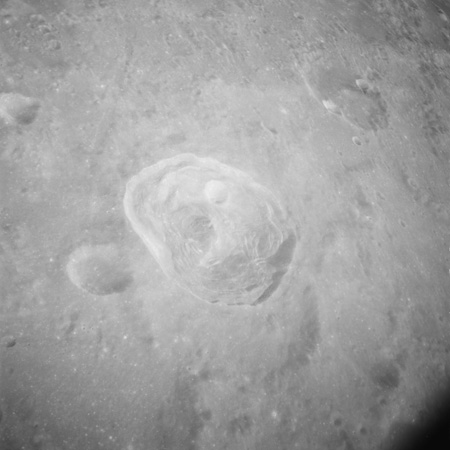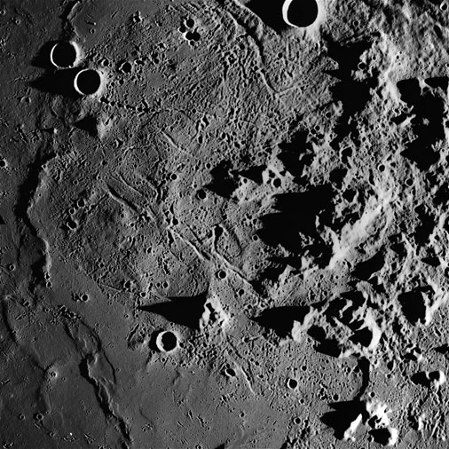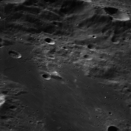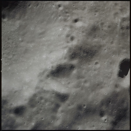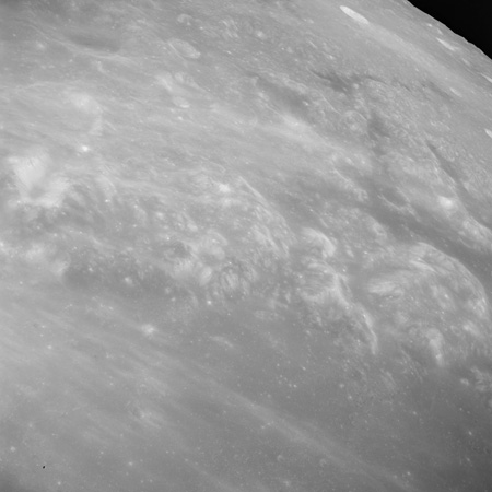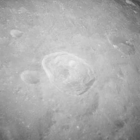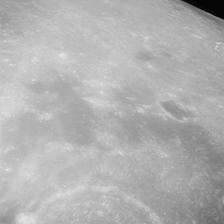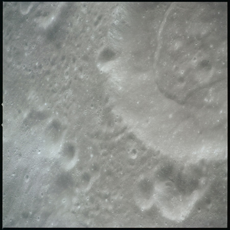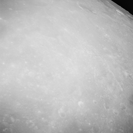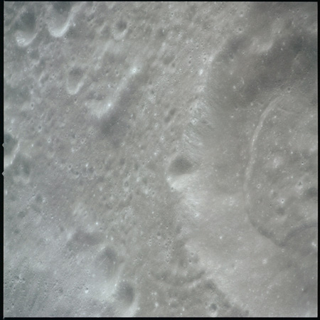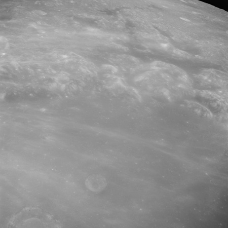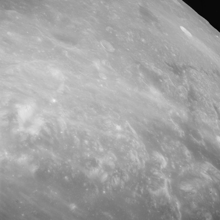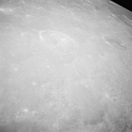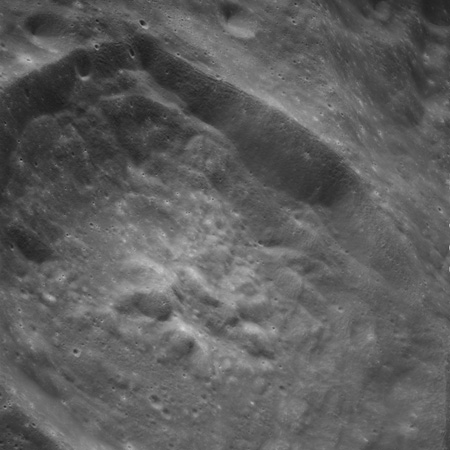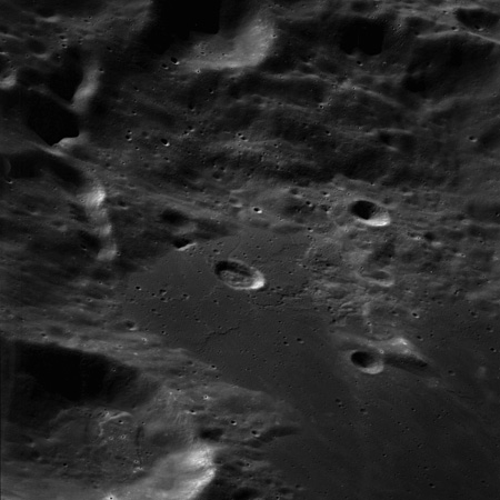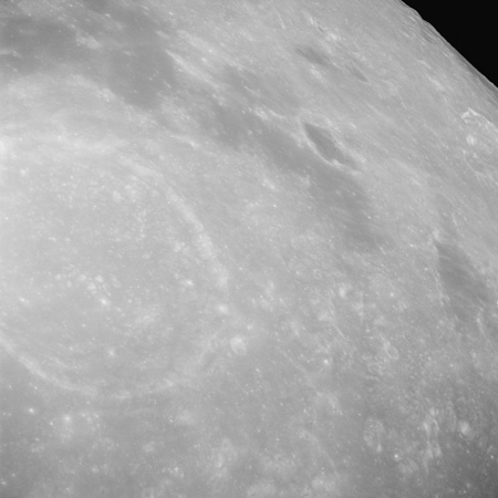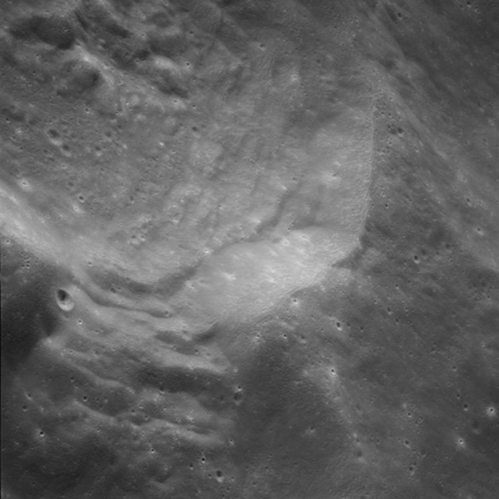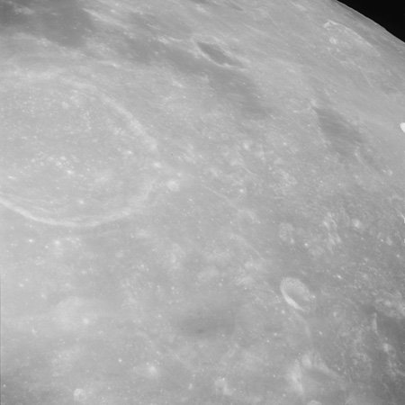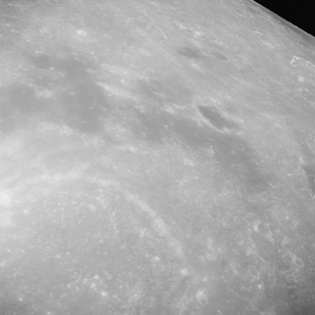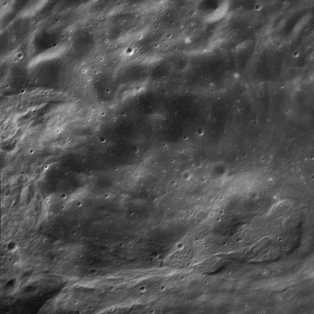Of particular note in the last four images is the radial "sculpture"; evidence of the outrushing sheet of ejecta from the impact which carved long furrows in the ground. These are smaller scale examples of similar landforms seen around the Imbrium basin on the front side, particularly around Mare Vaporum, which are traces of the tremendous effect the formation of the Imbrium Basin had on the Moon's surface. The correct interpretation of the origin of sculpture would prove to be crucial to understanding the history of the Moon's features. For vertical context, this is a more recent image from the Lunar Reconnaissance Orbiter.