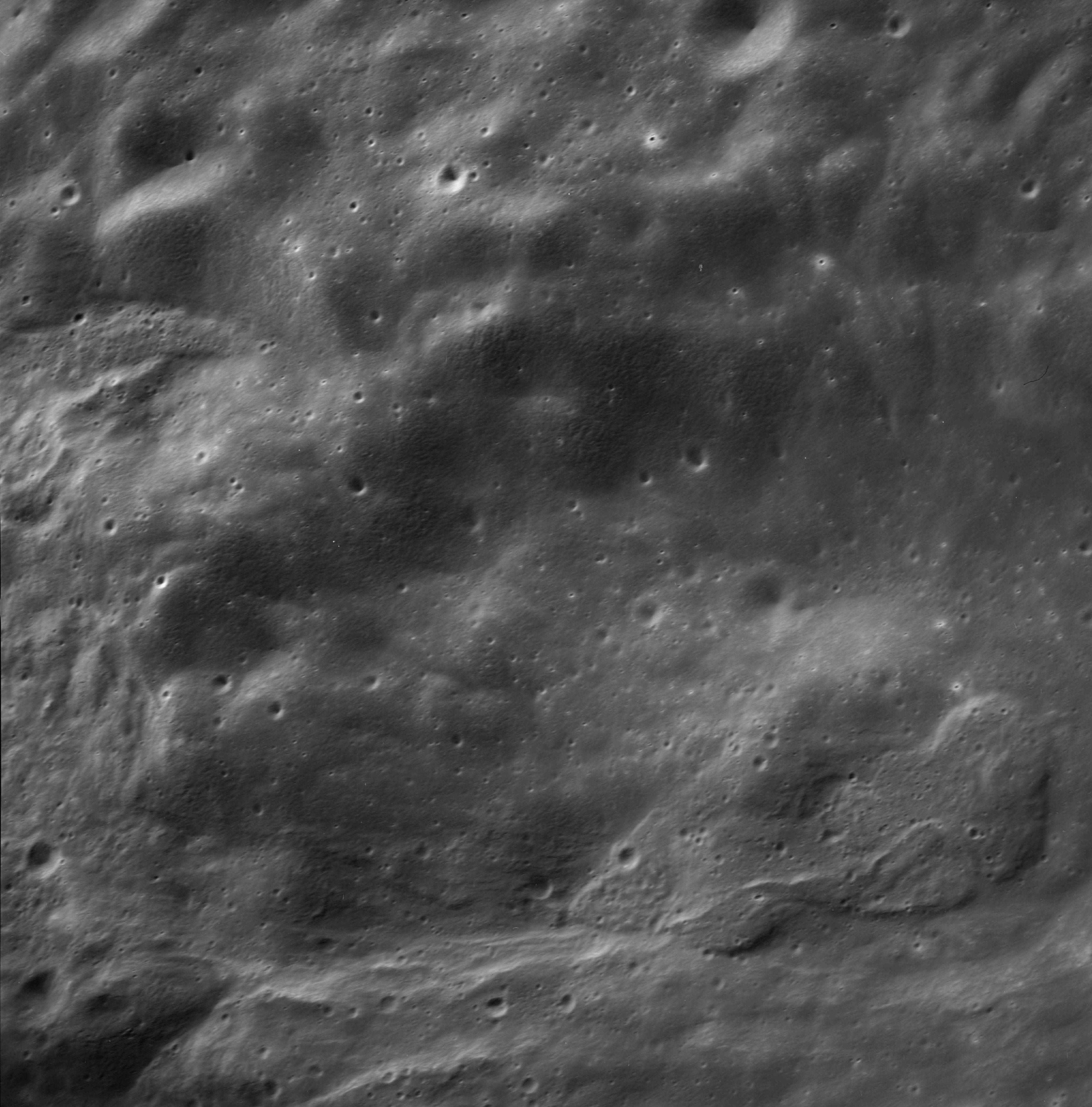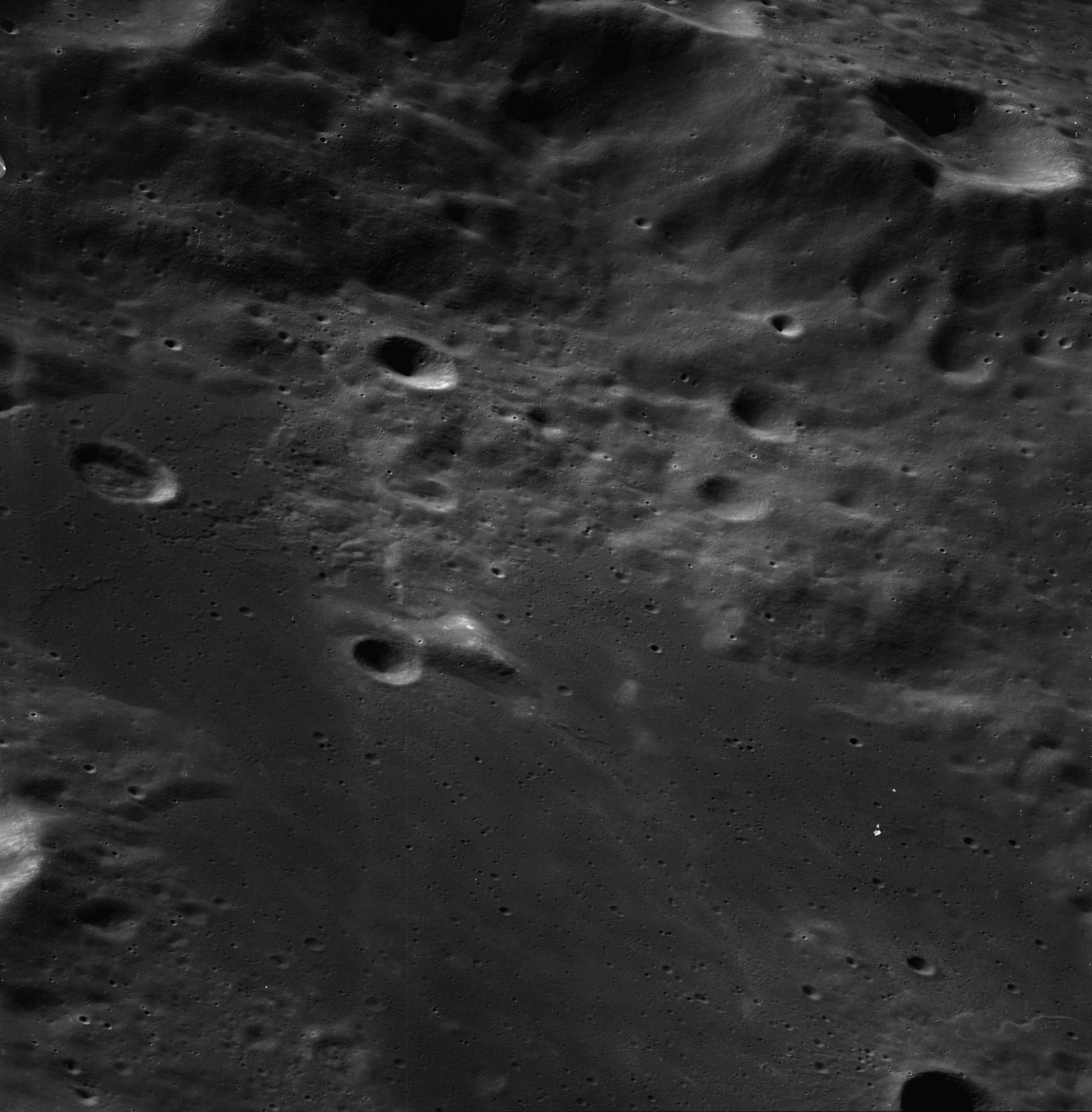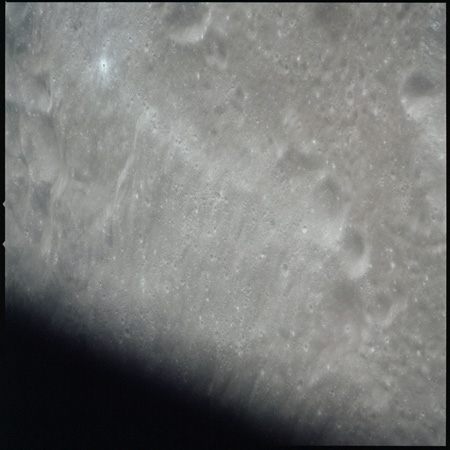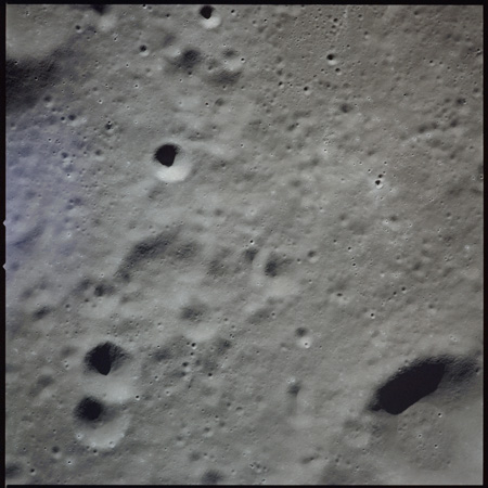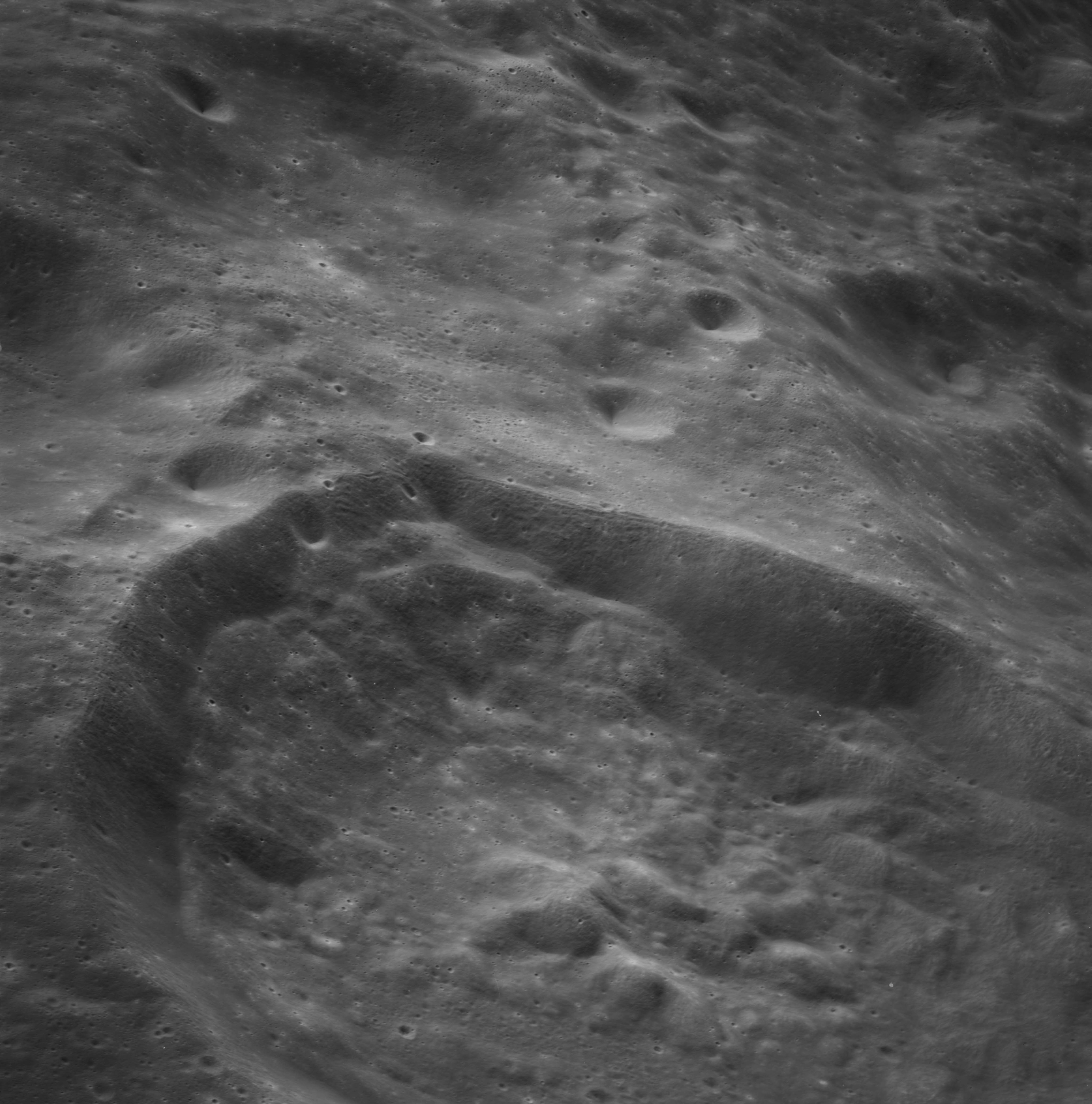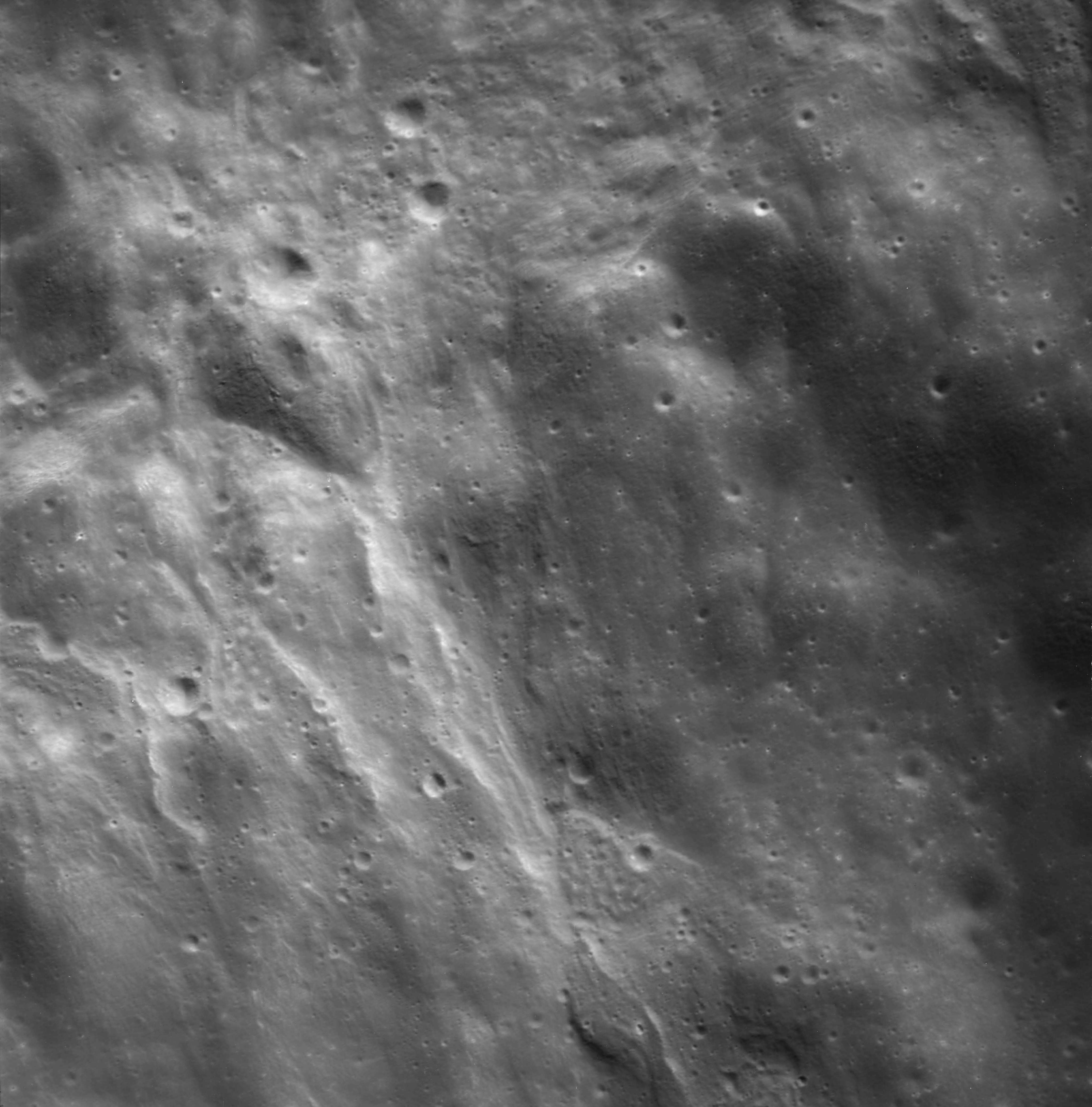 Of particular note in the last four images is the radial "sculpture"; evidence of the outrushing sheet of ejecta from the impact which carved long furrows in the ground. These are smaller scale examples of similar landforms seen around the Imbrium basin on the front side, particularly around Mare Vaporum, which are traces of the tremendous effect the formation of the Imbrium Basin had on the Moon's surface. The correct interpretation of the origin of sculpture would prove to be crucial to understanding the history of the Moon's features. For vertical context, this is a more recent image from the Lunar Reconnaissance Orbiter.