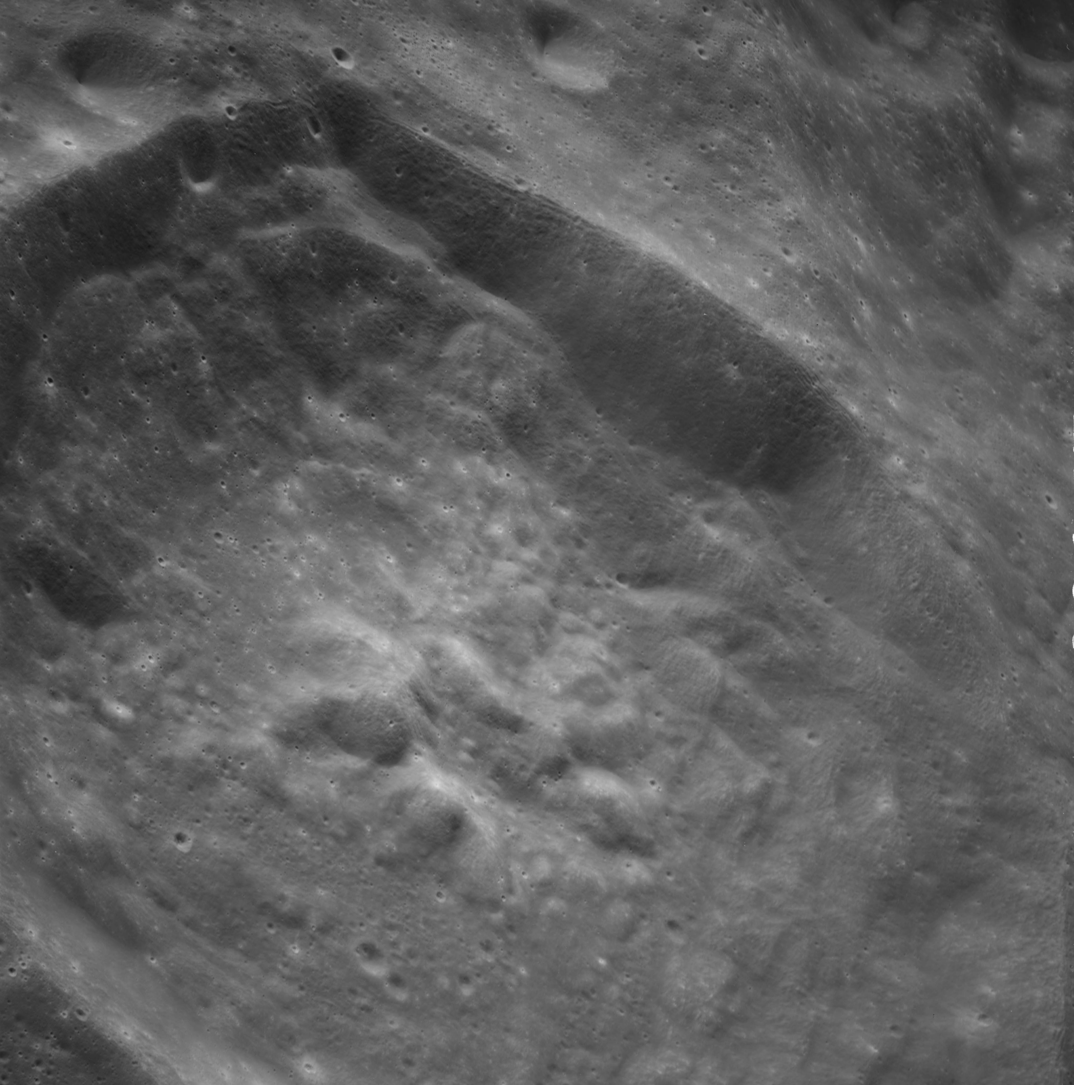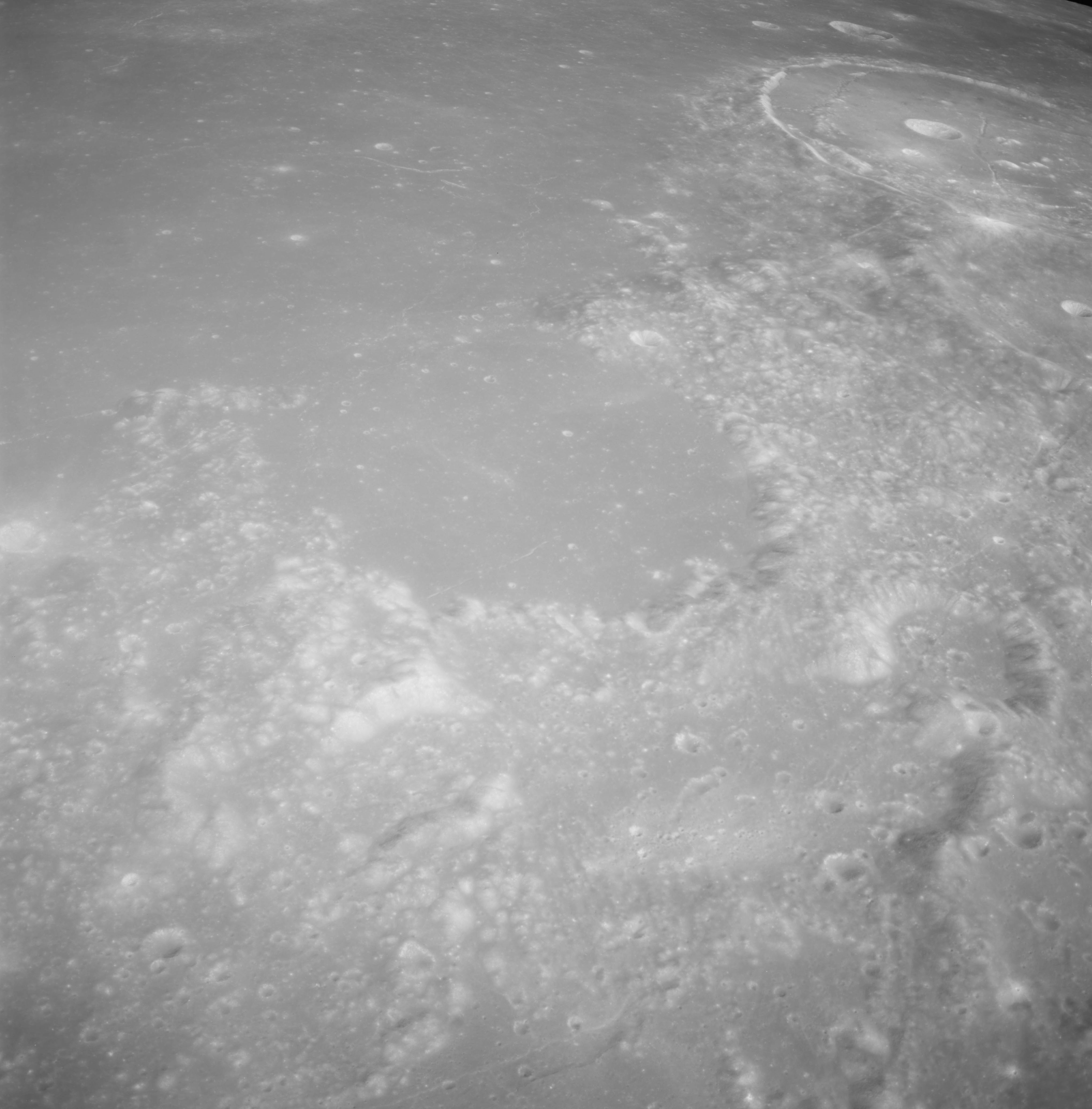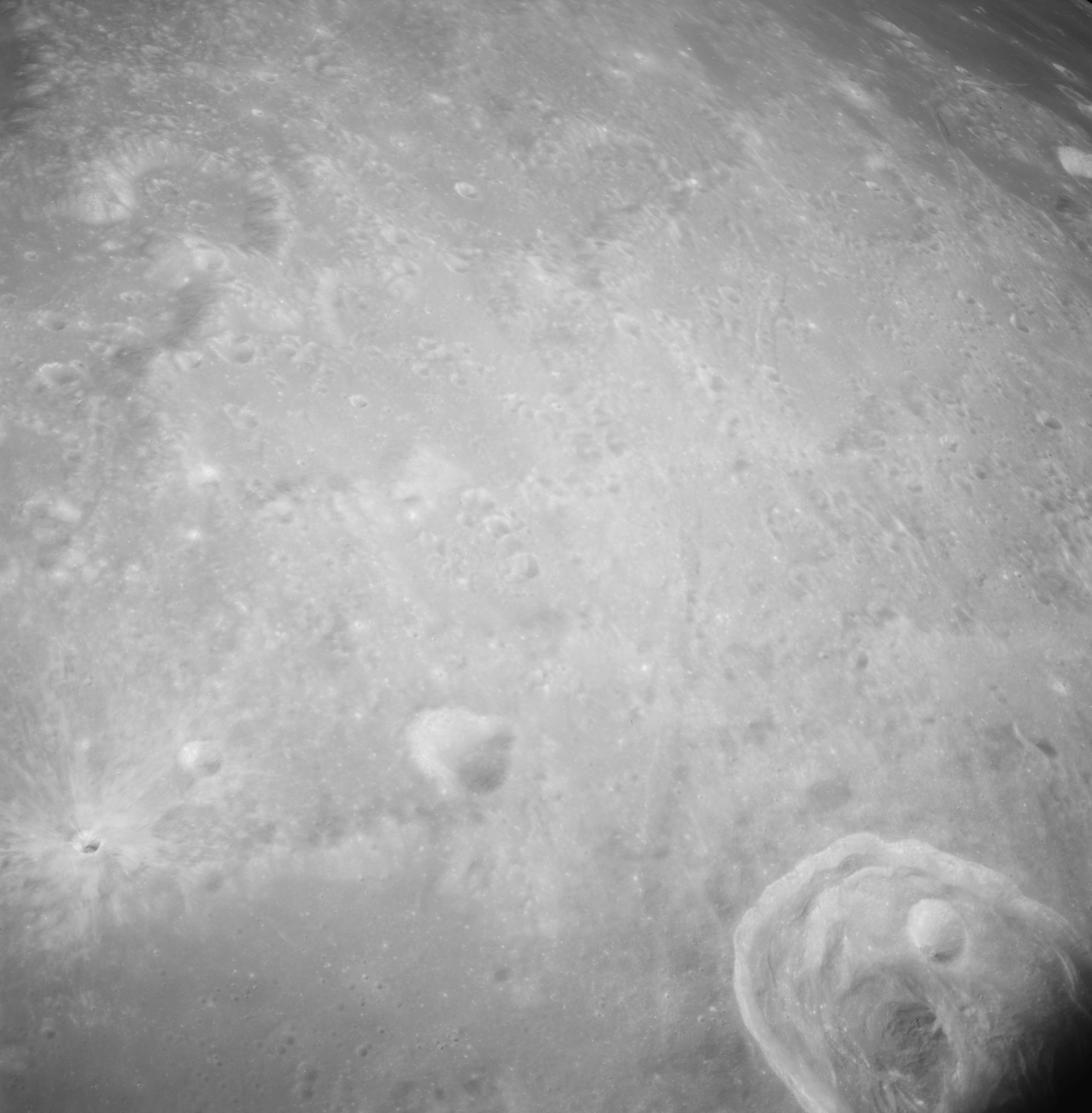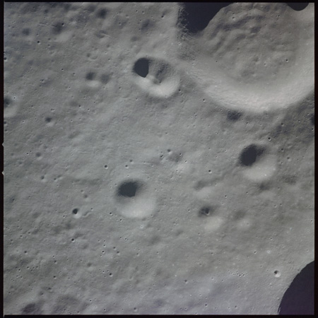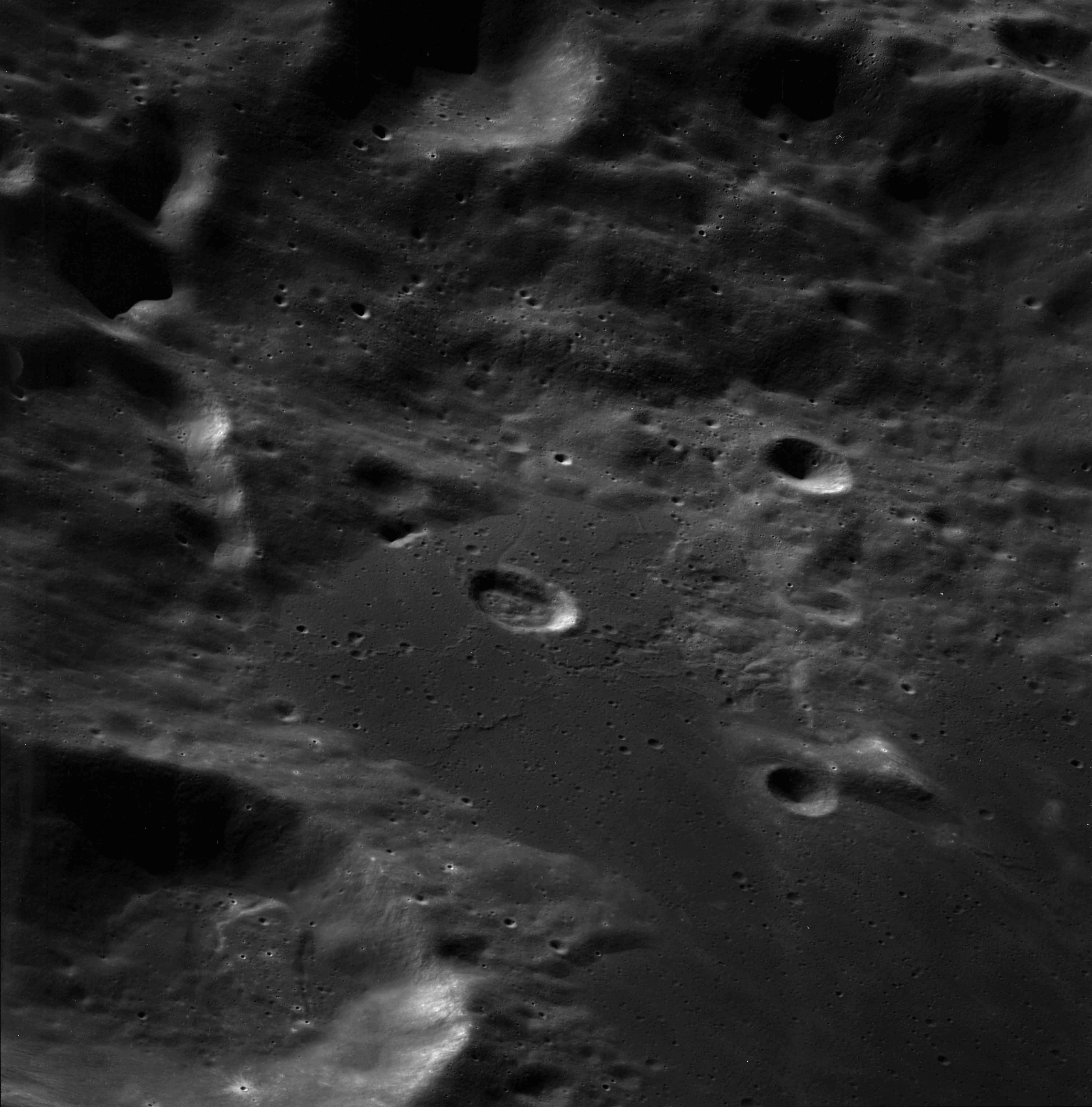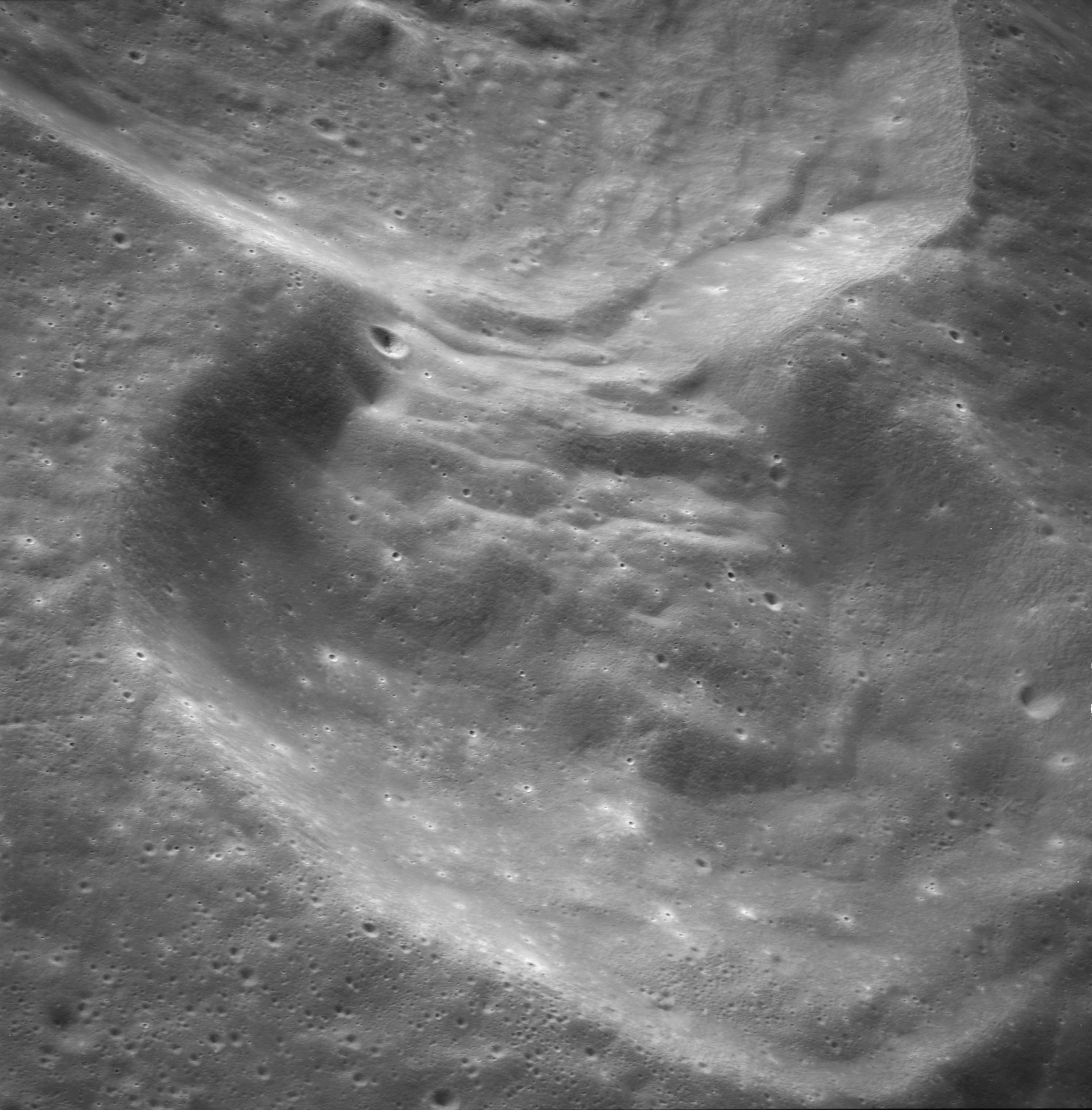 Of particular note in the last four images is the radial "sculpture"; evidence of the outrushing sheet of ejecta from the impact which carved long furrows in the ground. These are smaller scale examples of similar landforms seen around the Imbrium basin on the front side, particularly around Mare Vaporum, which are traces of the tremendous effect the formation of the Imbrium Basin had on the Moon's surface. The correct interpretation of the origin of sculpture would prove to be crucial to understanding the history of the Moon's features. For vertical context, this is a more recent image from the Lunar Reconnaissance Orbiter.