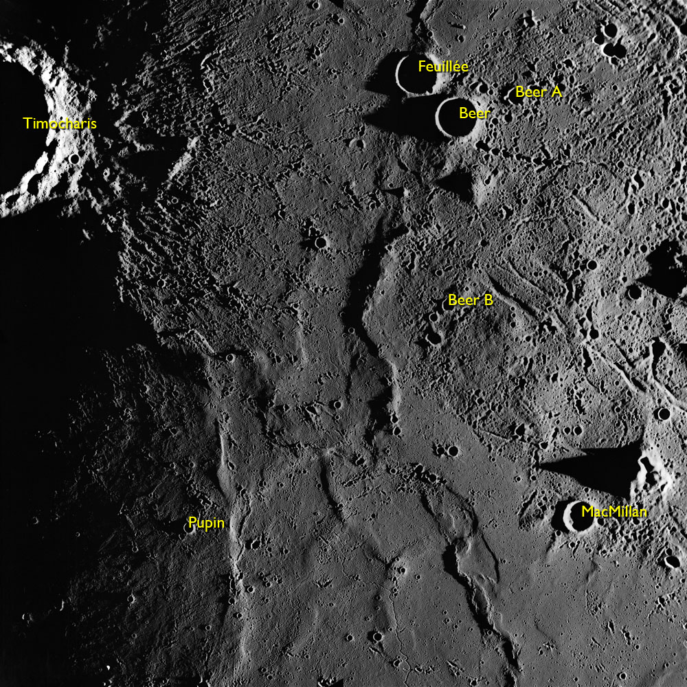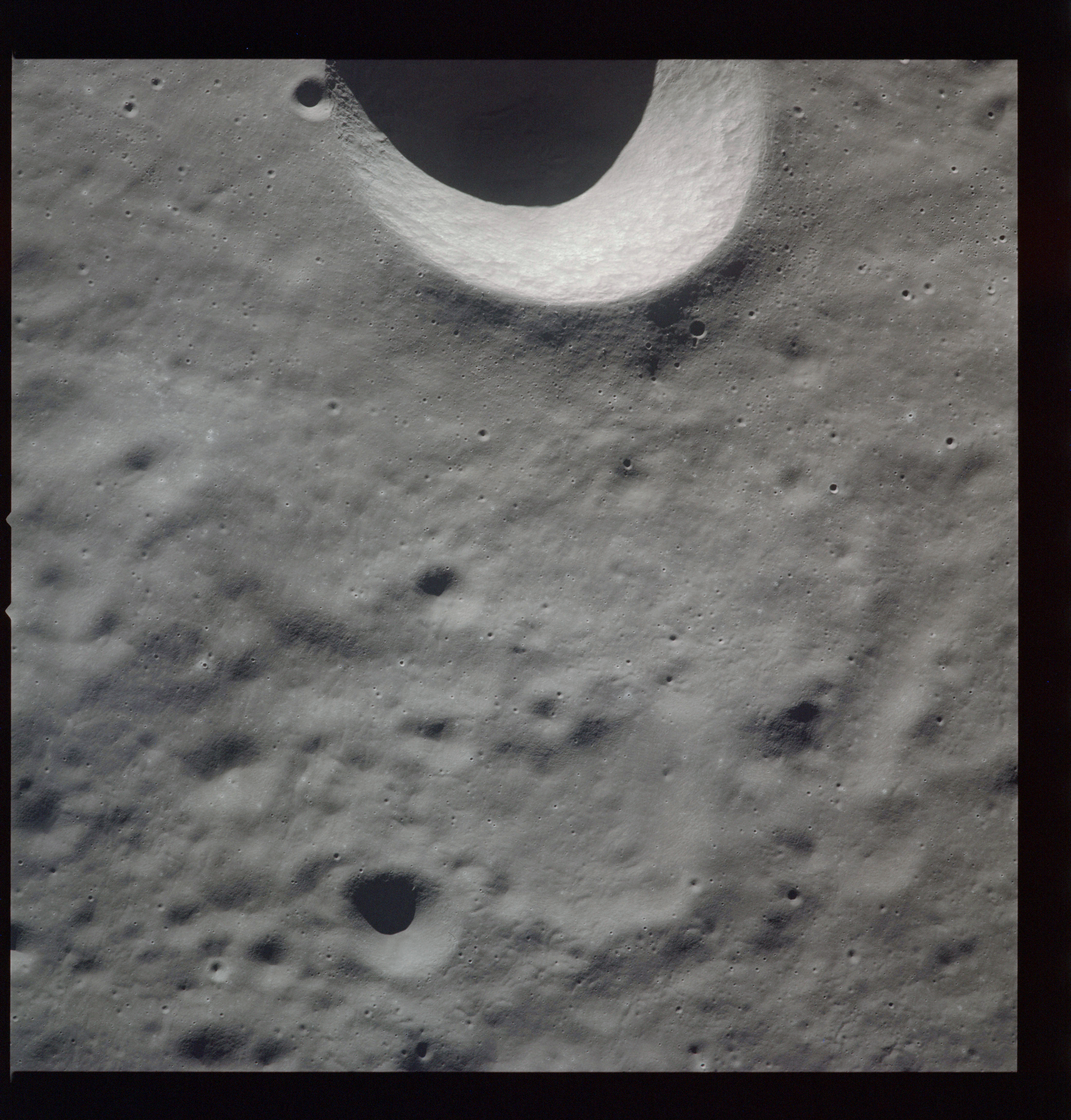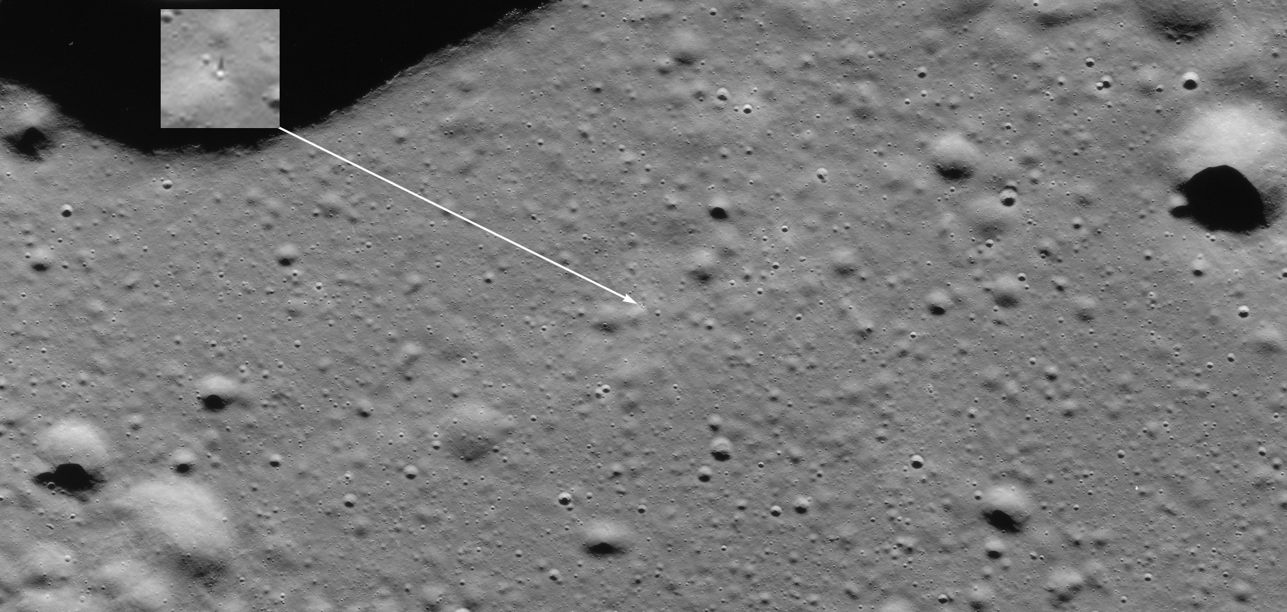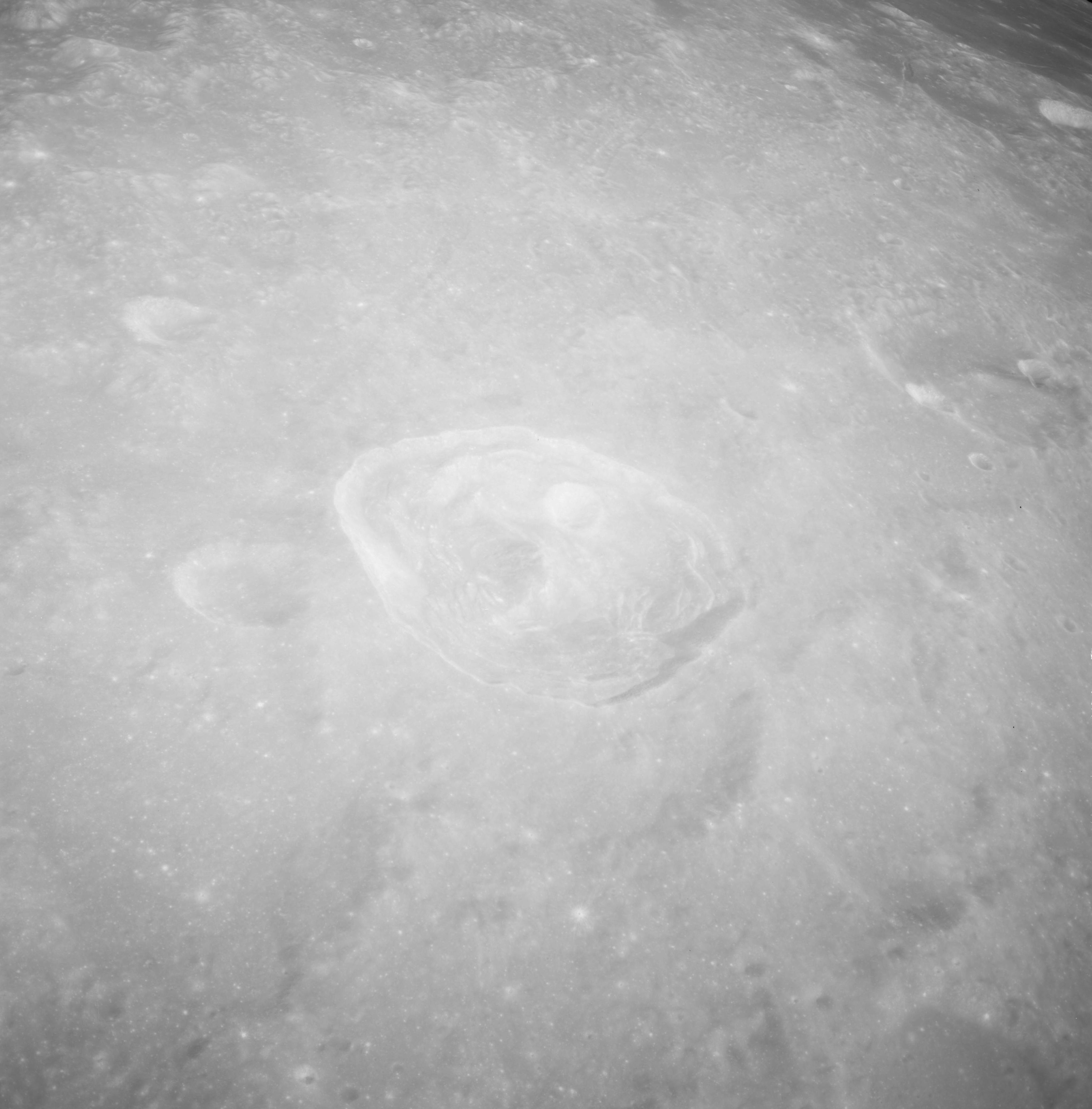 Of particular note in the last four images is the radial "sculpture"; evidence of the outrushing sheet of ejecta from the impact which carved long furrows in the ground. These are smaller scale examples of similar landforms seen around the Imbrium basin on the front side, particularly around Mare Vaporum, which are traces of the tremendous effect the formation of the Imbrium Basin had on the Moon's surface. The correct interpretation of the origin of sculpture would prove to be crucial to understanding the history of the Moon's features. For vertical context, this is a more recent image from the Lunar Reconnaissance Orbiter.