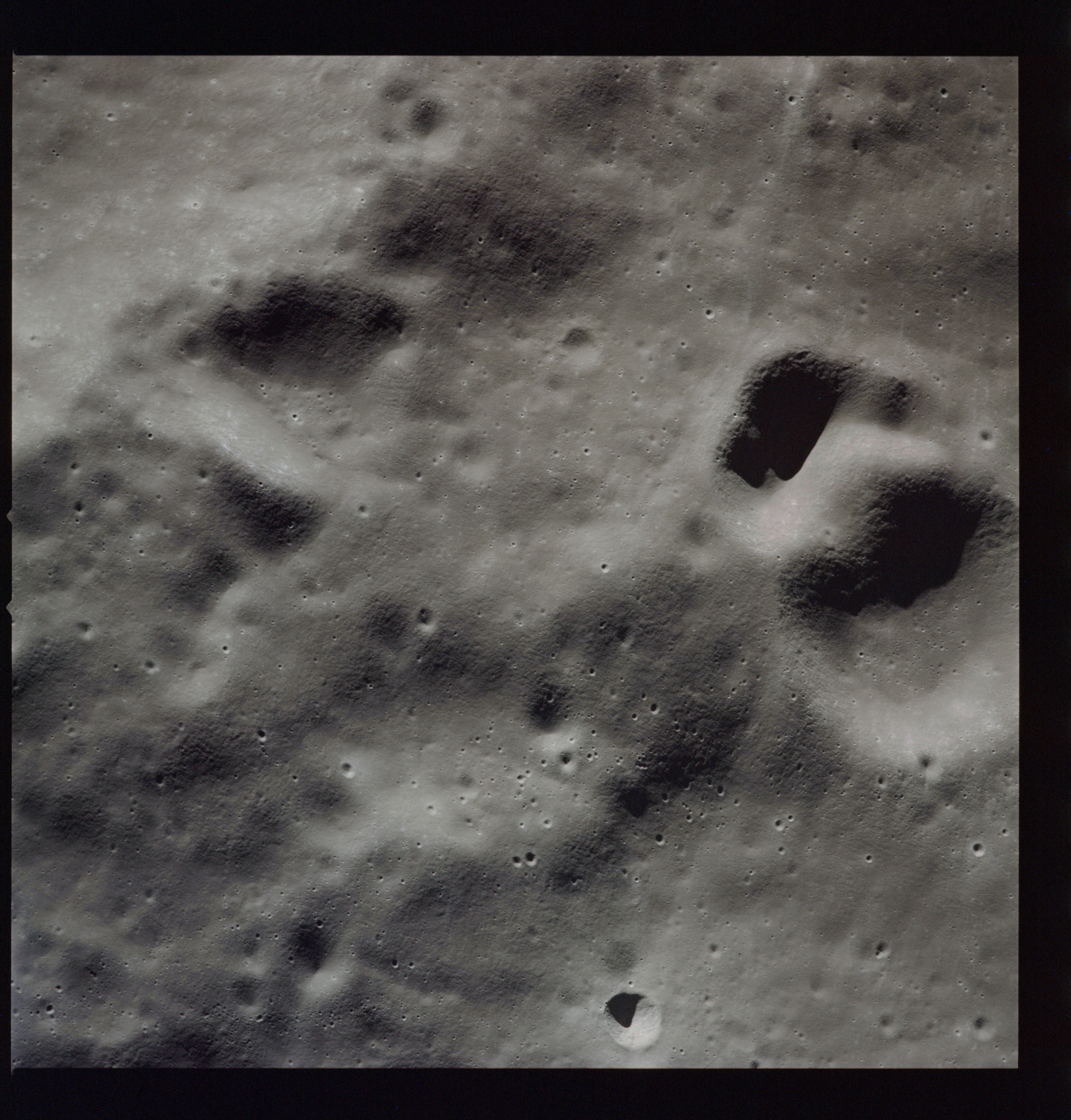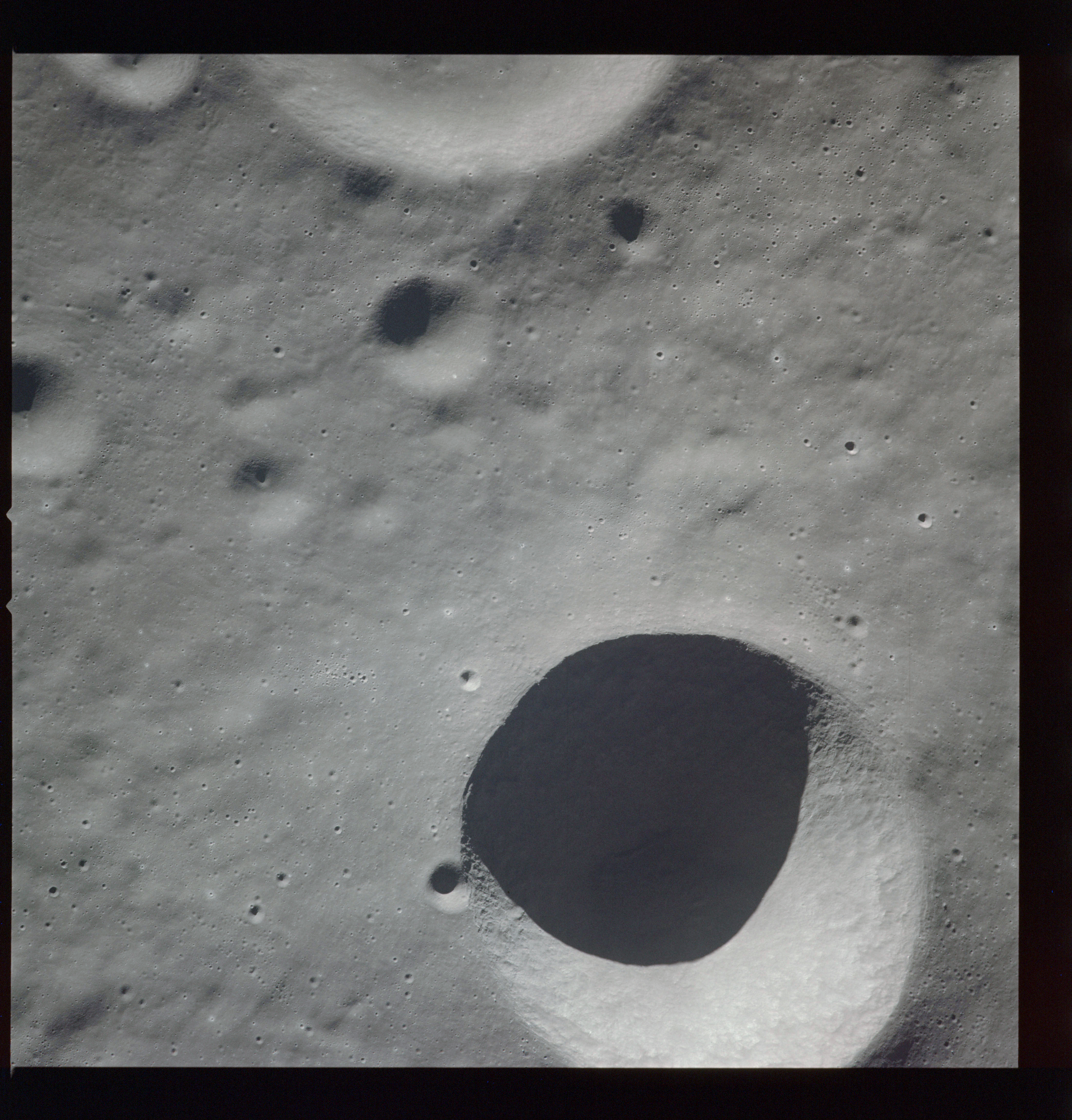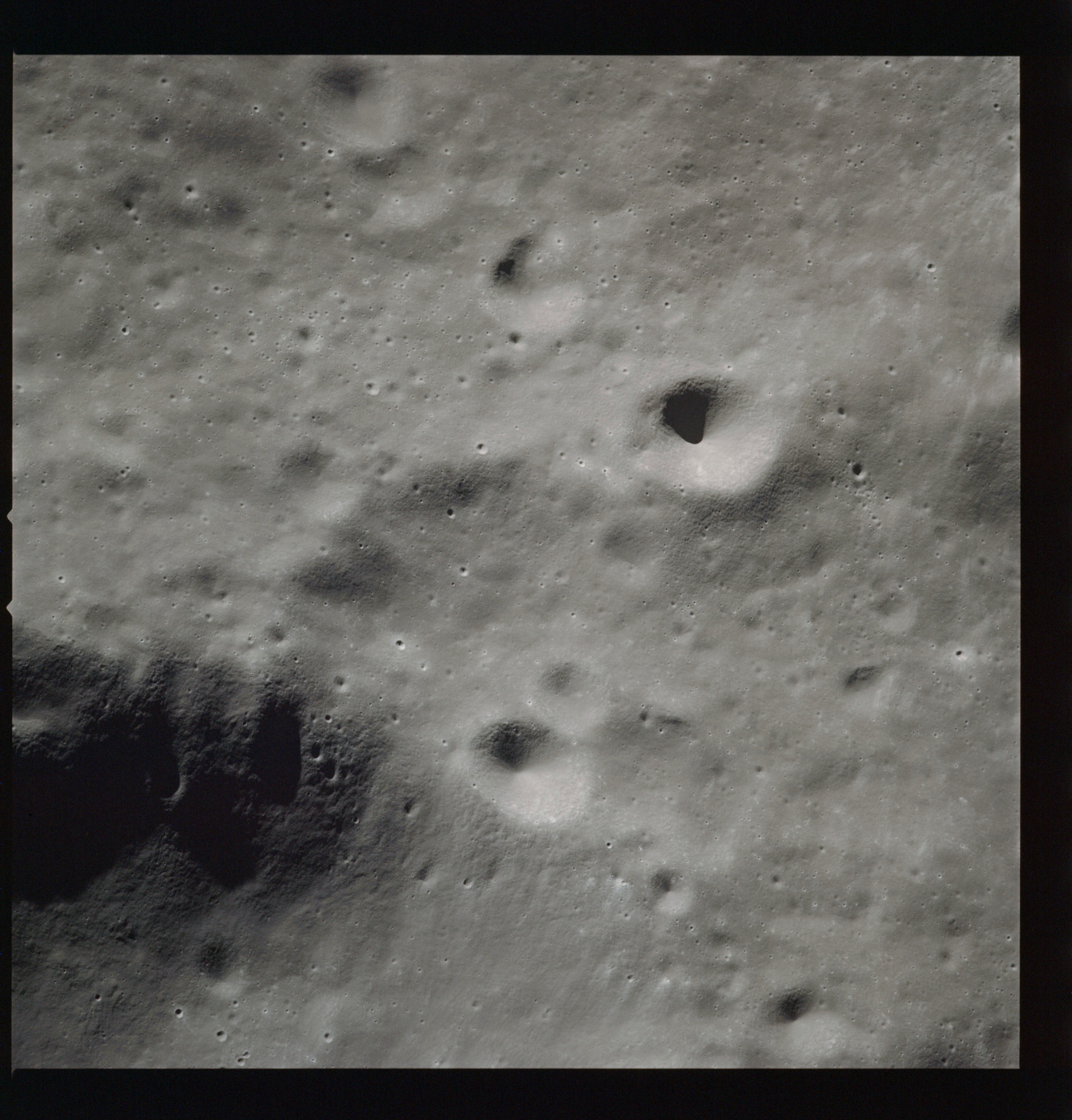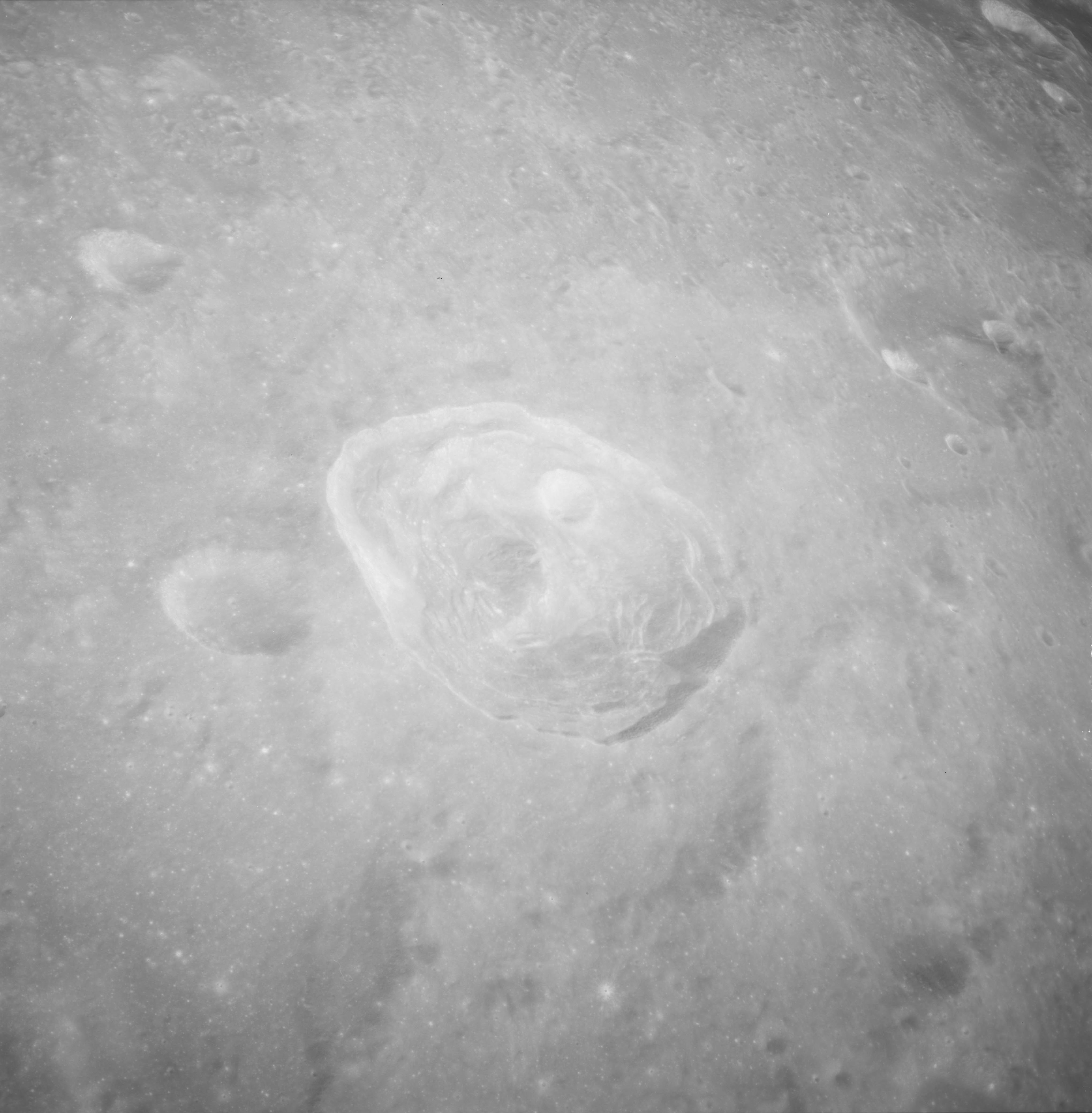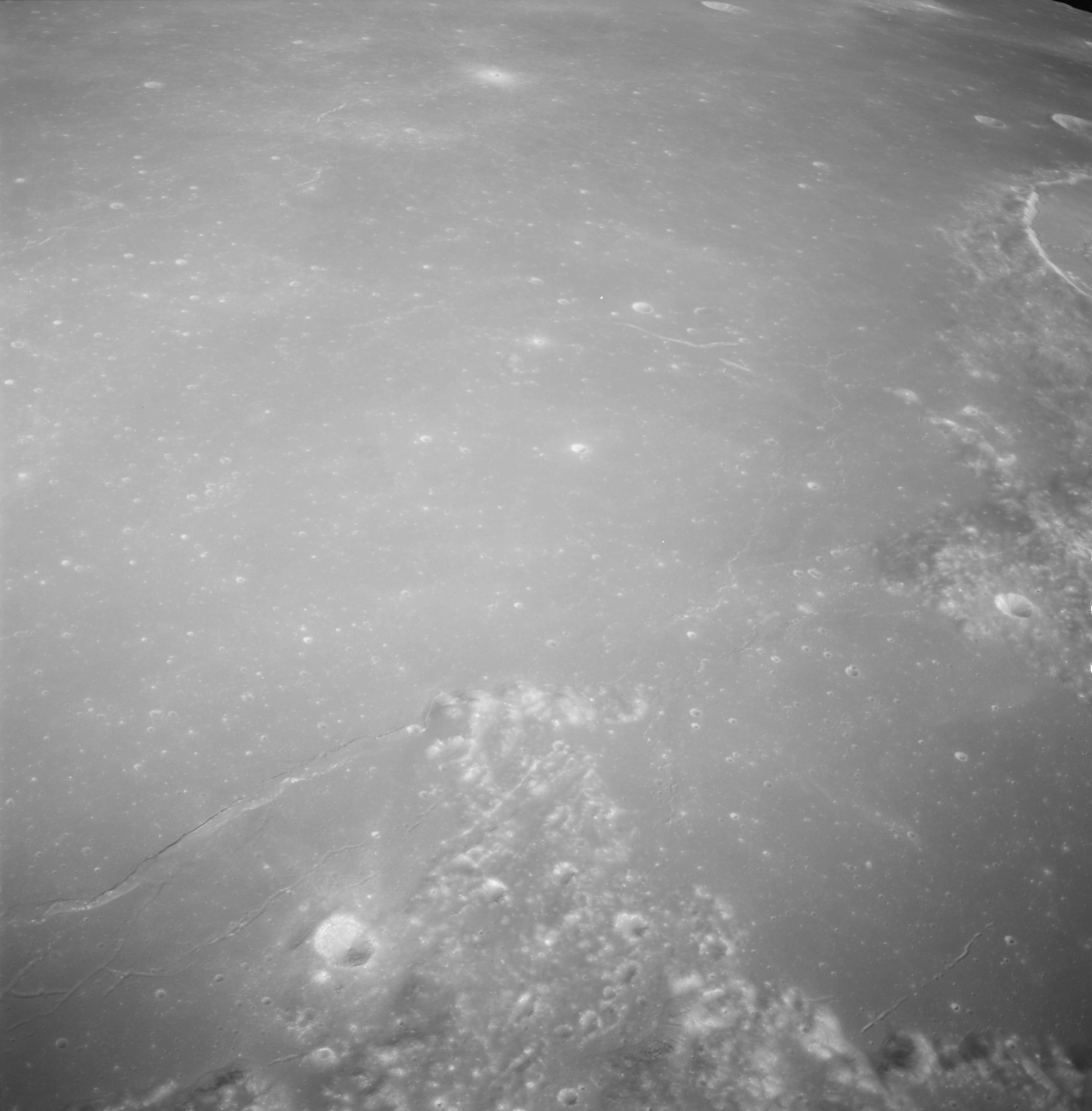 Of particular note in the last four images is the radial "sculpture"; evidence of the outrushing sheet of ejecta from the impact which carved long furrows in the ground. These are smaller scale examples of similar landforms seen around the Imbrium basin on the front side, particularly around Mare Vaporum, which are traces of the tremendous effect the formation of the Imbrium Basin had on the Moon's surface. The correct interpretation of the origin of sculpture would prove to be crucial to understanding the history of the Moon's features. For vertical context, this is a more recent image from the Lunar Reconnaissance Orbiter.